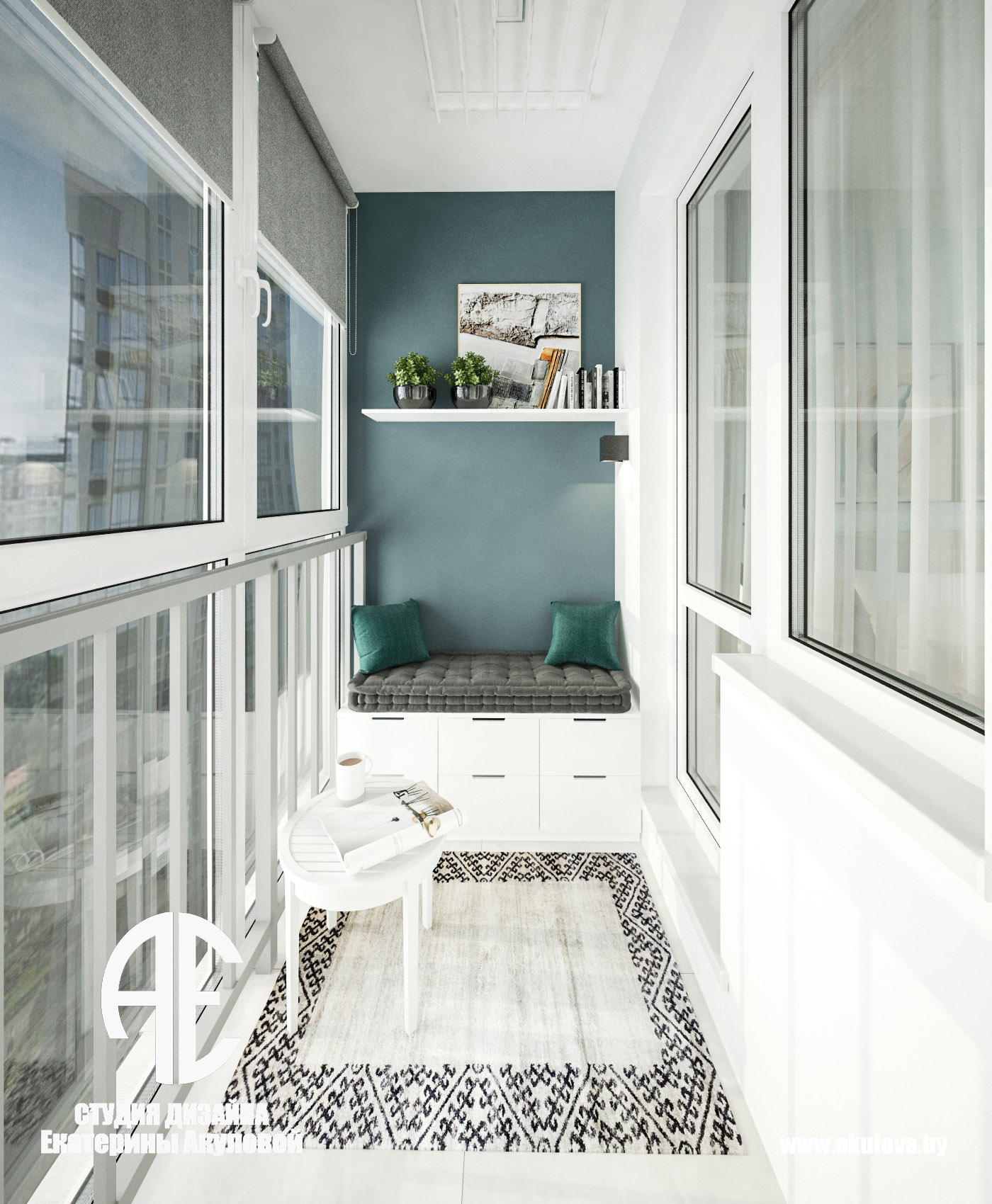 Современный интерьер решили в серой цветовой гамме с вкраплениями темно-елового цвета. Главным акцентом апартаментов (в гостиной-кухне) выступает успокаивающий цвет фасадов кухни (темно-еловый), которой задают настроение всему интерьеру. Спальня не перегружена отвлекающими внимание деталями, и взгляд может задержаться на пейзаже за окном. Цветовая гамма – самые комфортные для жизни, по словам психологов, светло-серый и нежно-мятный цвет. В серых тонах решена ванная комната и санузел.