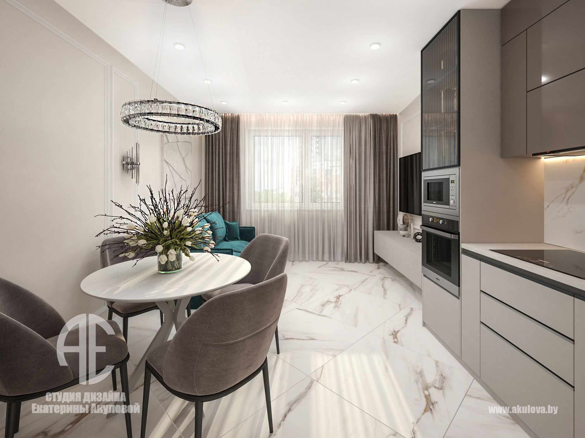 Дизайн интерьера для семьи с ребенком разрабатывался в современном стиле в светло-пастельной гамме с неявным контрастом. Гостиная, совмещенная с кухней, является в квартире многофункциональной зоной для отдыха, общения в кругу семьи, приему гостей. В ее гамме спокойный цвет какао, который преображает данное пространство. Немаловажный момент в преображении интерьера – это правильно подобранные акценты в мебели, шторах, декоре.