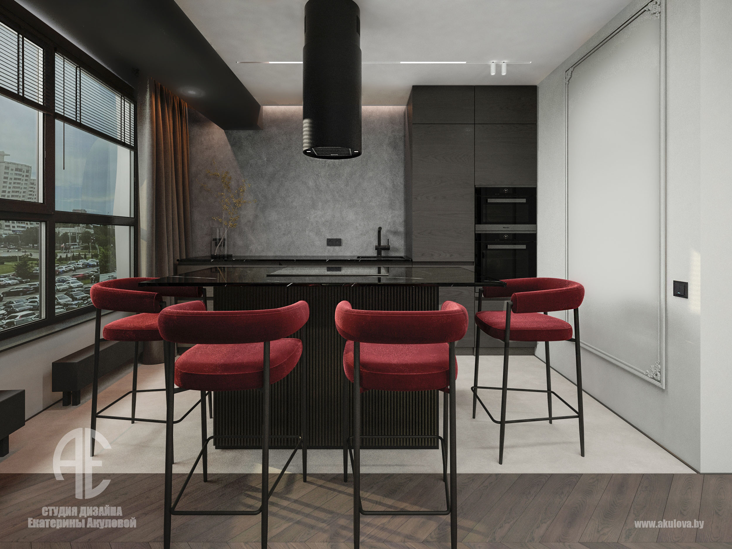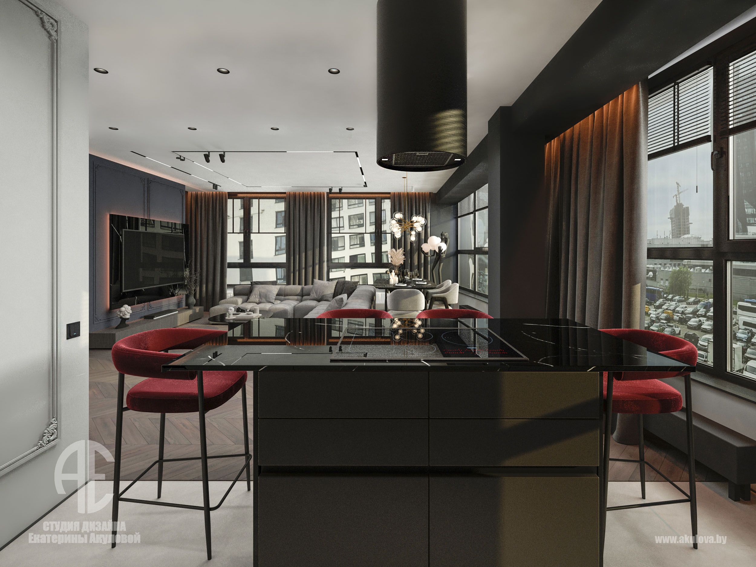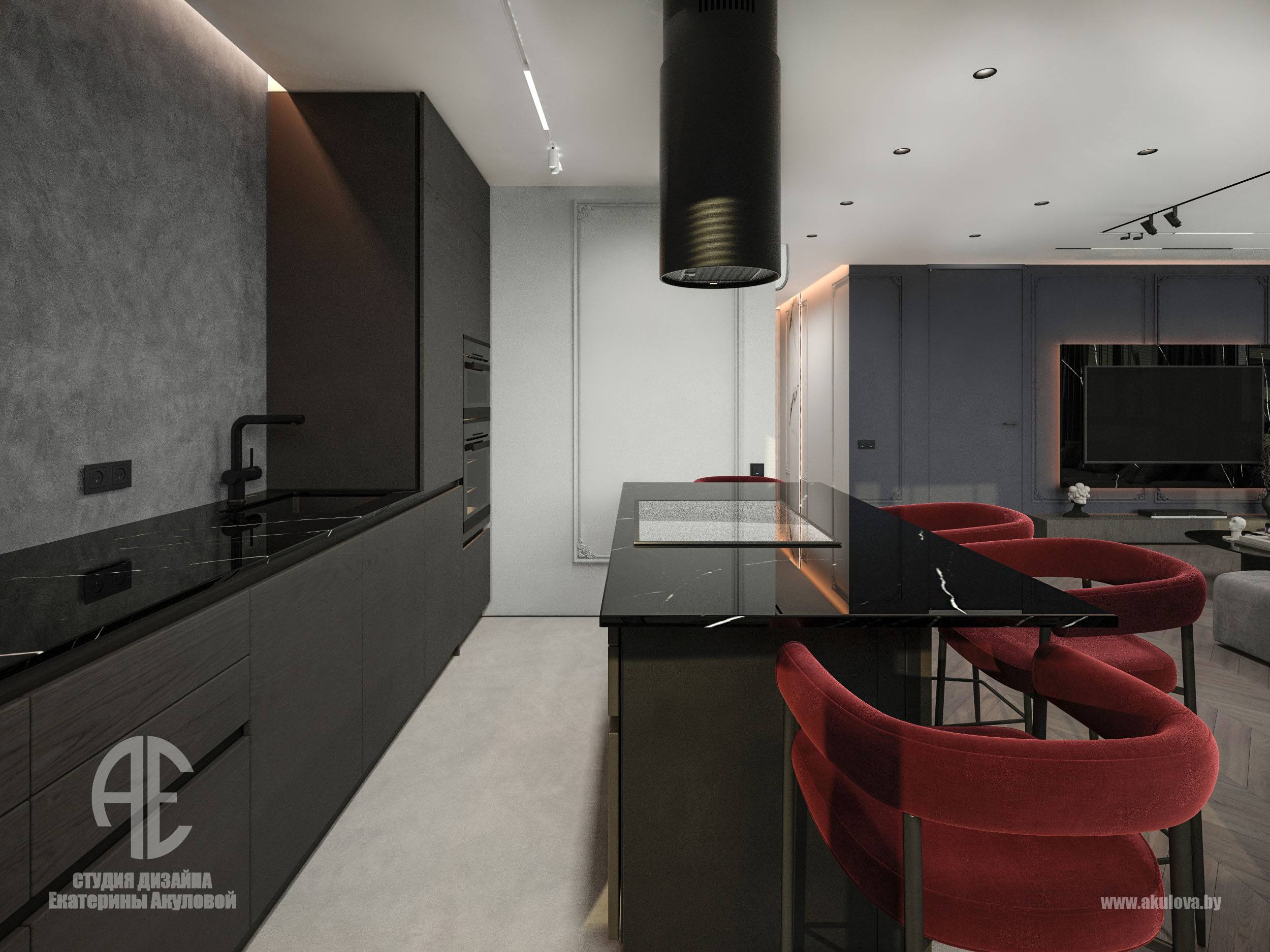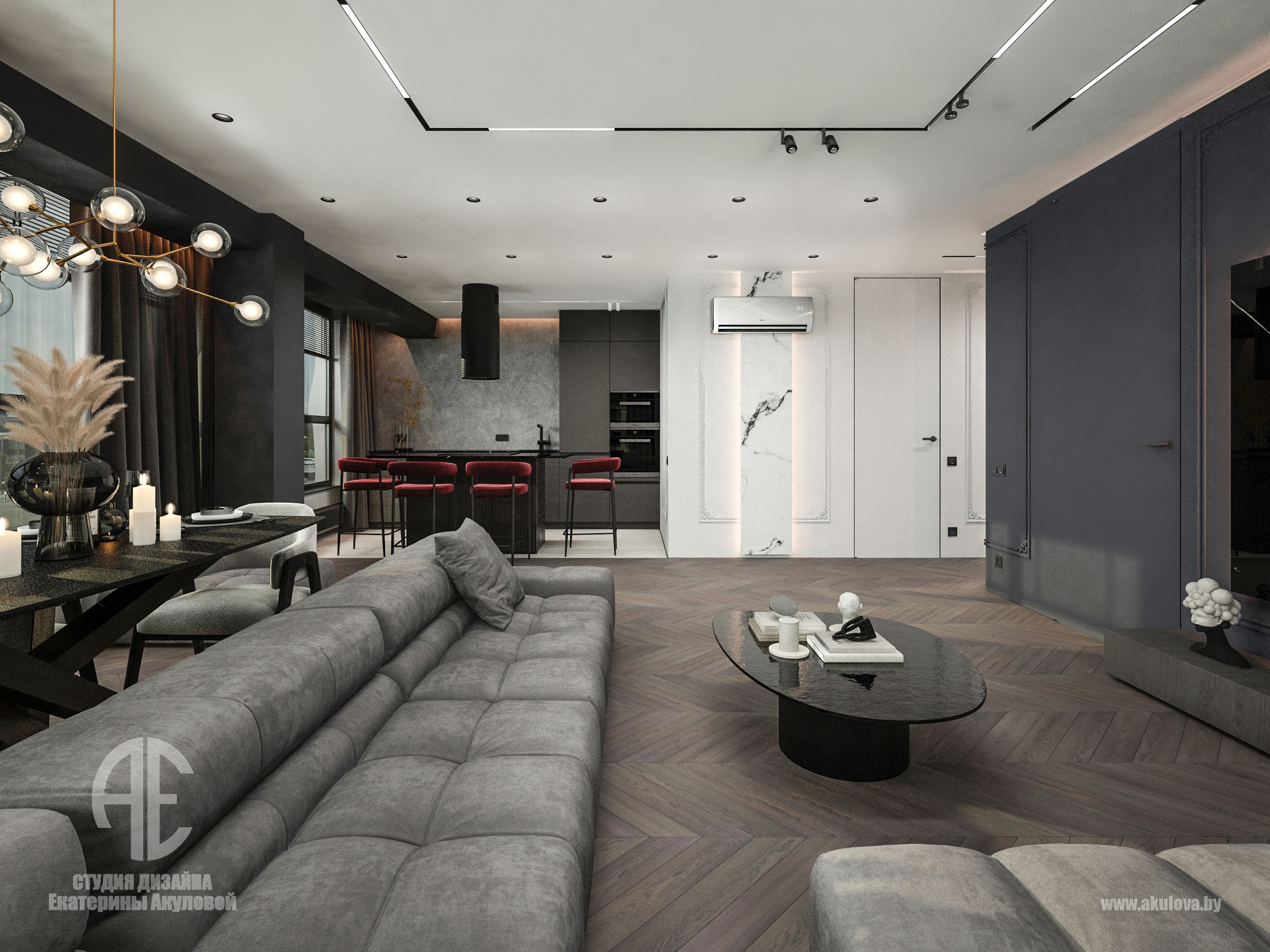 Дизайн интерьера квартиры общей площадью 75 м² разработан для молодого мужчины, ведущего современный ритм жизни и ценящего сочетание эстетики и функциональности. Из первоначально пространства квартиры со свободной планировкой создано продуманное планировочное решение: небольшая прихожая со встроенным шкафом, просторная гостиная, объединённая с кухней и обеденной зоной, отдельная спальня и совмещённый санузел с ванной и душем. В основе интерьера — тёплый паркет приглушенного темного тона, уложенный ёлочкой, стены под покраску с декоративными молдингами и натяжные потолки с комбинированной системой освещения: встроенные магнитные треки, точечные светильники, дизайнерская люстра над обеденным столом и эффектный торшер в виде человека с шарами. Световые сценарии подчеркивают зонирование и архитектуру помещения. Мебель тщательно подобрана для создания атмосферы комфорта и визуального единства. В гостиной доминирует большой модульный диван графитового оттенка, формирующий центр зоны отдыха. Низкий овальный кофейный стол и минималистичная тумба под телевизор дополняют композицию. В обеденной зоне — стол с массивной тёмной столешницей и мягкие стулья нейтрального оттенка, а яркие акценты создают барные стулья насыщенного бордового цвета у кухонного острова. Кухня выполнена в современном стиле: гладкие фасады без ручек, чёрная столешница из искусственного камня и встроенная техника подчеркивают лаконичность и технологичность пространства. В спальне — мягкая кровать с высоким изголовьем, прикроватные тумбы с подвесными светильниками и рабочая зона с консольным столом и бархатным креслом в бордовых тонах. Встроенные шкафы с затемнёнными стеклянными фасадами обеспечивают удобное хранение без перегрузки пространства. В ванной комнате стиль и комфорт соединяются в единый ансамбль: отдельностоящая ванна, просторный душ с чёрной сантехникой, зона со стиральной и сушильной машиной, акценты подсветки и выразительная фактура камня. Весь интерьер построен на сочетании сдержанных серо-графитовых тонов с глубокими акцентами, качественных материалов и функциональной мебели. Он отражает характер владельца — уверенного, практичного и ценящего современный минимализм с тёплыми, уютными нотами.