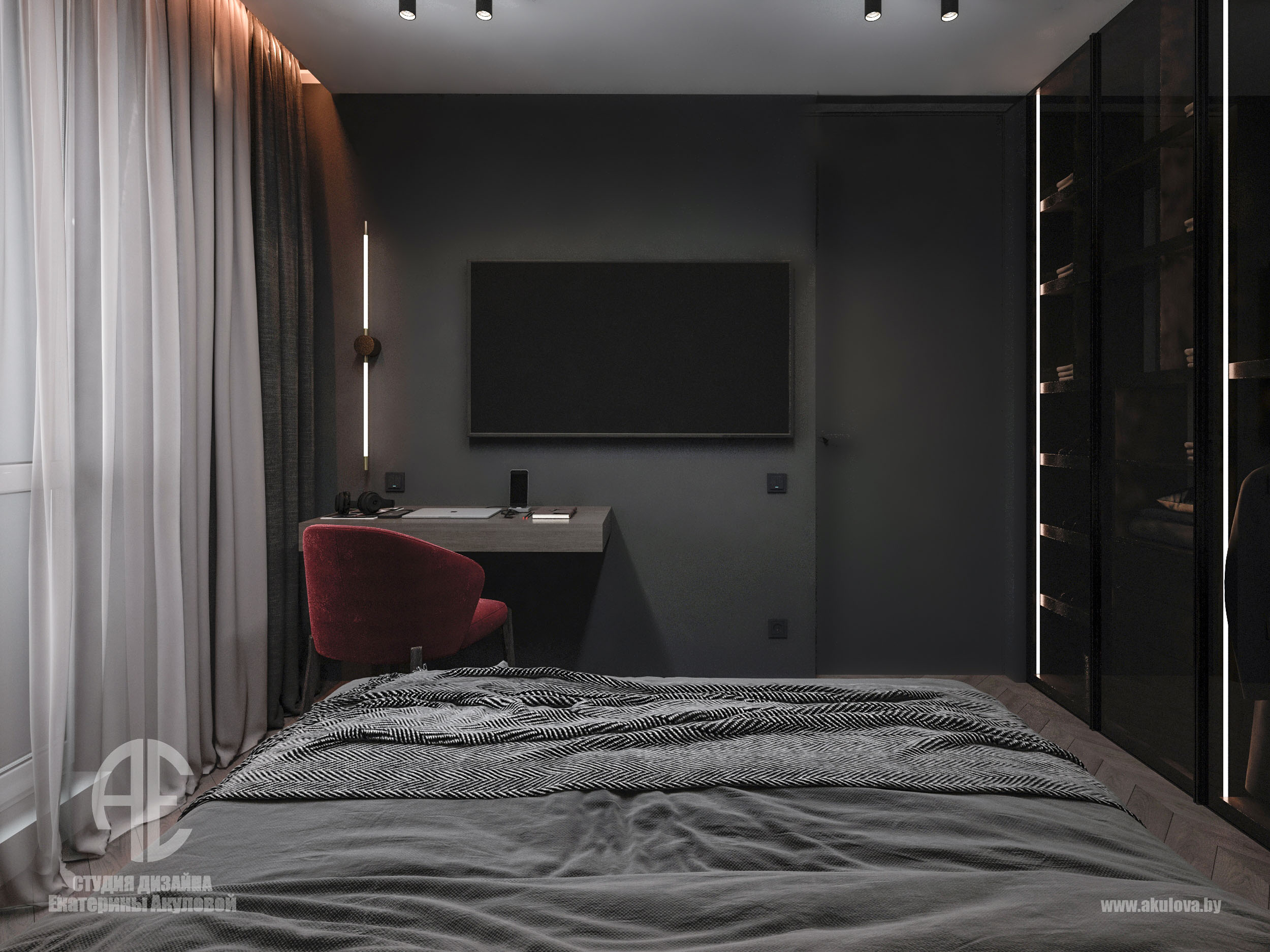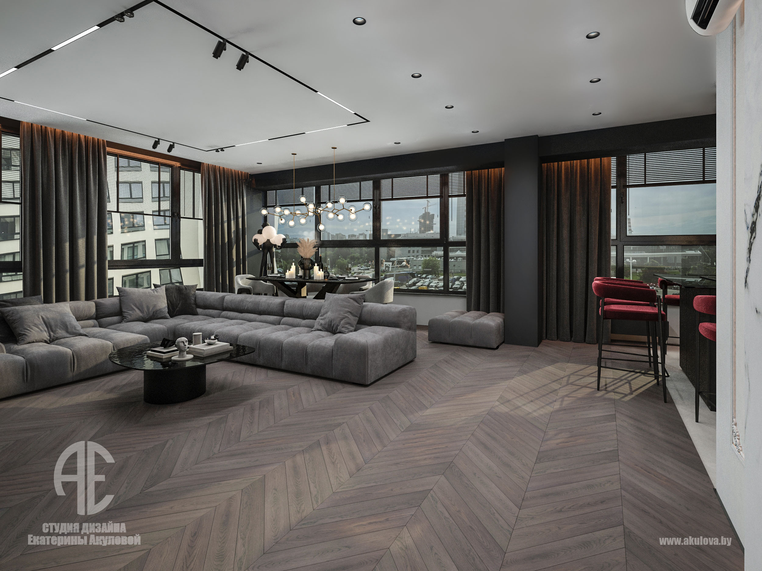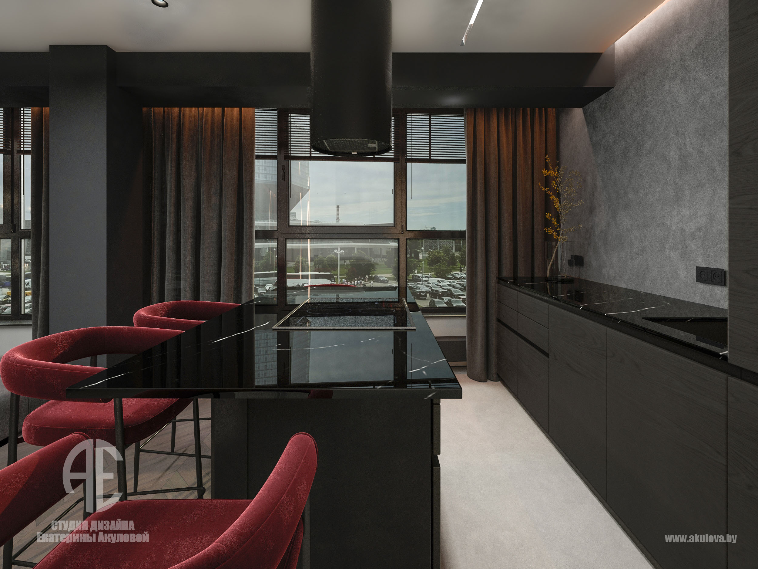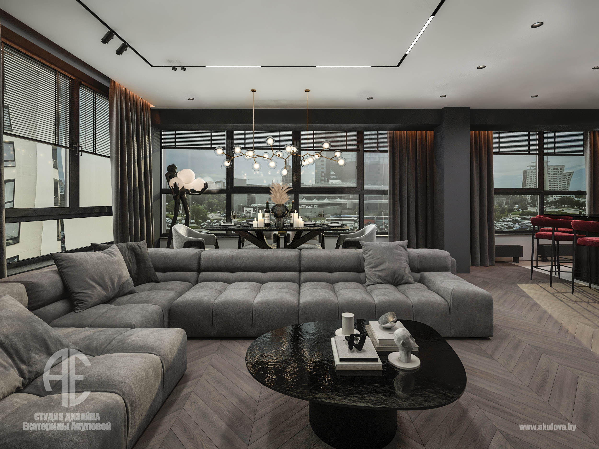 Дизайн интерьера квартиры общей площадью 75 м² разработан для молодого мужчины, ведущего современный ритм жизни и ценящего сочетание эстетики и функциональности. Из первоначально пространства квартиры со свободной планировкой создано продуманное планировочное решение: небольшая прихожая со встроенным шкафом, просторная гостиная, объединённая с кухней и обеденной зоной, отдельная спальня и совмещённый санузел с ванной и душем. В основе интерьера — тёплый паркет приглушенного темного тона, уложенный ёлочкой, стены под покраску с декоративными молдингами и натяжные потолки с комбинированной системой освещения: встроенные магнитные треки, точечные светильники, дизайнерская люстра над обеденным столом и эффектный торшер в виде человека с шарами. Световые сценарии подчеркивают зонирование и архитектуру помещения. Мебель тщательно подобрана для создания атмосферы комфорта и визуального единства. В гостиной доминирует большой модульный диван графитового оттенка, формирующий центр зоны отдыха. Низкий овальный кофейный стол и минималистичная тумба под телевизор дополняют композицию. В обеденной зоне — стол с массивной тёмной столешницей и мягкие стулья нейтрального оттенка, а яркие акценты создают барные стулья насыщенного бордового цвета у кухонного острова. Кухня выполнена в современном стиле: гладкие фасады без ручек, чёрная столешница из искусственного камня и встроенная техника подчеркивают лаконичность и технологичность пространства. В спальне — мягкая кровать с высоким изголовьем, прикроватные тумбы с подвесными светильниками и рабочая зона с консольным столом и бархатным креслом в бордовых тонах. Встроенные шкафы с затемнёнными стеклянными фасадами обеспечивают удобное хранение без перегрузки пространства. В ванной комнате стиль и комфорт соединяются в единый ансамбль: отдельностоящая ванна, просторный душ с чёрной сантехникой, зона со стиральной и сушильной машиной, акценты подсветки и выразительная фактура камня. Весь интерьер построен на сочетании сдержанных серо-графитовых тонов с глубокими акцентами, качественных материалов и функциональной мебели. Он отражает характер владельца — уверенного, практичного и ценящего современный минимализм с тёплыми, уютными нотами.