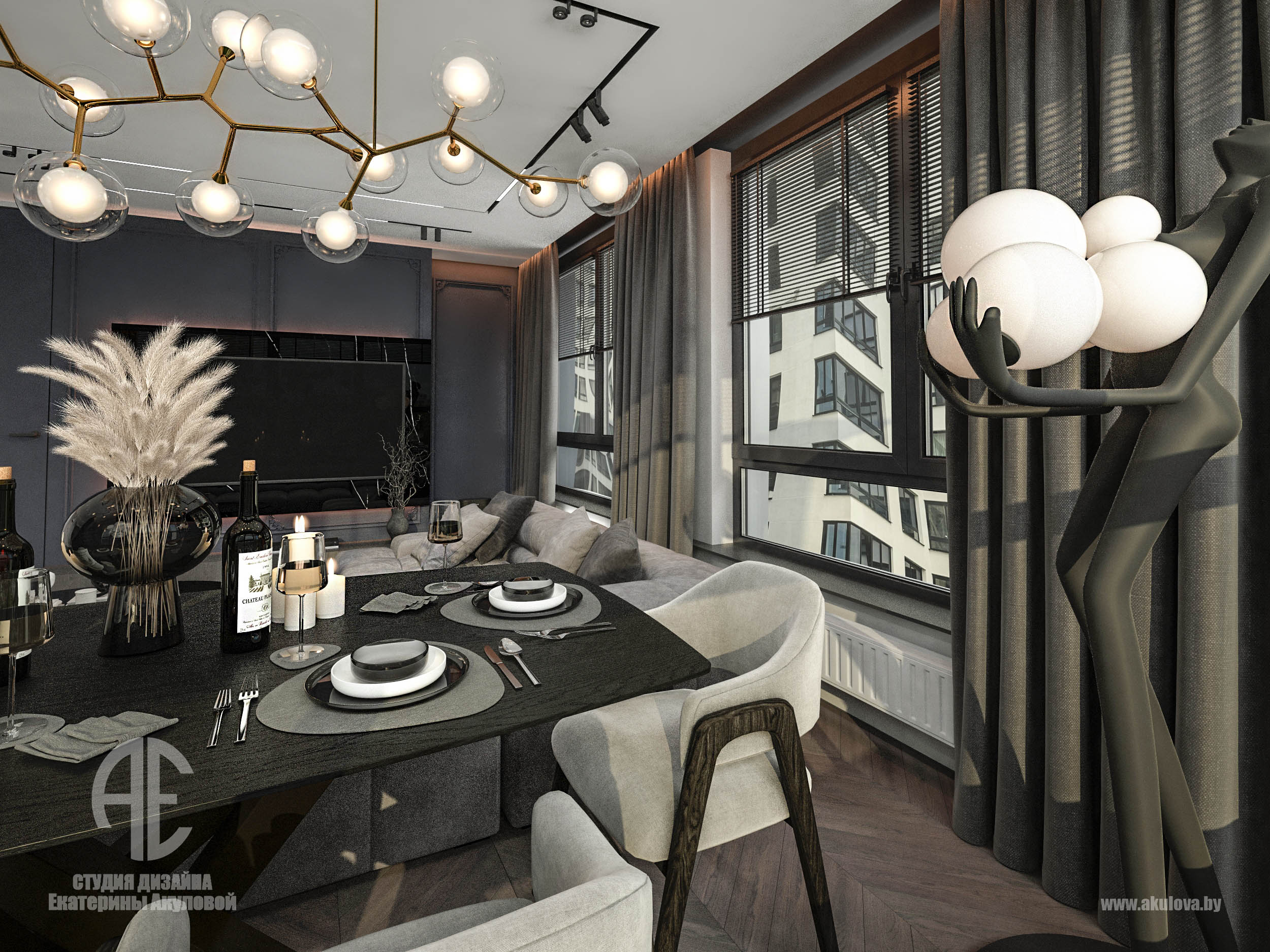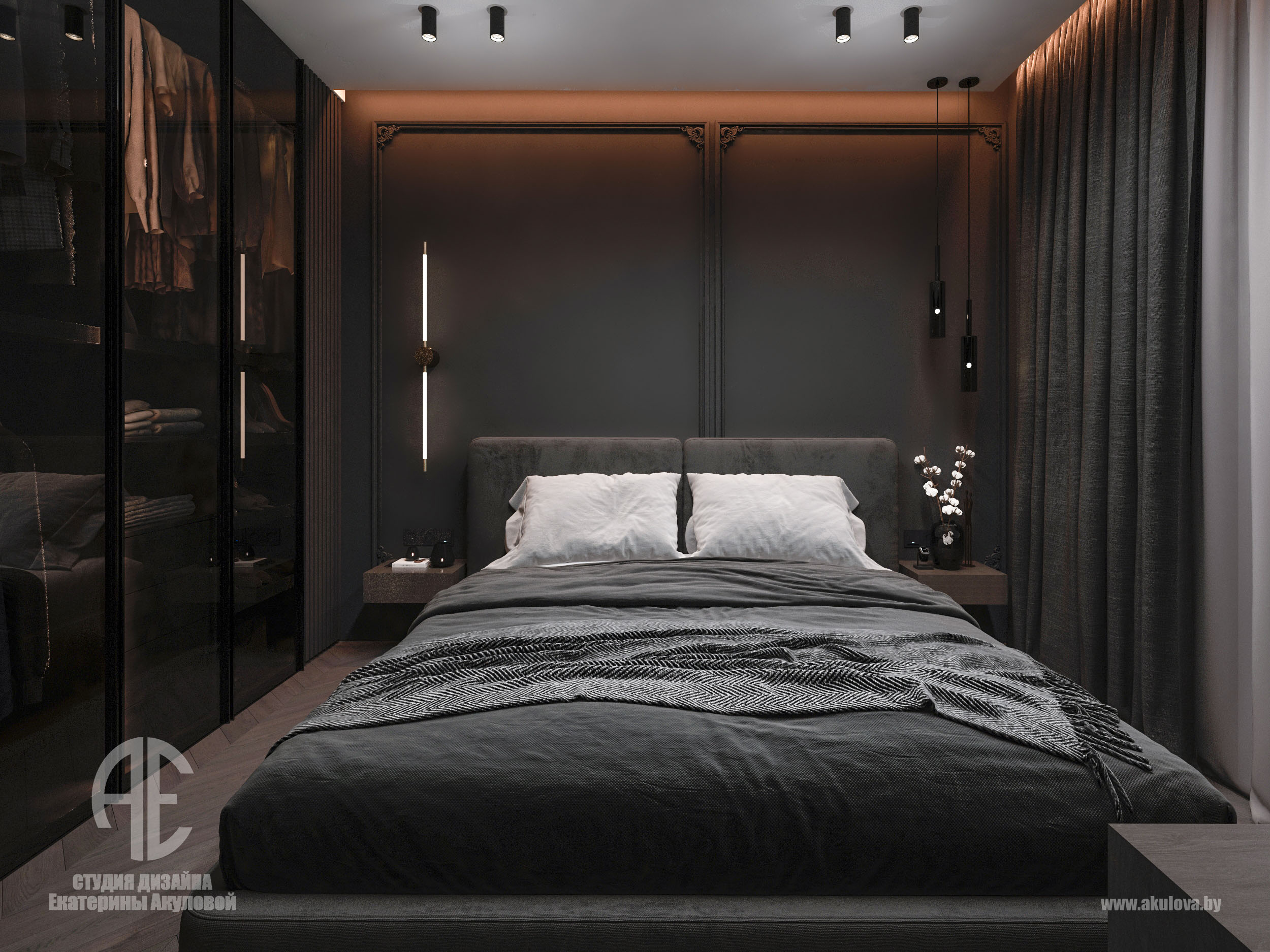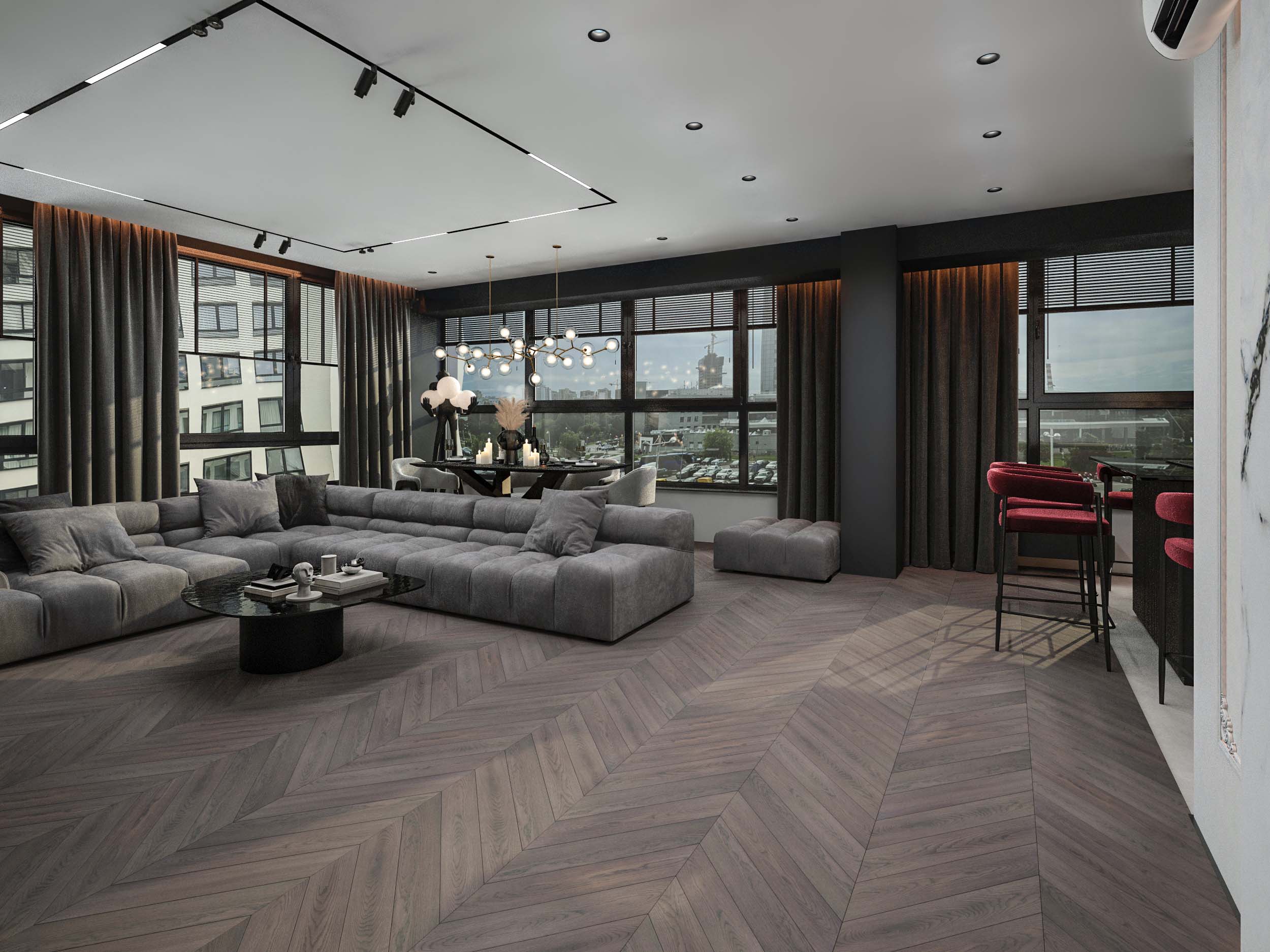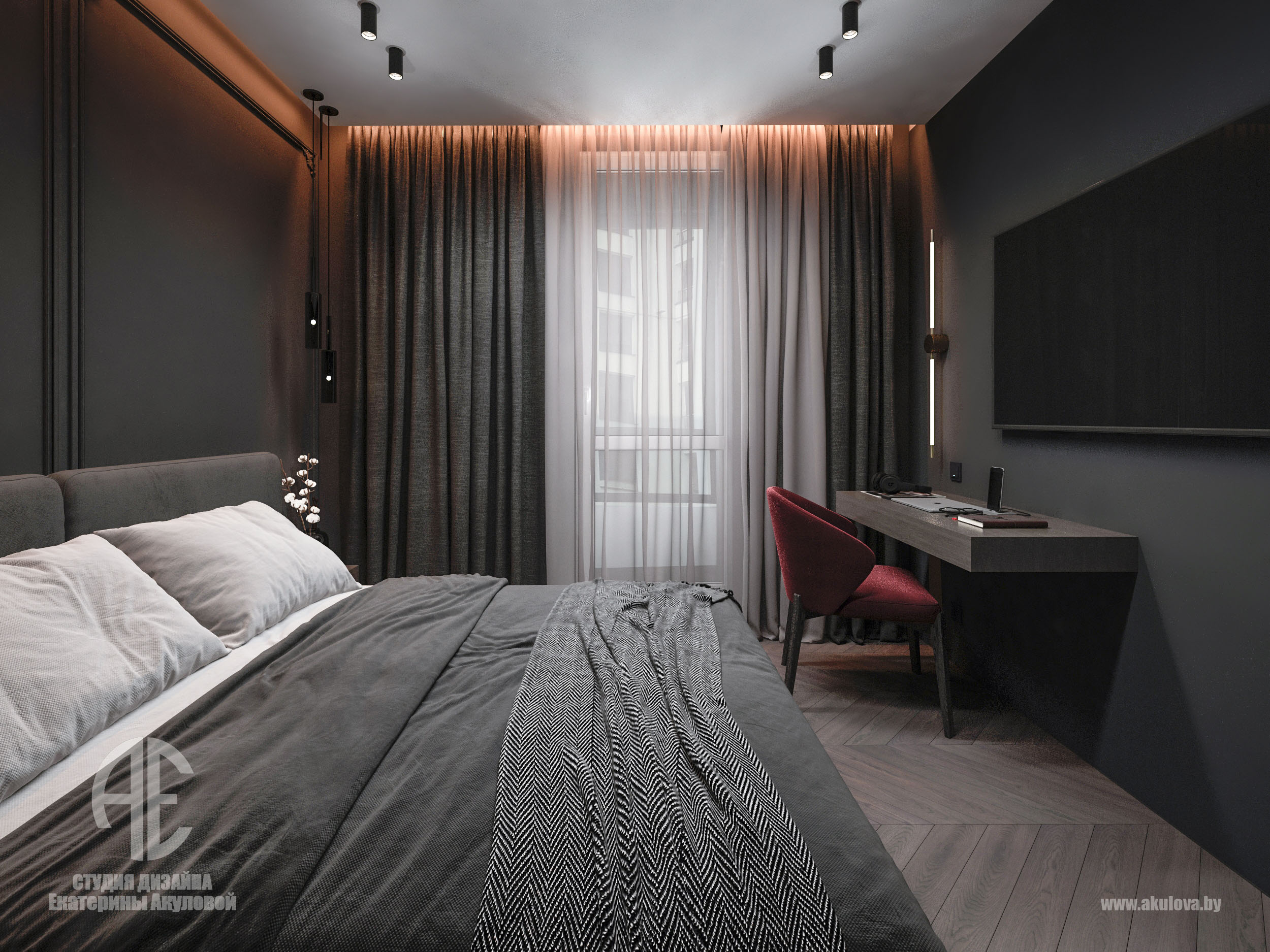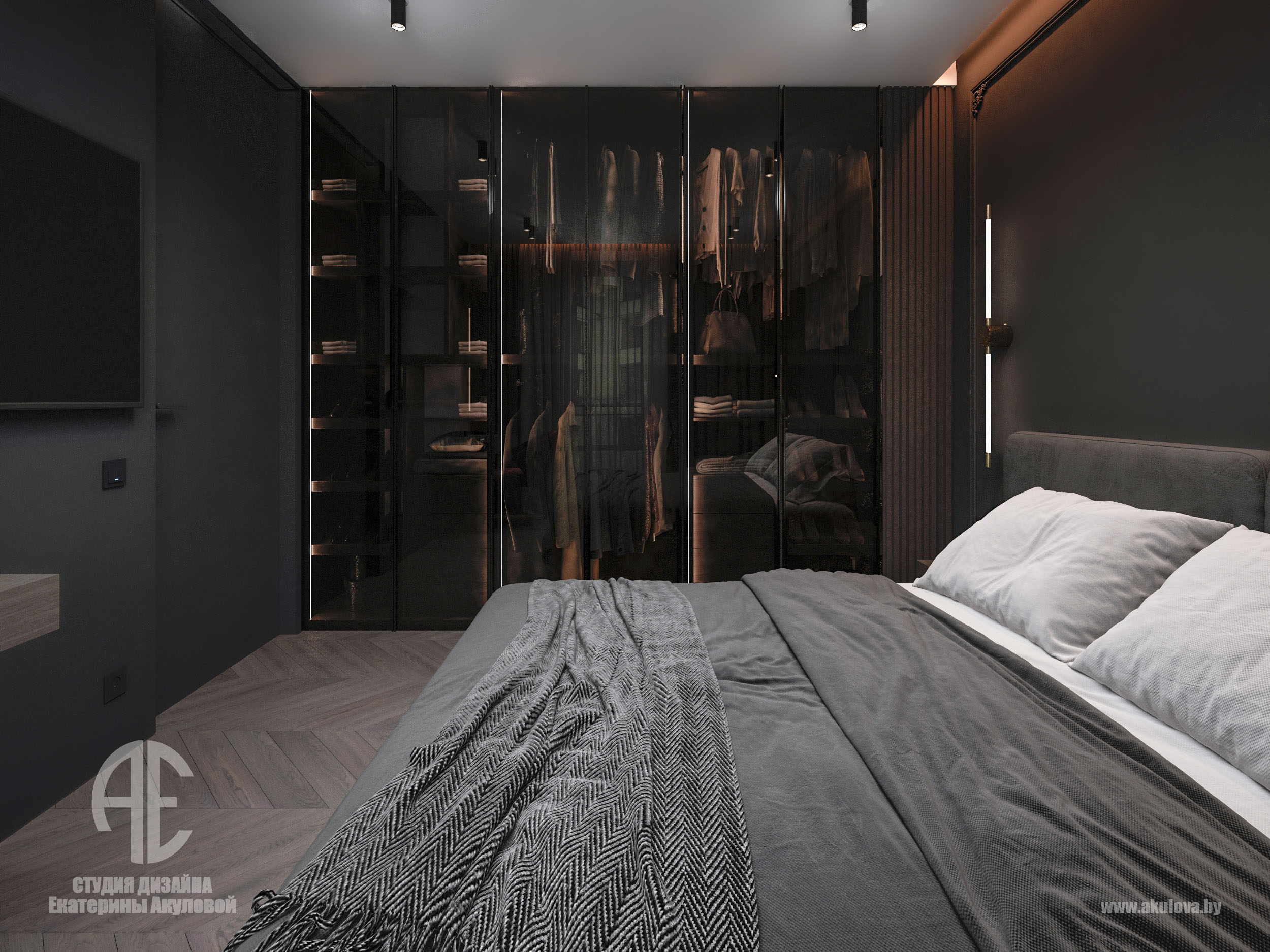 Дизайн интерьера квартиры общей площадью 75 м² разработан для молодого мужчины, ведущего современный ритм жизни и ценящего сочетание эстетики и функциональности. Из первоначально пространства квартиры со свободной планировкой создано продуманное планировочное решение: небольшая прихожая со встроенным шкафом, просторная гостиная, объединённая с кухней и обеденной зоной, отдельная спальня и совмещённый санузел с ванной и душем. В основе интерьера — тёплый паркет приглушенного темного тона, уложенный ёлочкой, стены под покраску с декоративными молдингами и натяжные потолки с комбинированной системой освещения: встроенные магнитные треки, точечные светильники, дизайнерская люстра над обеденным столом и эффектный торшер в виде человека с шарами. Световые сценарии подчеркивают зонирование и архитектуру помещения. Мебель тщательно подобрана для создания атмосферы комфорта и визуального единства. В гостиной доминирует большой модульный диван графитового оттенка, формирующий центр зоны отдыха. Низкий овальный кофейный стол и минималистичная тумба под телевизор дополняют композицию. В обеденной зоне — стол с массивной тёмной столешницей и мягкие стулья нейтрального оттенка, а яркие акценты создают барные стулья насыщенного бордового цвета у кухонного острова. Кухня выполнена в современном стиле: гладкие фасады без ручек, чёрная столешница из искусственного камня и встроенная техника подчеркивают лаконичность и технологичность пространства. В спальне — мягкая кровать с высоким изголовьем, прикроватные тумбы с подвесными светильниками и рабочая зона с консольным столом и бархатным креслом в бордовых тонах. Встроенные шкафы с затемнёнными стеклянными фасадами обеспечивают удобное хранение без перегрузки пространства. В ванной комнате стиль и комфорт соединяются в единый ансамбль: отдельностоящая ванна, просторный душ с чёрной сантехникой, зона со стиральной и сушильной машиной, акценты подсветки и выразительная фактура камня. Весь интерьер построен на сочетании сдержанных серо-графитовых тонов с глубокими акцентами, качественных материалов и функциональной мебели. Он отражает характер владельца — уверенного, практичного и ценящего современный минимализм с тёплыми, уютными нотами.