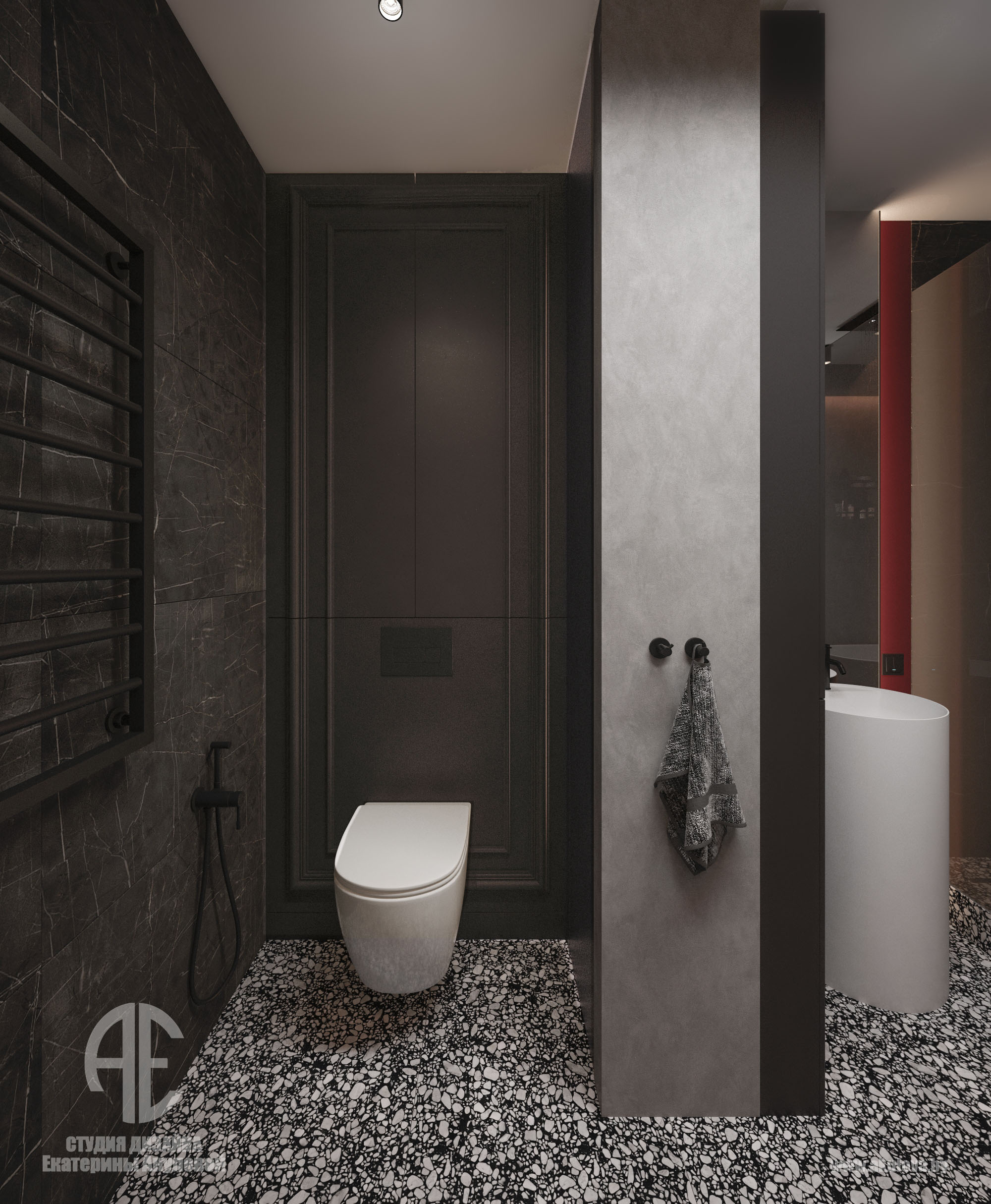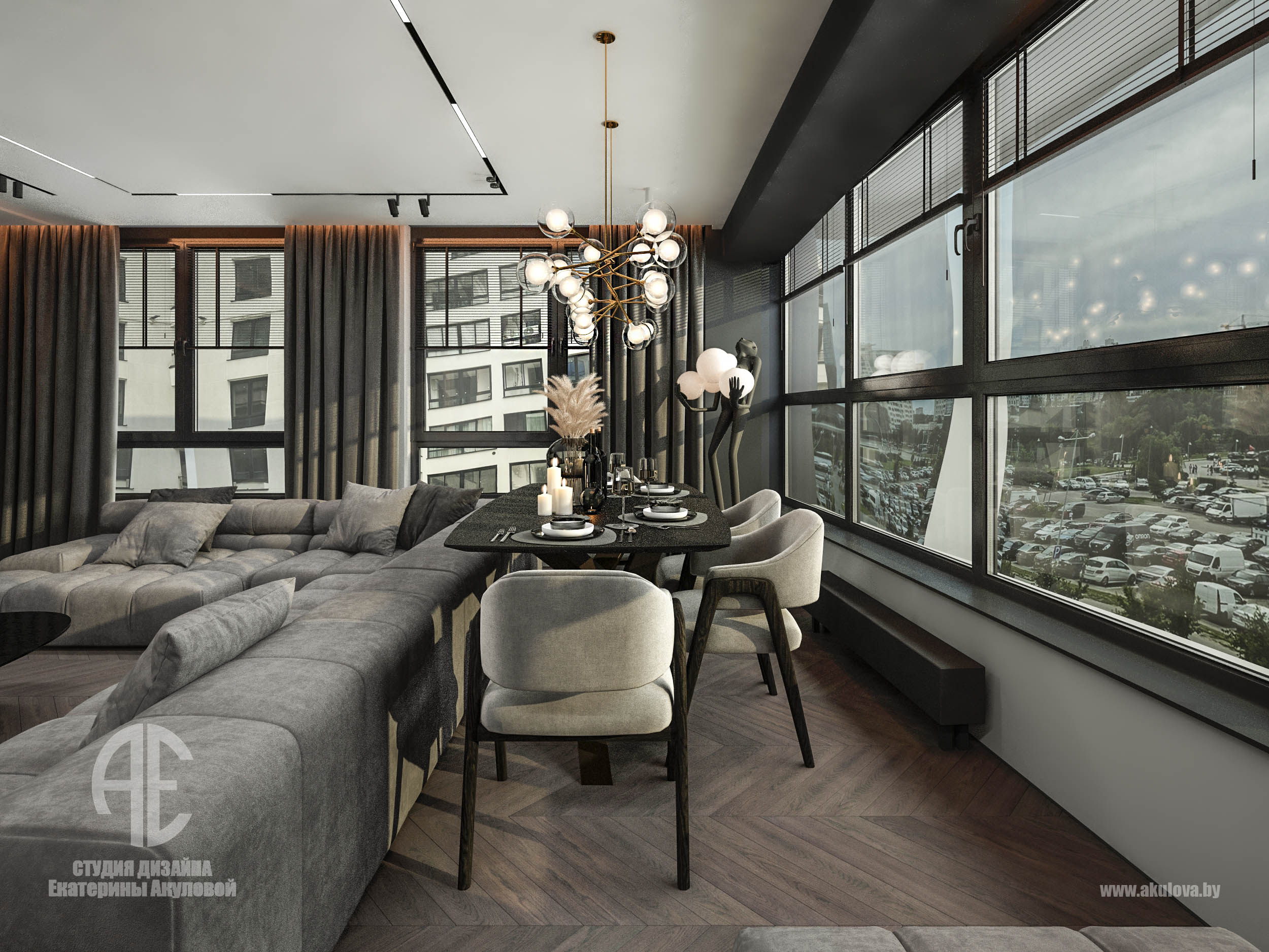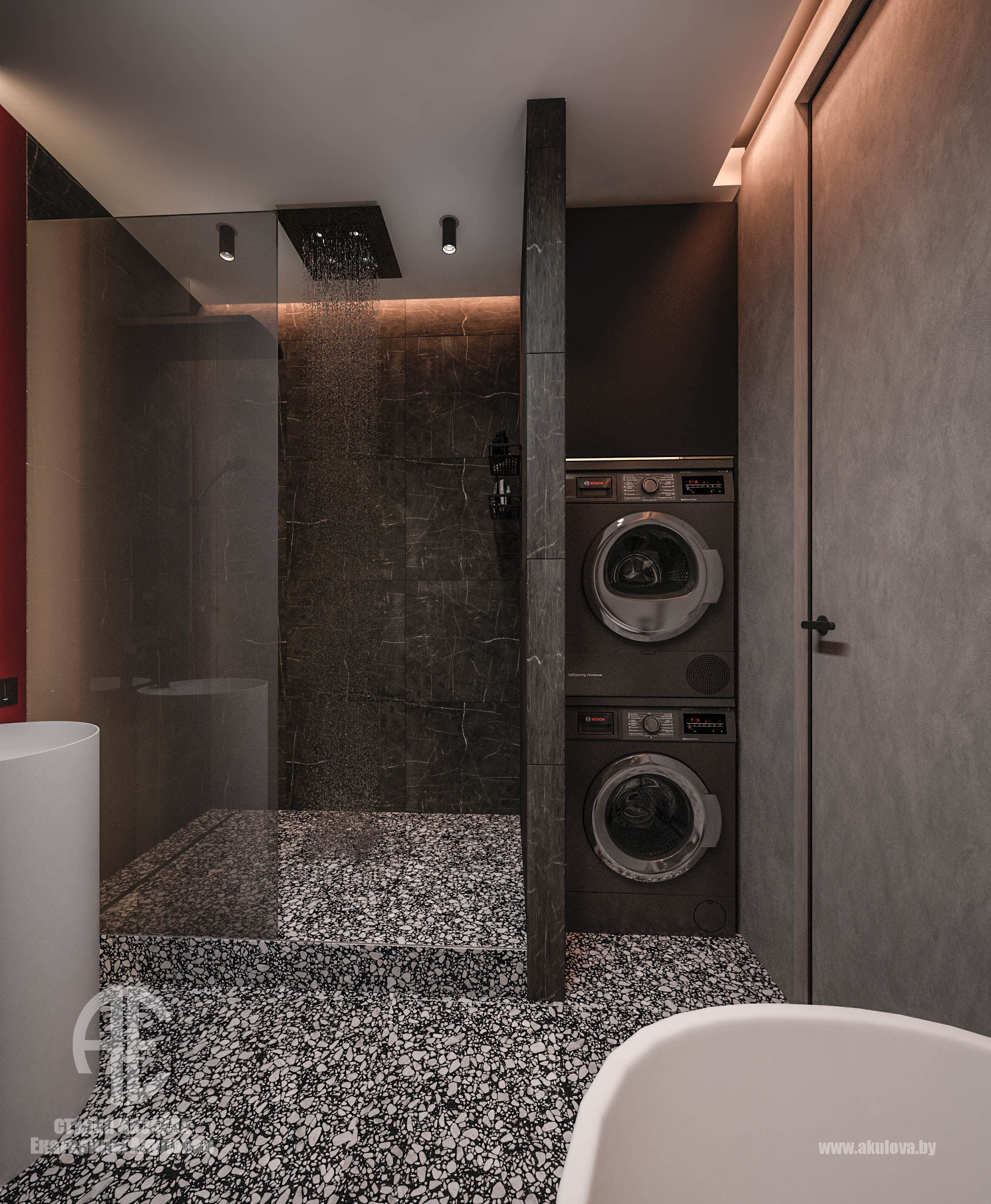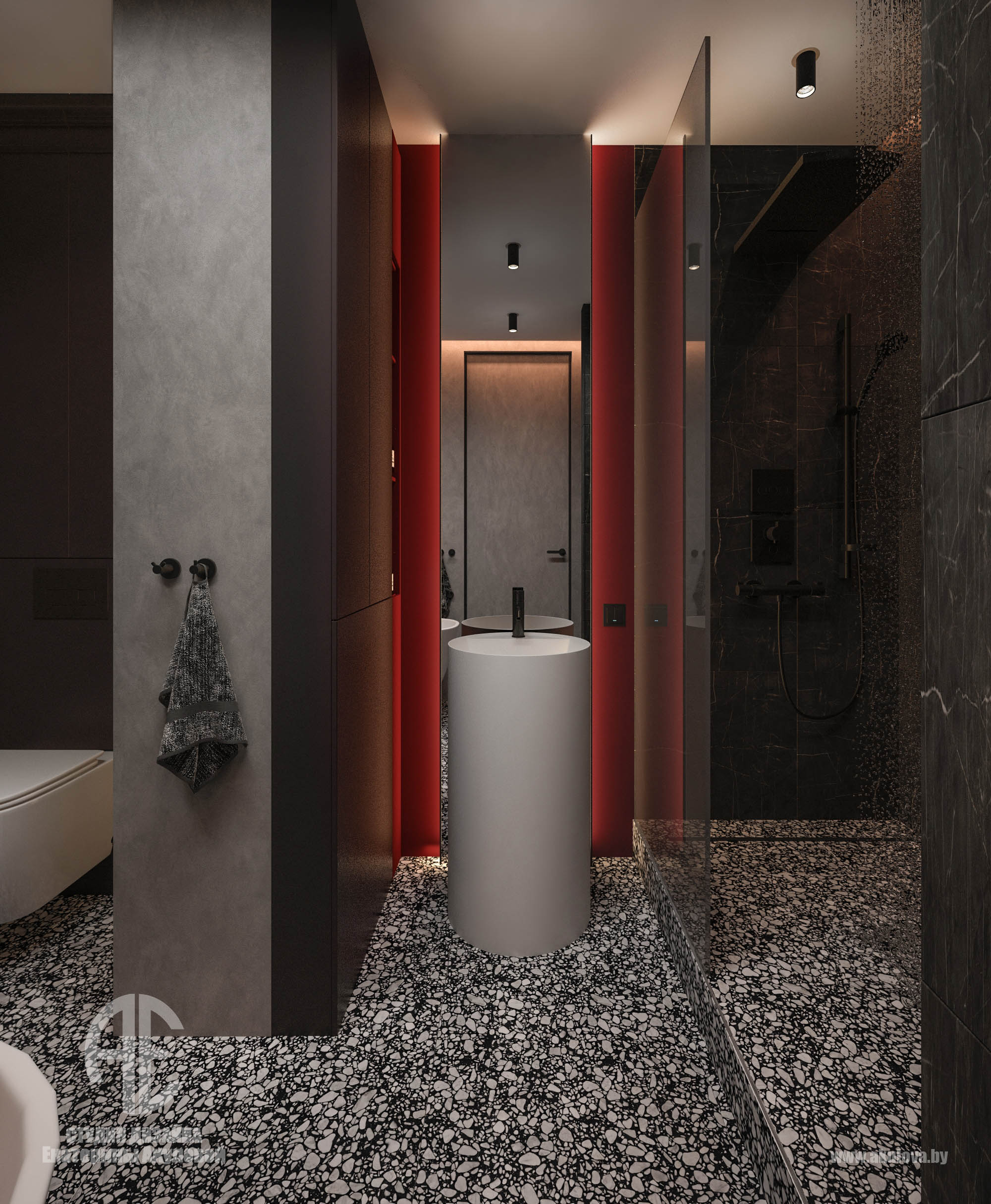 Дизайн интерьера квартиры общей площадью 75 м² разработан для молодого мужчины, ведущего современный ритм жизни и ценящего сочетание эстетики и функциональности. Из первоначально пространства квартиры со свободной планировкой создано продуманное планировочное решение: небольшая прихожая со встроенным шкафом, просторная гостиная, объединённая с кухней и обеденной зоной, отдельная спальня и совмещённый санузел с ванной и душем. В основе интерьера — тёплый паркет приглушенного темного тона, уложенный ёлочкой, стены под покраску с декоративными молдингами и натяжные потолки с комбинированной системой освещения: встроенные магнитные треки, точечные светильники, дизайнерская люстра над обеденным столом и эффектный торшер в виде человека с шарами. Световые сценарии подчеркивают зонирование и архитектуру помещения. Мебель тщательно подобрана для создания атмосферы комфорта и визуального единства. В гостиной доминирует большой модульный диван графитового оттенка, формирующий центр зоны отдыха. Низкий овальный кофейный стол и минималистичная тумба под телевизор дополняют композицию. В обеденной зоне — стол с массивной тёмной столешницей и мягкие стулья нейтрального оттенка, а яркие акценты создают барные стулья насыщенного бордового цвета у кухонного острова. Кухня выполнена в современном стиле: гладкие фасады без ручек, чёрная столешница из искусственного камня и встроенная техника подчеркивают лаконичность и технологичность пространства. В спальне — мягкая кровать с высоким изголовьем, прикроватные тумбы с подвесными светильниками и рабочая зона с консольным столом и бархатным креслом в бордовых тонах. Встроенные шкафы с затемнёнными стеклянными фасадами обеспечивают удобное хранение без перегрузки пространства. В ванной комнате стиль и комфорт соединяются в единый ансамбль: отдельностоящая ванна, просторный душ с чёрной сантехникой, зона со стиральной и сушильной машиной, акценты подсветки и выразительная фактура камня. Весь интерьер построен на сочетании сдержанных серо-графитовых тонов с глубокими акцентами, качественных материалов и функциональной мебели. Он отражает характер владельца — уверенного, практичного и ценящего современный минимализм с тёплыми, уютными нотами.