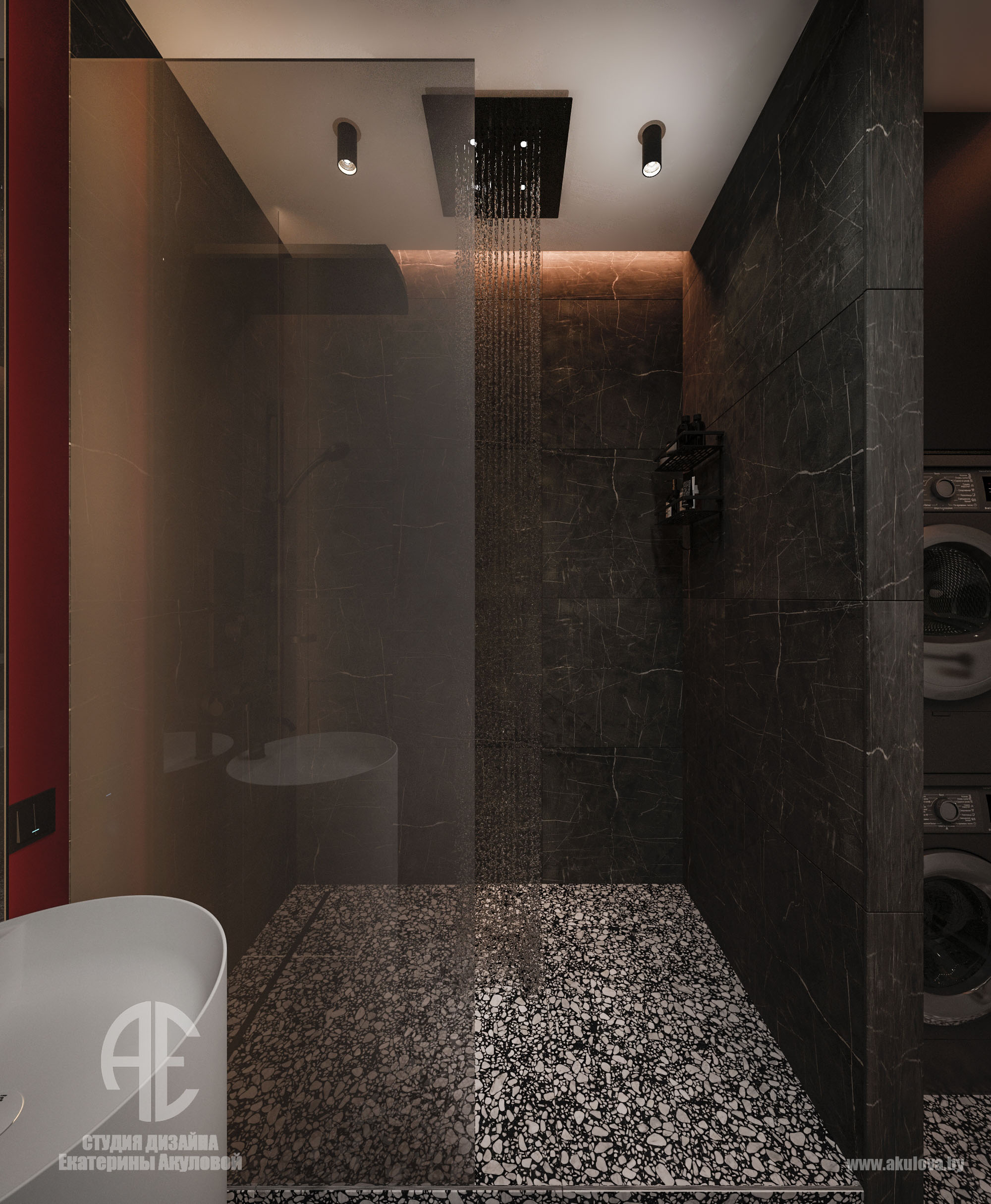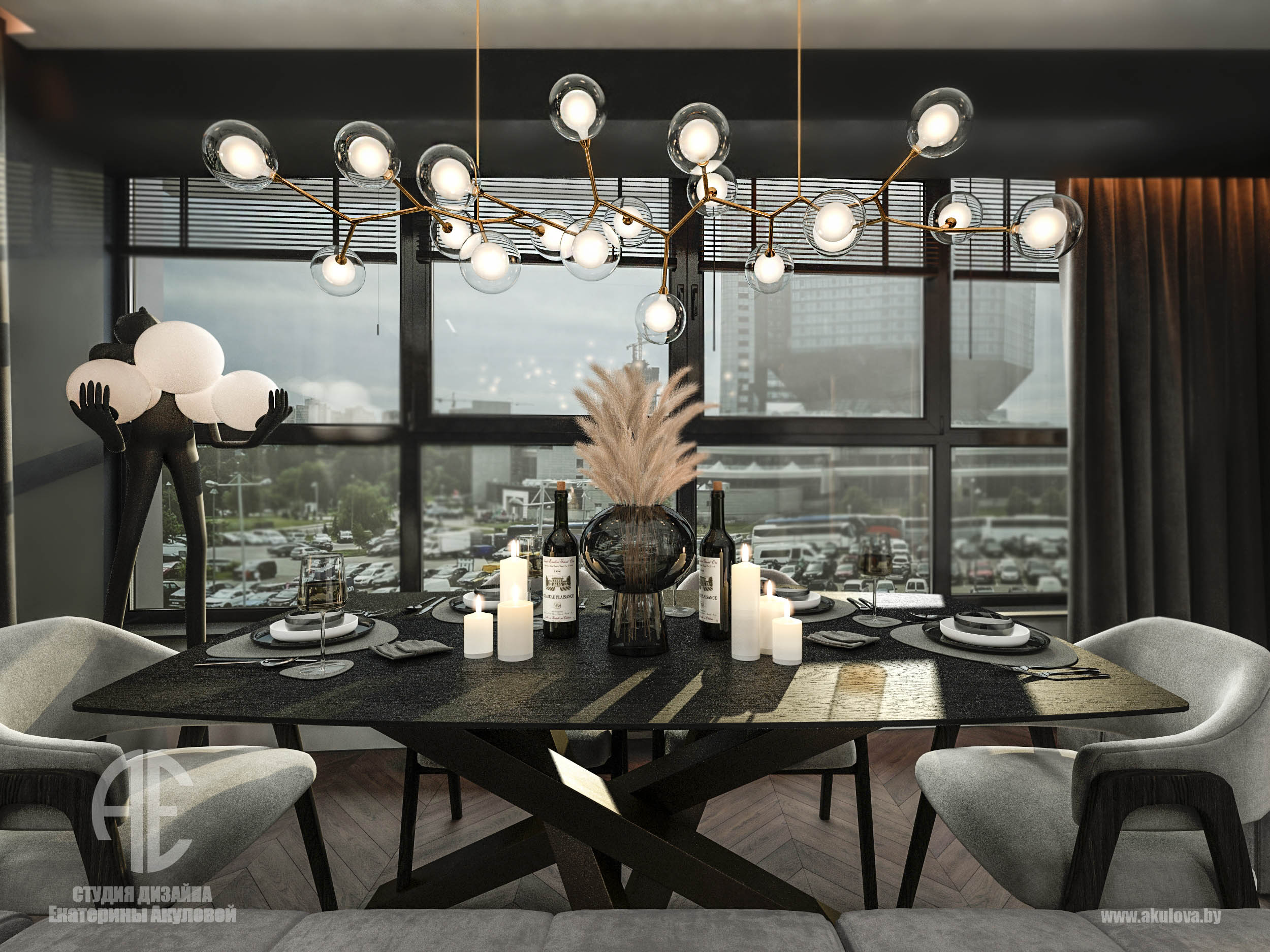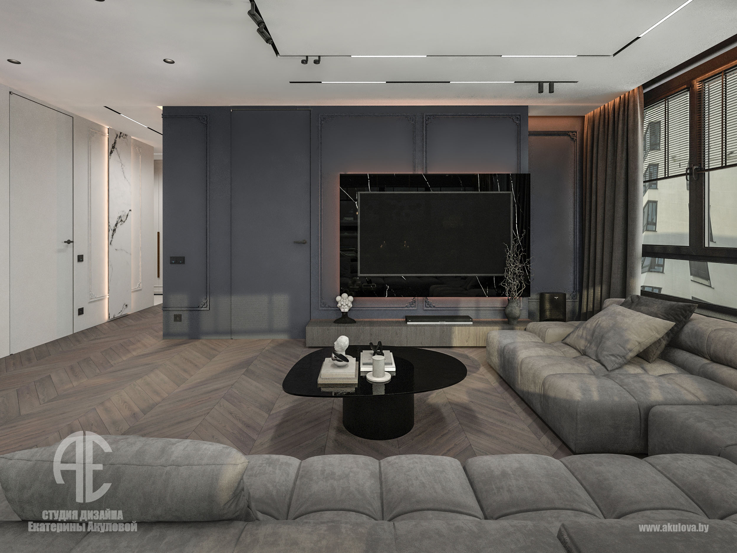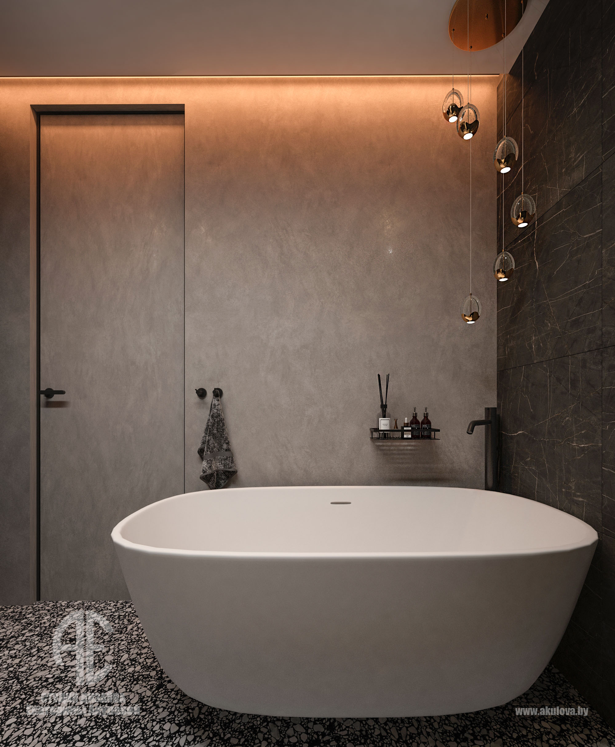 Дизайн интерьера квартиры общей площадью 75 м² разработан для молодого мужчины, ведущего современный ритм жизни и ценящего сочетание эстетики и функциональности. Из первоначально пространства квартиры со свободной планировкой создано продуманное планировочное решение: небольшая прихожая со встроенным шкафом, просторная гостиная, объединённая с кухней и обеденной зоной, отдельная спальня и совмещённый санузел с ванной и душем. В основе интерьера — тёплый паркет приглушенного темного тона, уложенный ёлочкой, стены под покраску с декоративными молдингами и натяжные потолки с комбинированной системой освещения: встроенные магнитные треки, точечные светильники, дизайнерская люстра над обеденным столом и эффектный торшер в виде человека с шарами. Световые сценарии подчеркивают зонирование и архитектуру помещения. Мебель тщательно подобрана для создания атмосферы комфорта и визуального единства. В гостиной доминирует большой модульный диван графитового оттенка, формирующий центр зоны отдыха. Низкий овальный кофейный стол и минималистичная тумба под телевизор дополняют композицию. В обеденной зоне — стол с массивной тёмной столешницей и мягкие стулья нейтрального оттенка, а яркие акценты создают барные стулья насыщенного бордового цвета у кухонного острова. Кухня выполнена в современном стиле: гладкие фасады без ручек, чёрная столешница из искусственного камня и встроенная техника подчеркивают лаконичность и технологичность пространства. В спальне — мягкая кровать с высоким изголовьем, прикроватные тумбы с подвесными светильниками и рабочая зона с консольным столом и бархатным креслом в бордовых тонах. Встроенные шкафы с затемнёнными стеклянными фасадами обеспечивают удобное хранение без перегрузки пространства. В ванной комнате стиль и комфорт соединяются в единый ансамбль: отдельностоящая ванна, просторный душ с чёрной сантехникой, зона со стиральной и сушильной машиной, акценты подсветки и выразительная фактура камня. Весь интерьер построен на сочетании сдержанных серо-графитовых тонов с глубокими акцентами, качественных материалов и функциональной мебели. Он отражает характер владельца — уверенного, практичного и ценящего современный минимализм с тёплыми, уютными нотами.