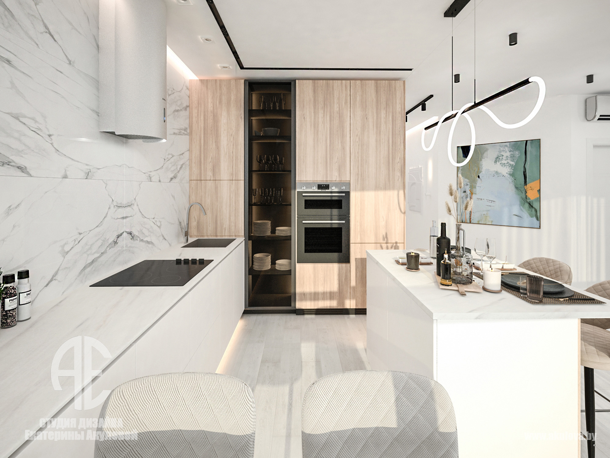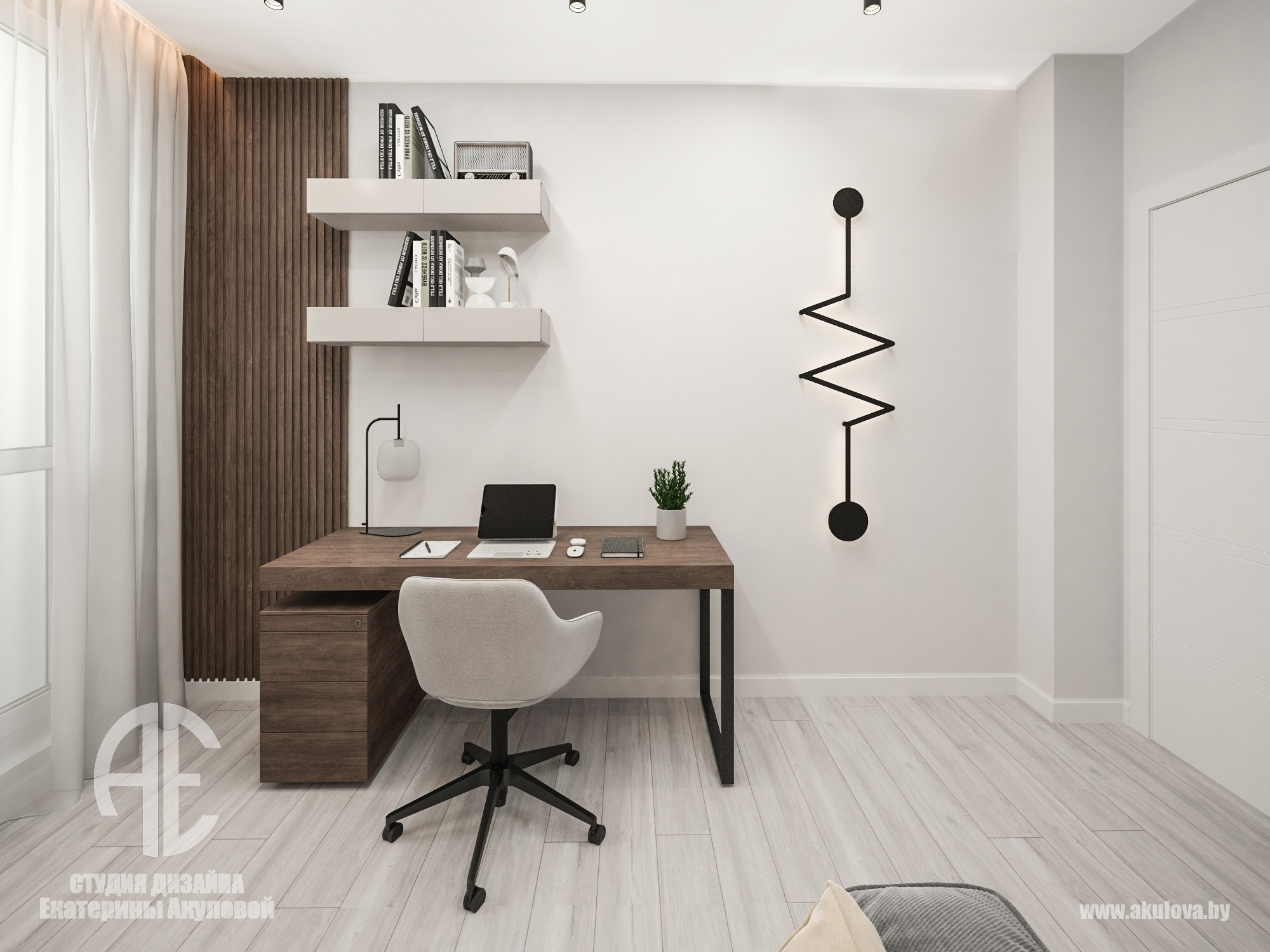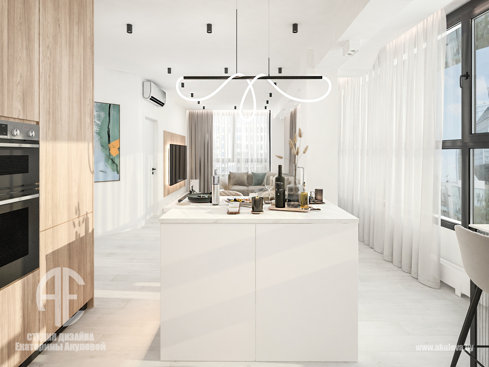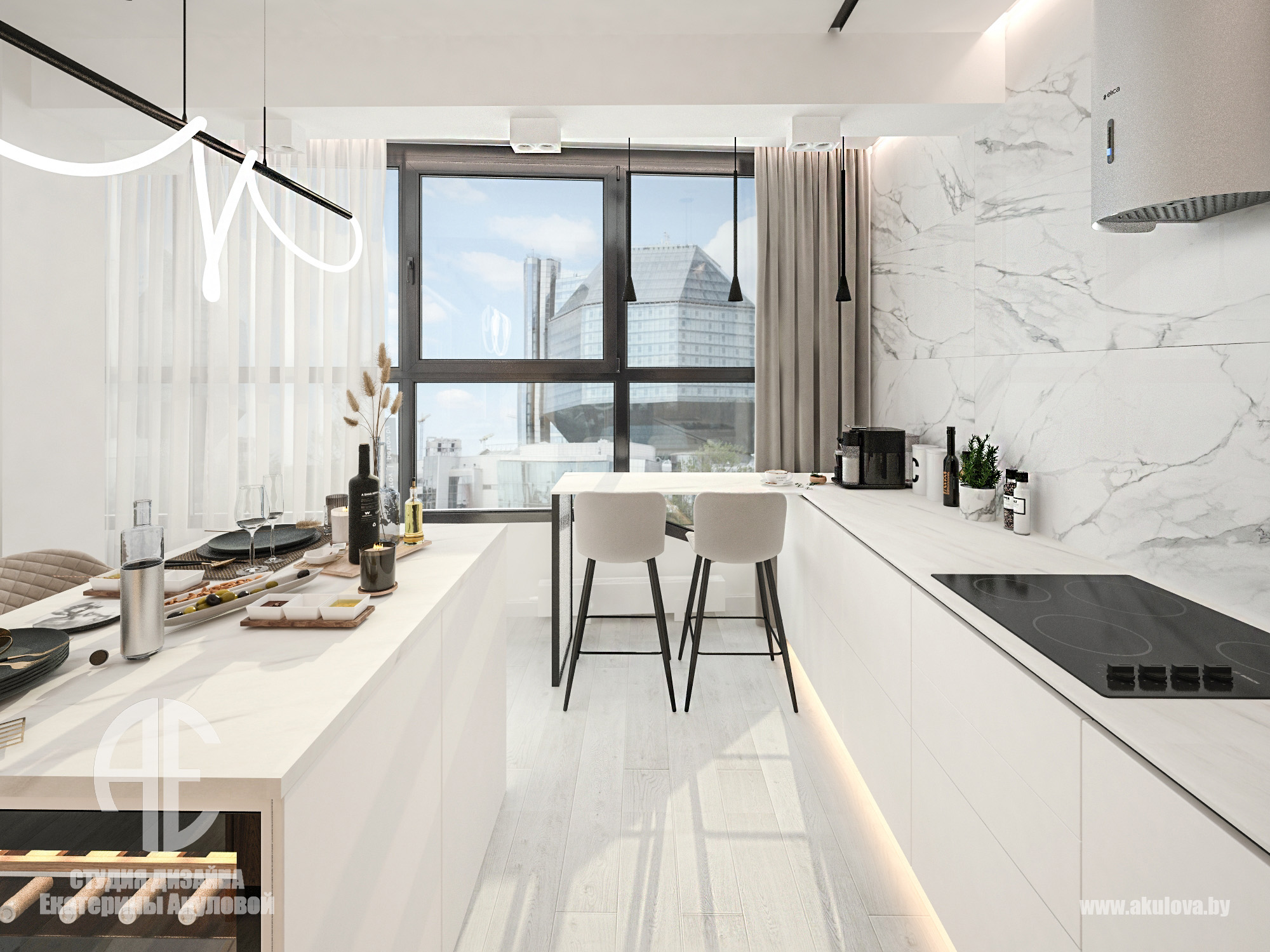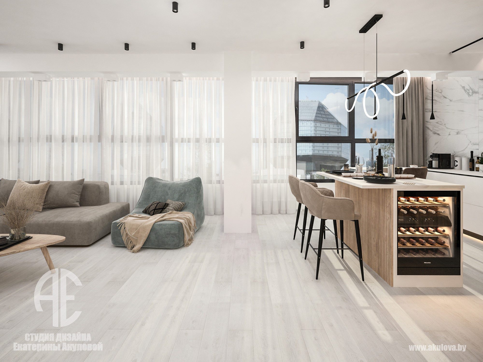 Дизайн-проект квартиры разрабатывался для молодого человека. Квартира предусмотрена застройщиком со свободной планировкой. Основной задачей для дизайнера являлось сохранение свободного пространства, а также ощущения простора. Грамотно распланировав площадь квартиры, мы выделили следующие помещения: большая гостиная совмещенная с кухней с замечательным открывающимся панорамным видом на Национальную библиотеку, спальня с гардеробной комнатой, кабинет, ванная комната, а также санузел. Преобладающая цветовая гамма квартиры – белый цвет. Он отлично сочетается с другими цветами, помогает объединить мебель, предметы интерьера и текстиль. Белый цвет – это идеальный фон, подчеркивающий красоту и индивидуальность отдельных предметов. Сейчас в тренде естественность, поэтому смело можно использовать природные фактуры и краски для создания комфортной, уютной и расслабляющей атмосферы. Лучше всего с белым сочетается дерево. Это может быть напольное покрытие, декор, перегородки, мебель. Всё это органично дополняет цветовые акценты в природных зеленых тонах. Белый цвет станет универсальной основой, освежающей интерьер. Также такая цветовая гамма подойдет для скандинавского и эко-стиля.