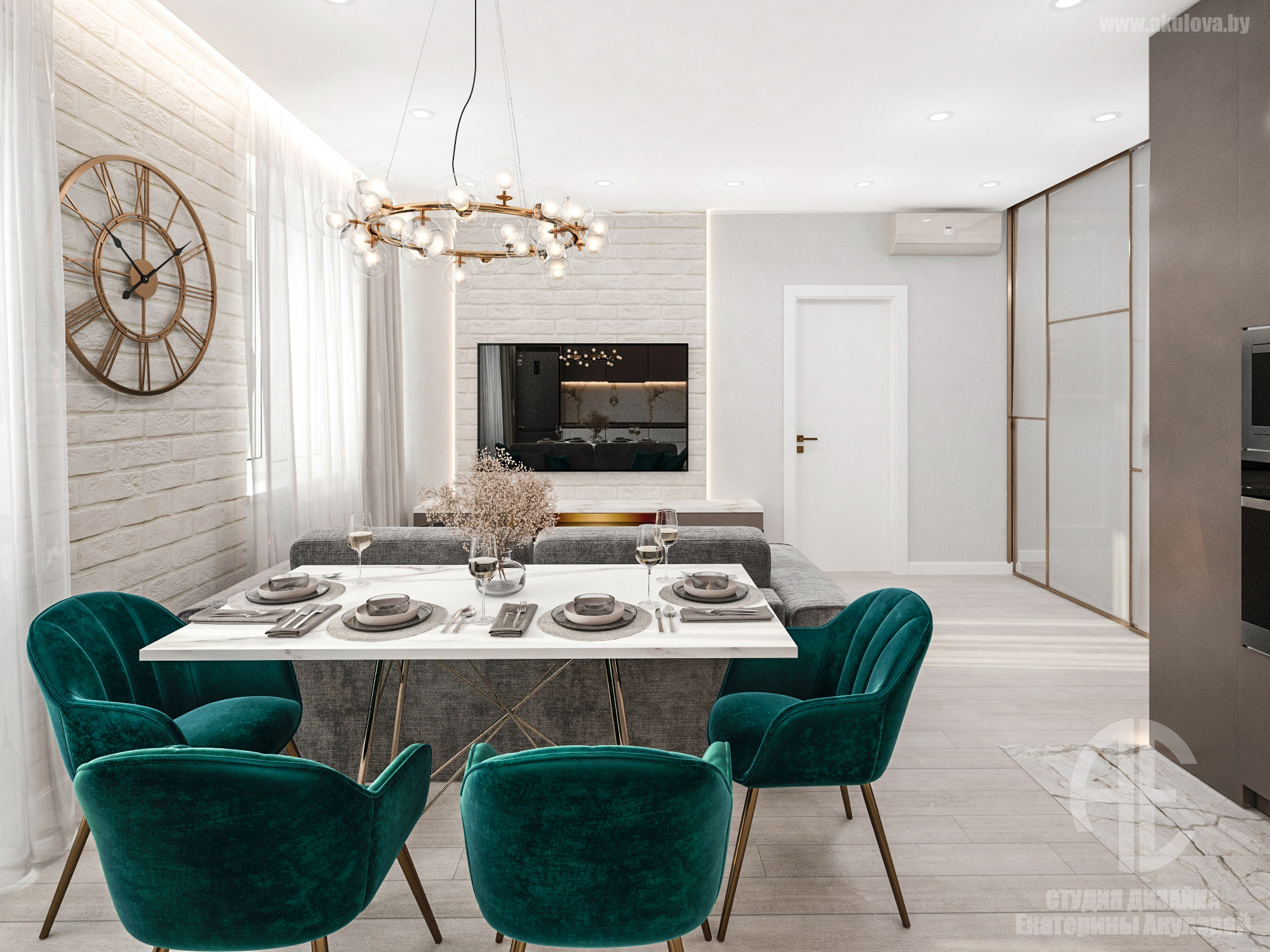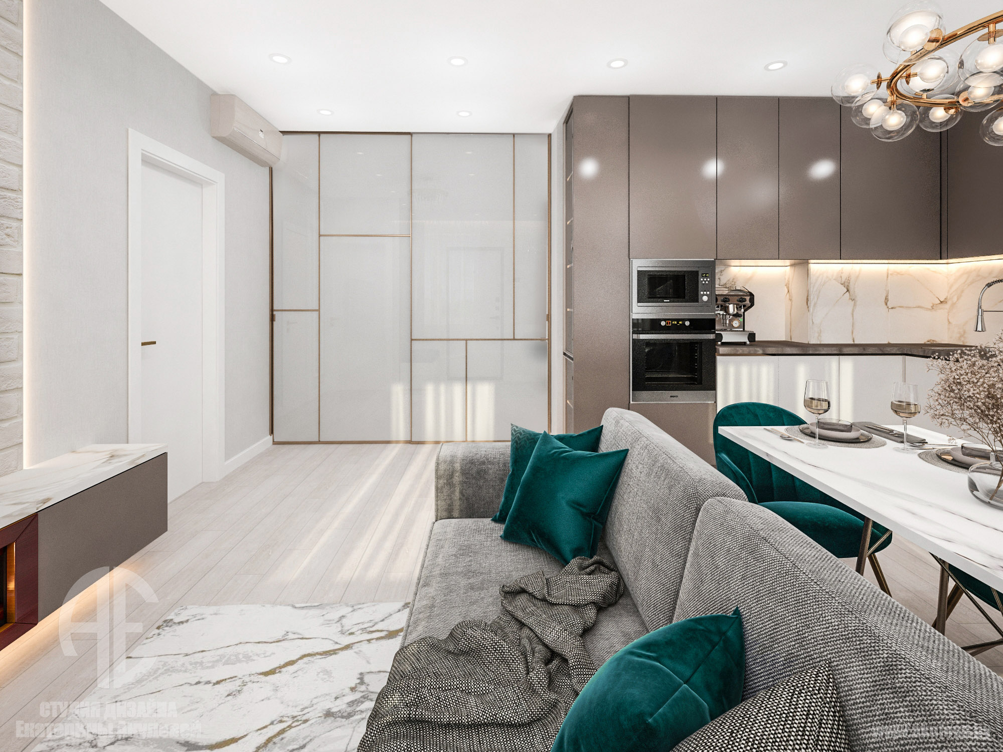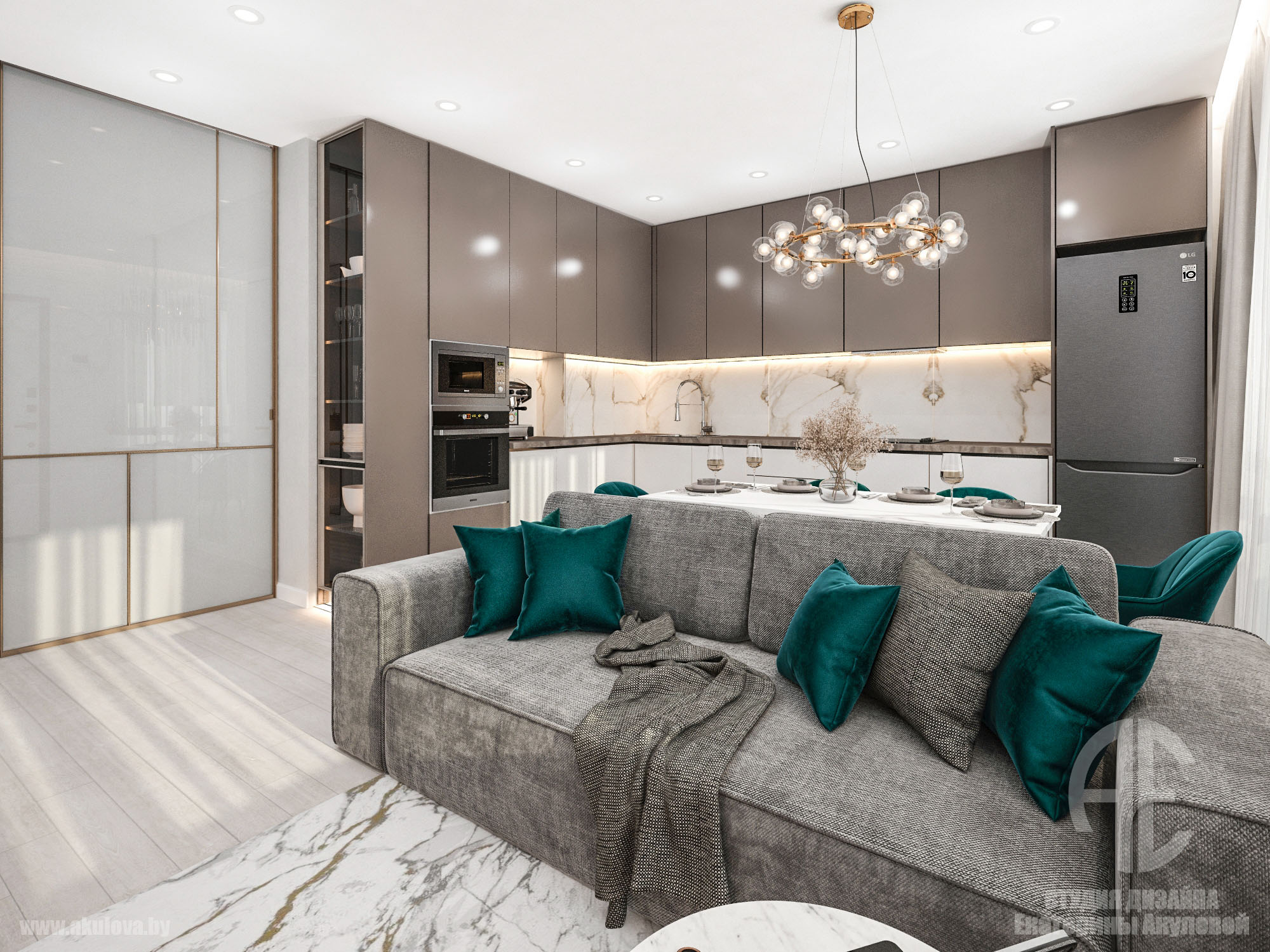 Дизайн интерьера двухкомнатной квартиры для молодой семьи в современном стиле с элементами неоклассики. Дизайн квартиры такого типа открывает широкие оформительские возможности для дизайнера. Главное – это доминирование смешанной кухонно-гостевой зоны с добавлением автономных комнат. Общая цветовая гамма нейтральные пастельные тона с добавлением роскошного изумрудного цветового акцента в мебели и текстиле. Элементы из золота привносят интерьеру роскоши. Солнечный цвет способен придать позитивный оттенок любому интерьеру. Блеск и сияние чистого золота сейчас является современной тенденцией. Мы добавили помещению объема и воздуха, а также оживили пространство и выделили определенные элементы в декоре, отделке.