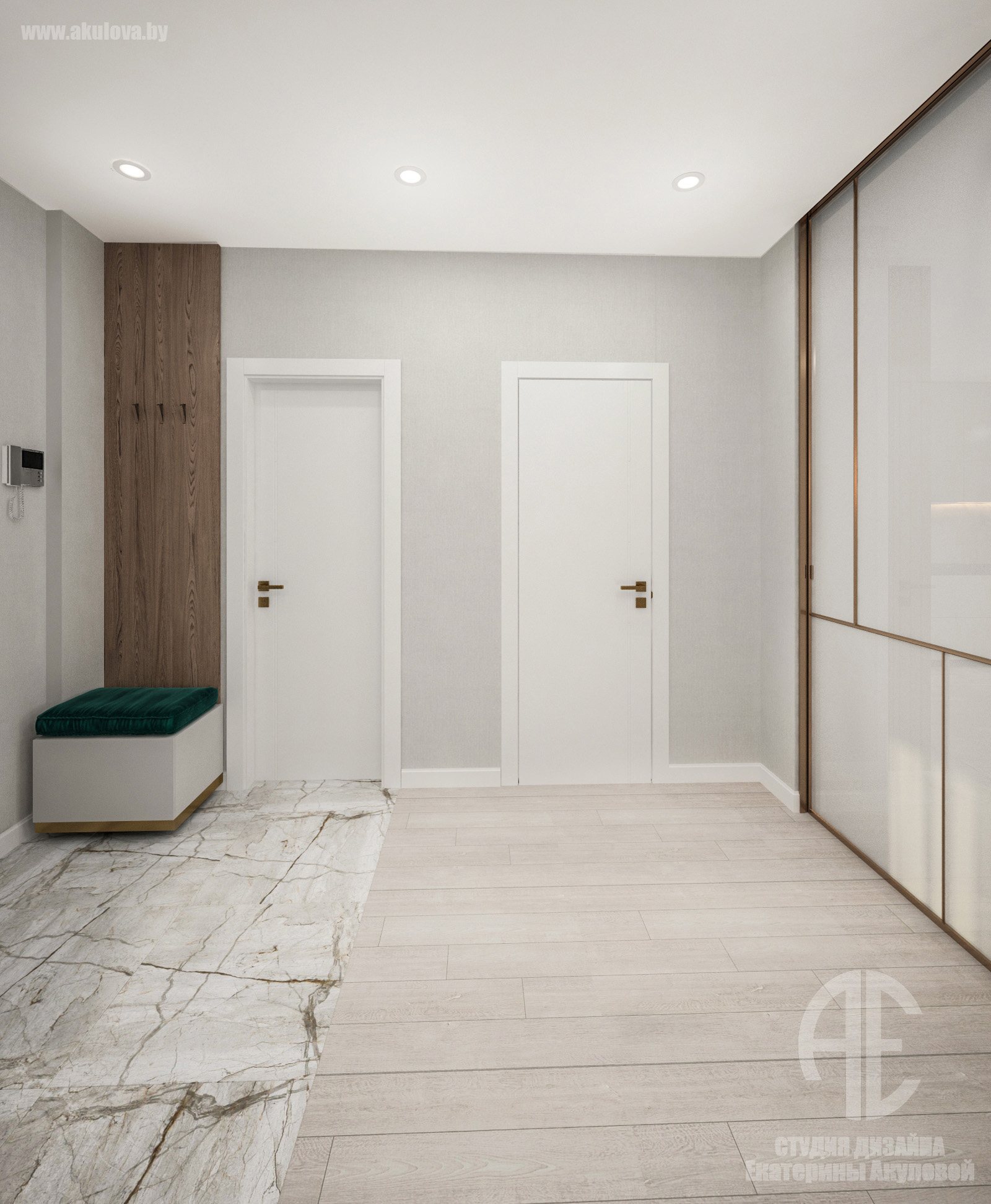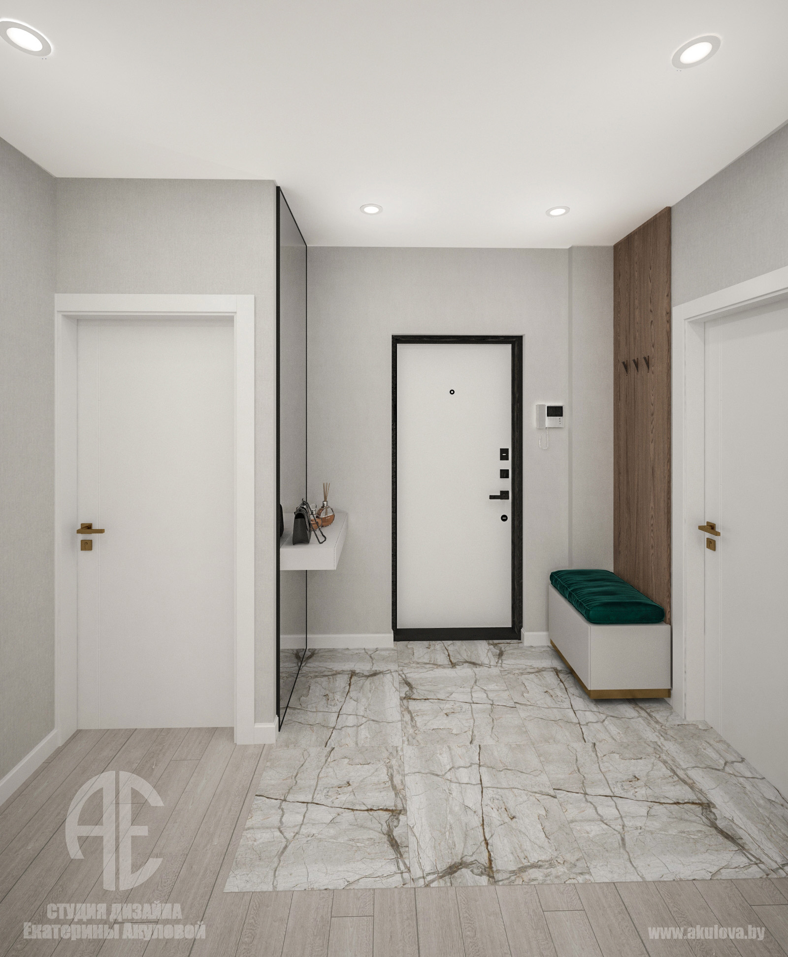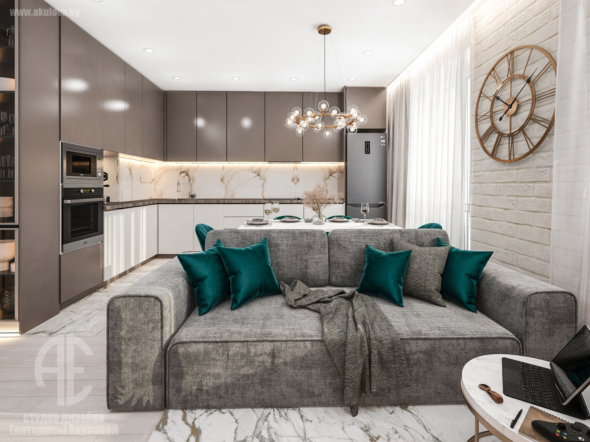 Дизайн интерьера двухкомнатной квартиры для молодой семьи в современном стиле с элементами неоклассики. Дизайн квартиры такого типа открывает широкие оформительские возможности для дизайнера. Главное – это доминирование смешанной кухонно-гостевой зоны с добавлением автономных комнат. Общая цветовая гамма нейтральные пастельные тона с добавлением роскошного изумрудного цветового акцента в мебели и текстиле. Элементы из золота привносят интерьеру роскоши. Солнечный цвет способен придать позитивный оттенок любому интерьеру. Блеск и сияние чистого золота сейчас является современной тенденцией. Мы добавили помещению объема и воздуха, а также оживили пространство и выделили определенные элементы в декоре, отделке.