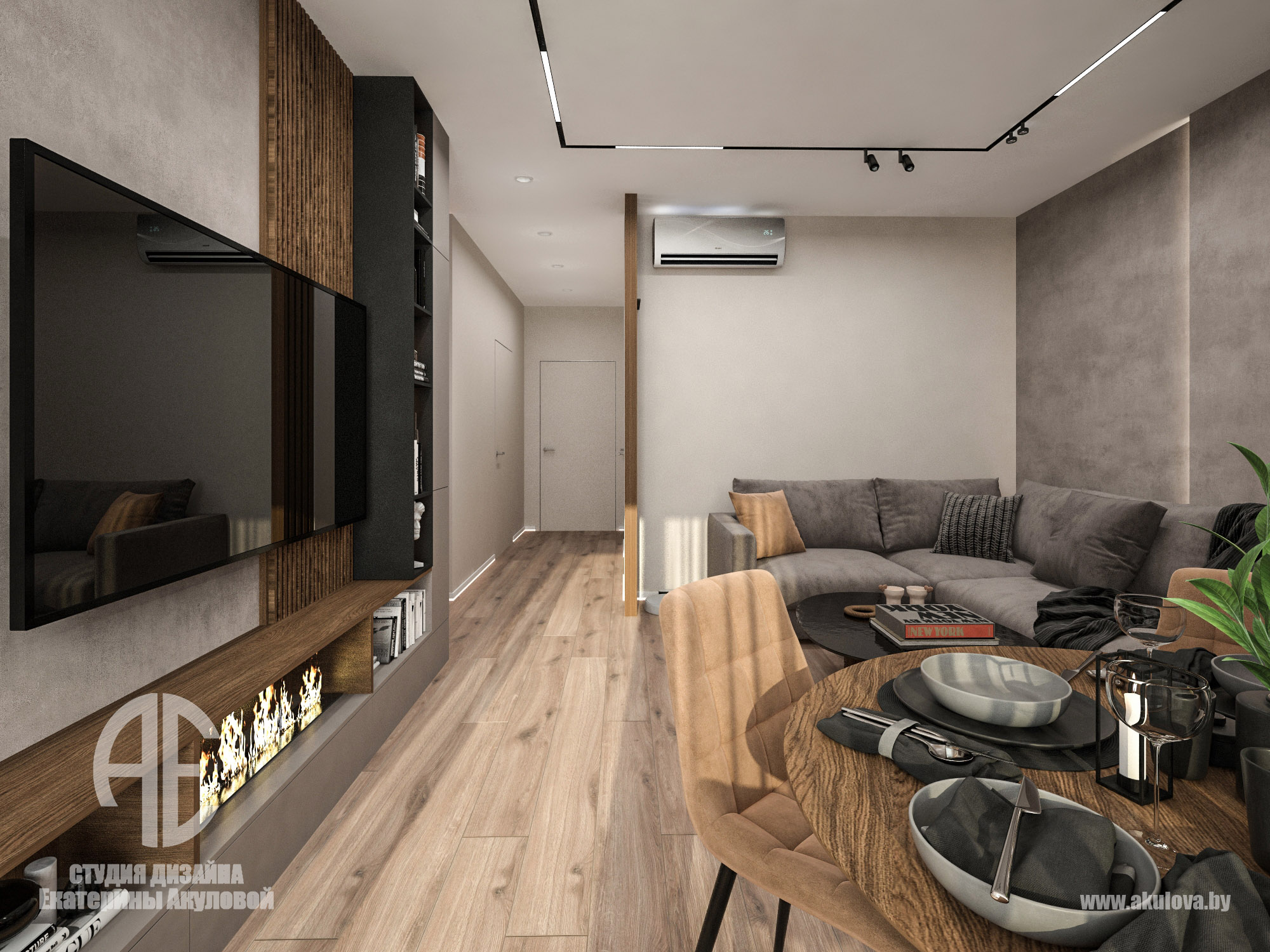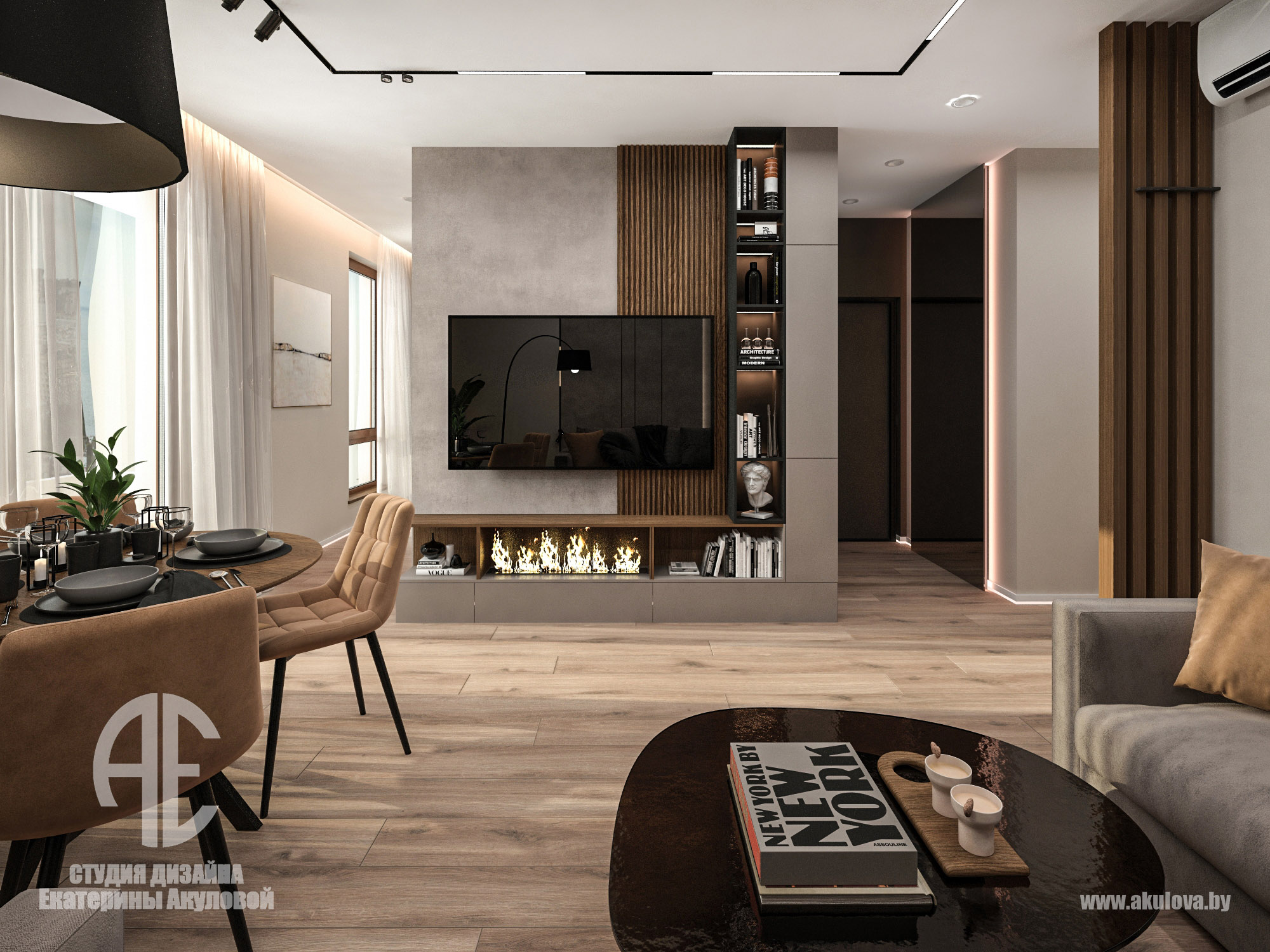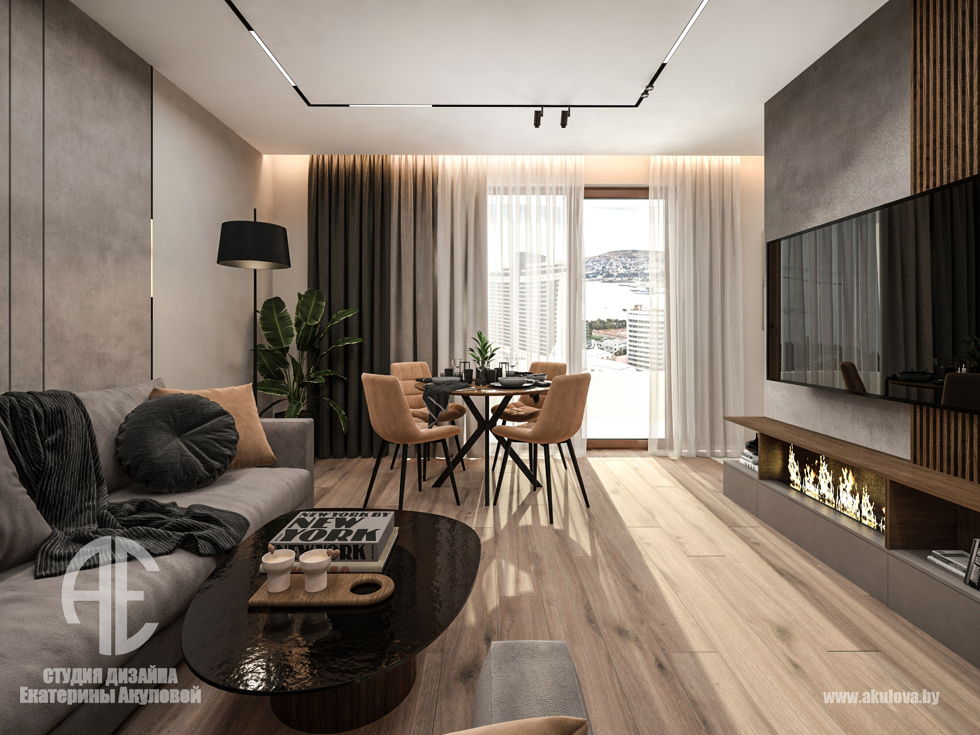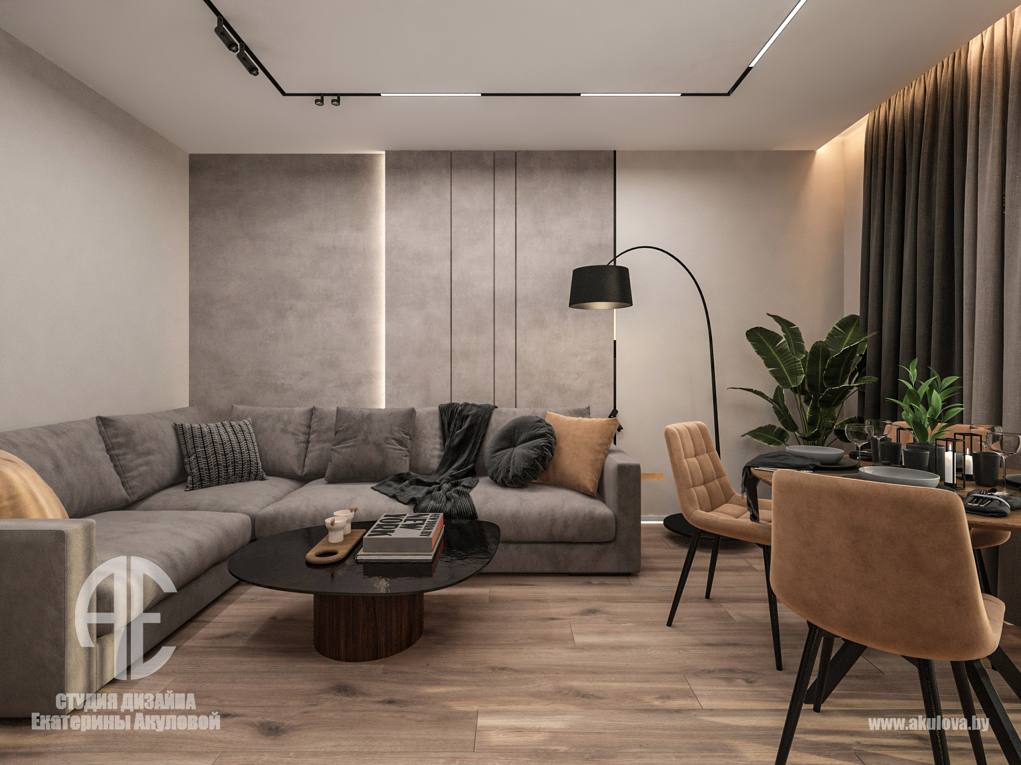 Дизайн-проект реализован в жилом комплексе Royal Residence в Варшаве и создан специально для молодого мужчины, ведущего активный и насыщенный образ жизни. Наша задача заключалась в том, чтобы создать современное пространство, где каждая деталь работает на функциональность и эстетику. Объединённое пространство гостиной и столовой решено в спокойной, выдержанной палитре. Доминируют тёплые серые, графитовые и древесные оттенки. Интерьер минималистичен, но при этом наполнен характером — за счёт выразительных текстур, мягкого освещения и правильно расставленных акцентов. Главная зона отдыха — комфортный диван с дизайнерским кофейным столом. ТВ-зона с биокамином добавляет уюта и визуального тепла. Обеденная группа на фоне панорамных окон оформлена мягкими стульями карамельного оттенка. Минимализм продолжается и в кухне — ровные фасады без ручек, встроенная техника, сдержанная цветовая гамма. Отделка выполнена с использованием светлого камня и древесных поверхностей. Благодаря интегрированной подсветке рабочей зоны, пространство выглядит лёгким и «воздушным». В ванной комнате сочетаются натуральные материалы: тёмный мрамор и тёплое дерево. Душевая зона оформлена в спа-стиле: скрытые полки, аккуратное освещение и стеклянная перегородка создают атмосферу уединения и расслабления. Стильная раковина-чаша и вместительная тумба завершают образ функционального и эстетичного пространства.