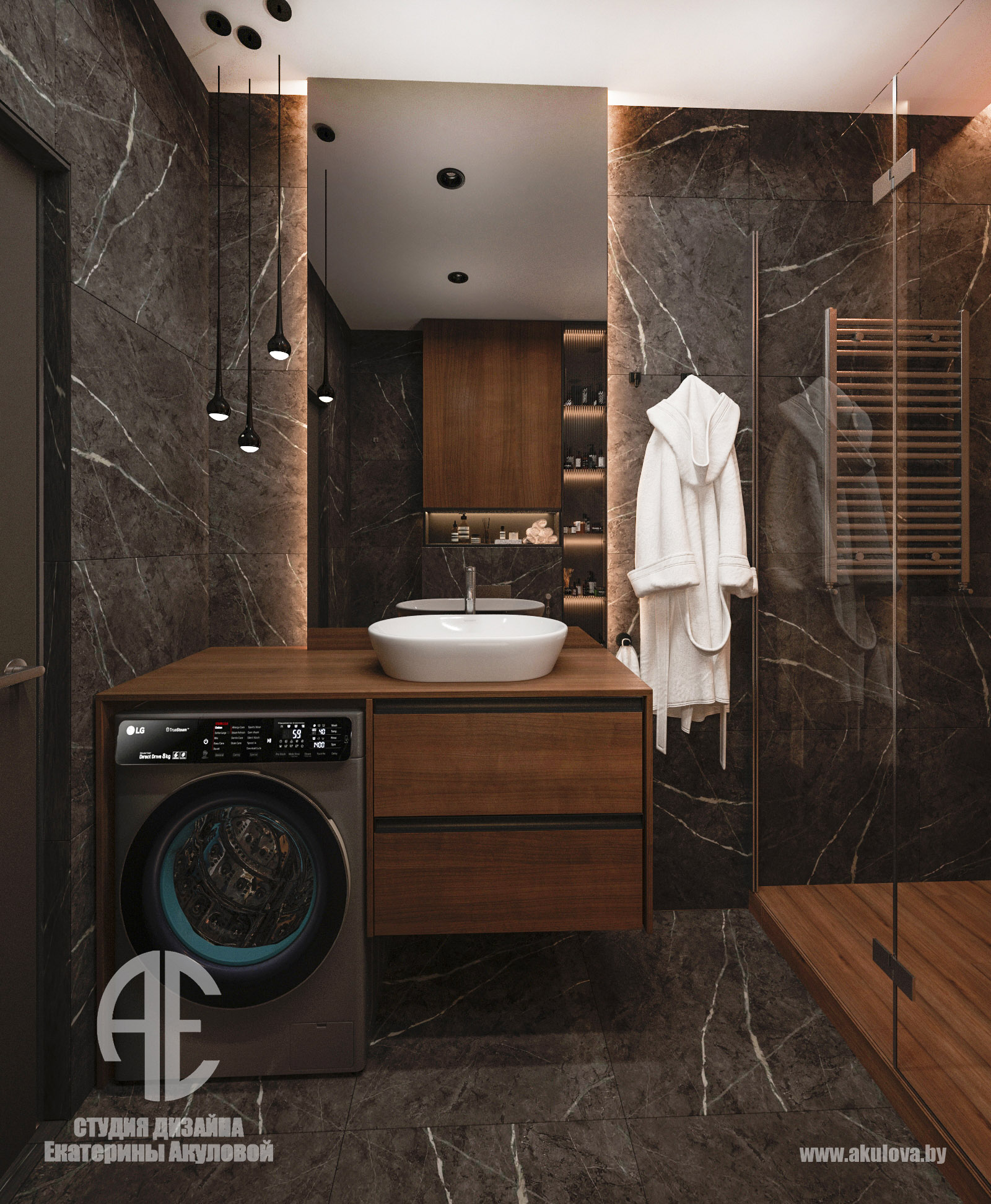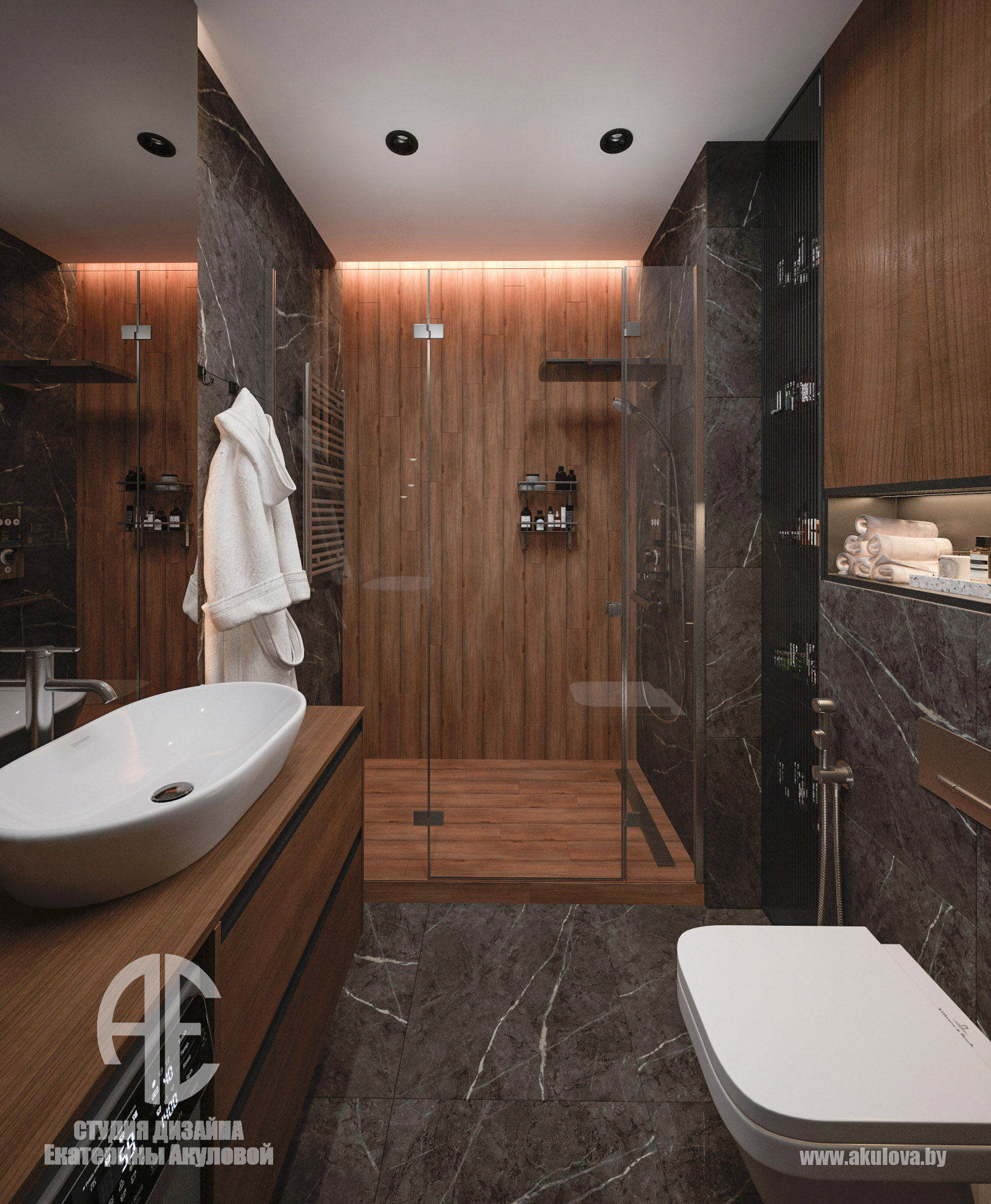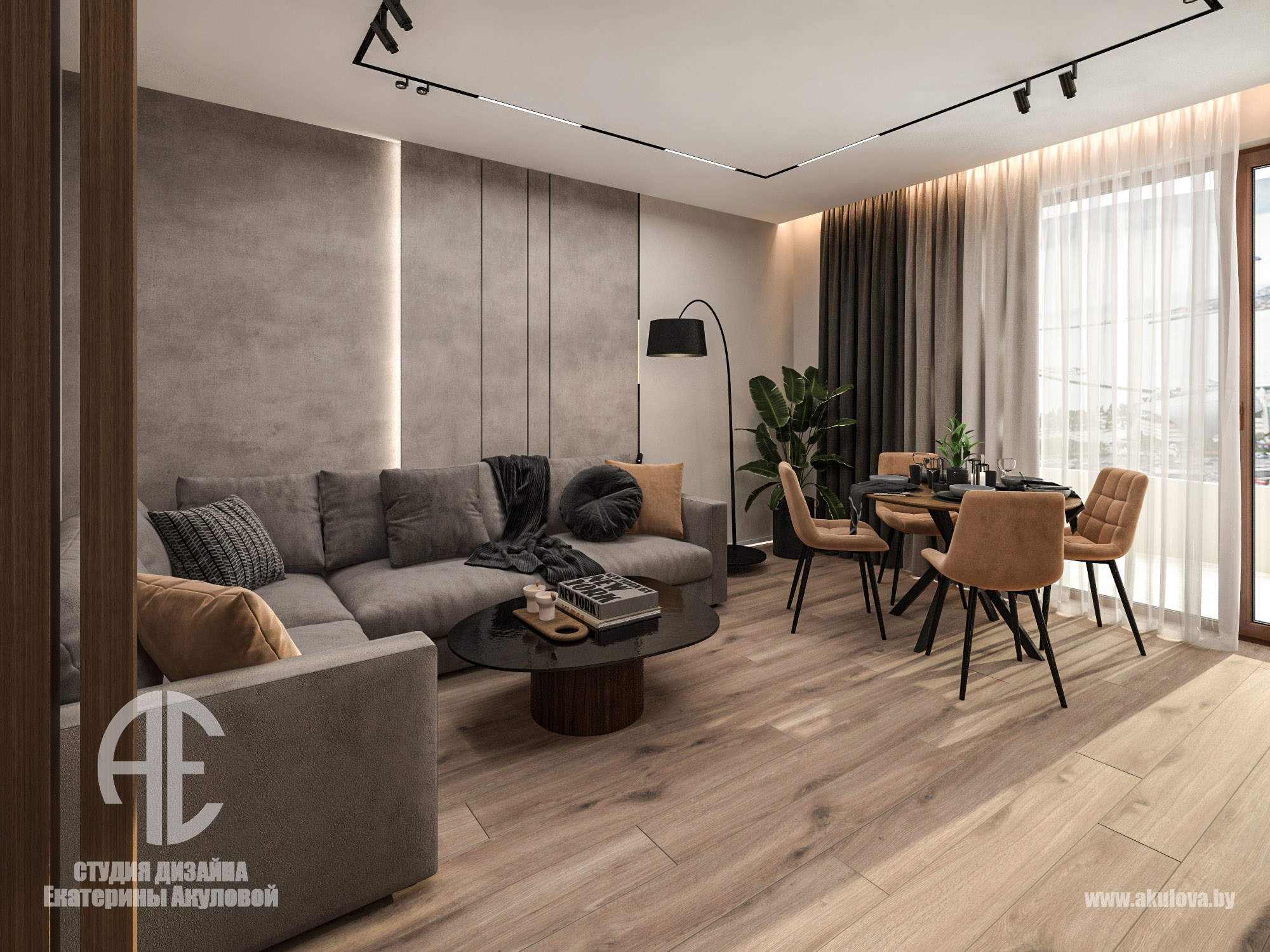 Дизайн-проект реализован в жилом комплексе Royal Residence в Варшаве и создан специально для молодого мужчины, ведущего активный и насыщенный образ жизни. Наша задача заключалась в том, чтобы создать современное пространство, где каждая деталь работает на функциональность и эстетику. Объединённое пространство гостиной и столовой решено в спокойной, выдержанной палитре. Доминируют тёплые серые, графитовые и древесные оттенки. Интерьер минималистичен, но при этом наполнен характером — за счёт выразительных текстур, мягкого освещения и правильно расставленных акцентов. Главная зона отдыха — комфортный диван с дизайнерским кофейным столом. ТВ-зона с биокамином добавляет уюта и визуального тепла. Обеденная группа на фоне панорамных окон оформлена мягкими стульями карамельного оттенка. Минимализм продолжается и в кухне — ровные фасады без ручек, встроенная техника, сдержанная цветовая гамма. Отделка выполнена с использованием светлого камня и древесных поверхностей. Благодаря интегрированной подсветке рабочей зоны, пространство выглядит лёгким и «воздушным». В ванной комнате сочетаются натуральные материалы: тёмный мрамор и тёплое дерево. Душевая зона оформлена в спа-стиле: скрытые полки, аккуратное освещение и стеклянная перегородка создают атмосферу уединения и расслабления. Стильная раковина-чаша и вместительная тумба завершают образ функционального и эстетичного пространства.