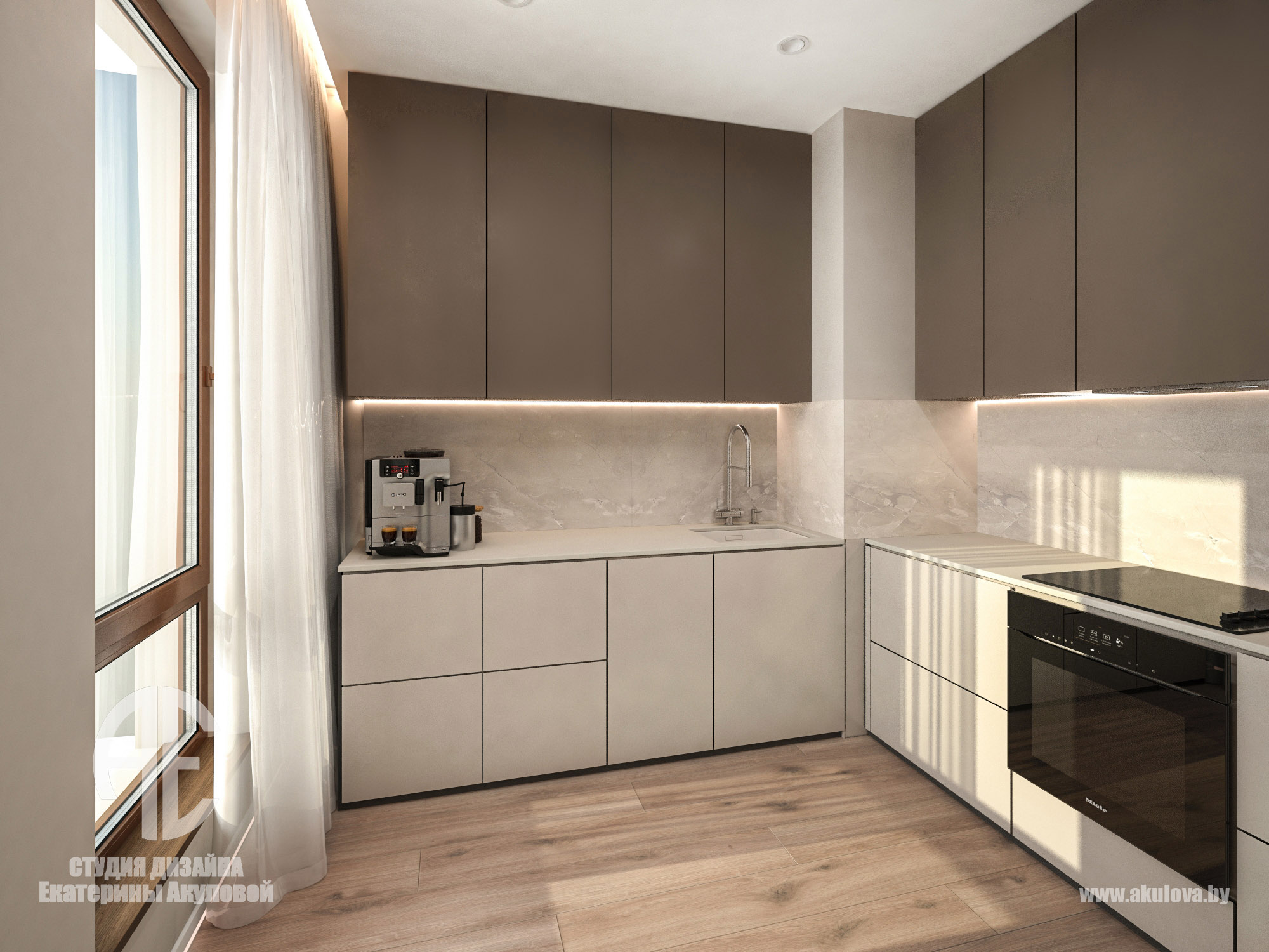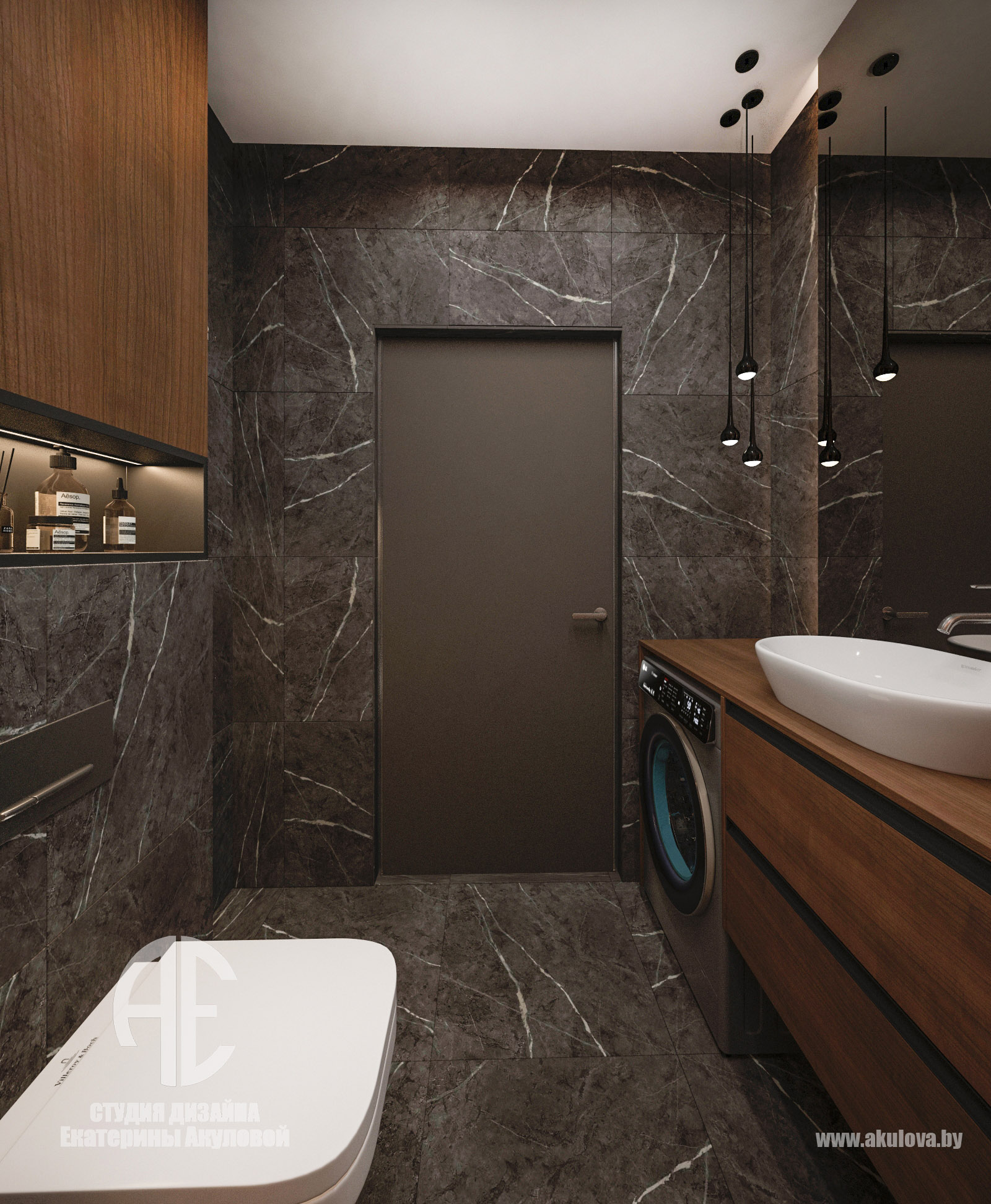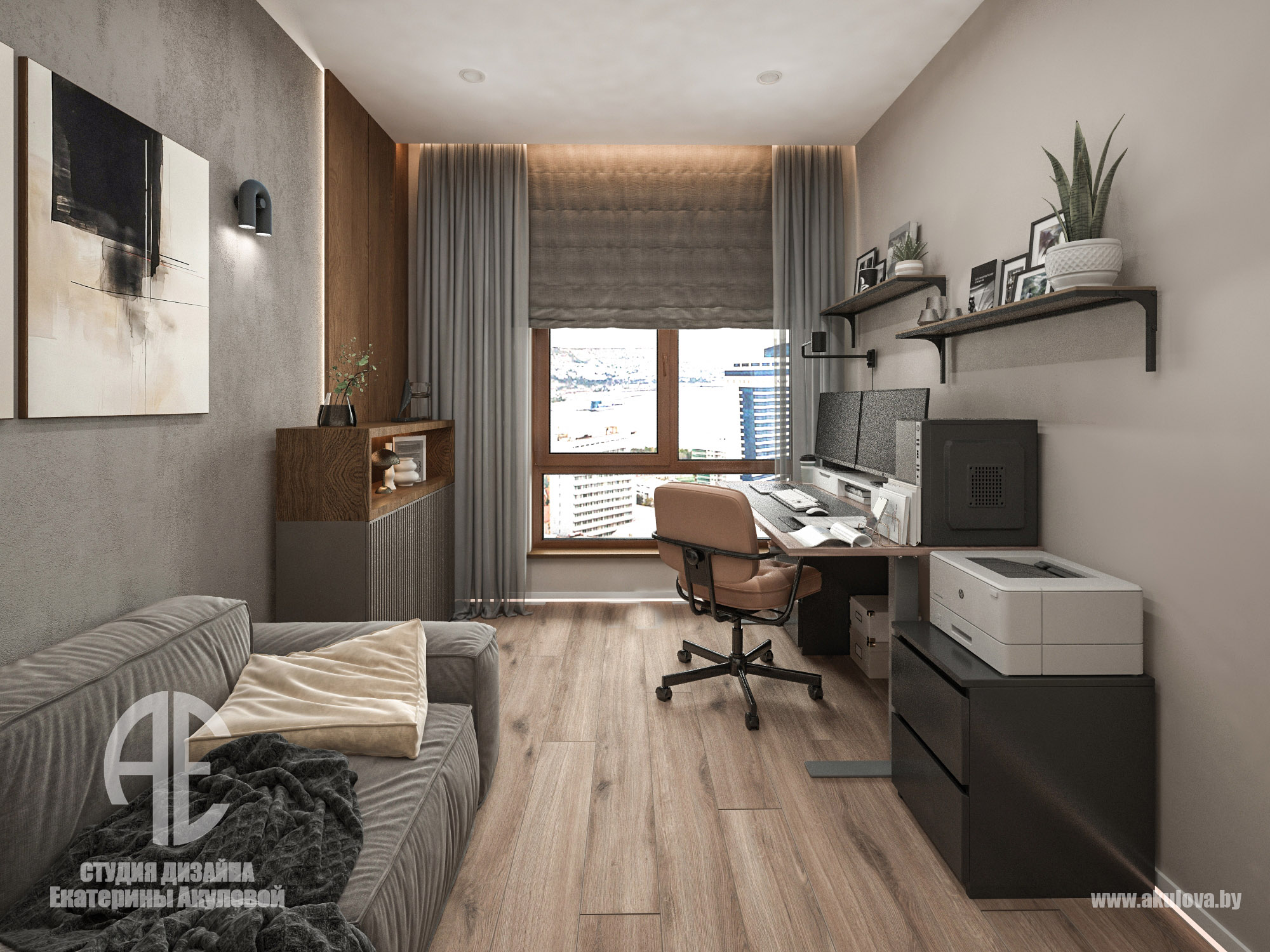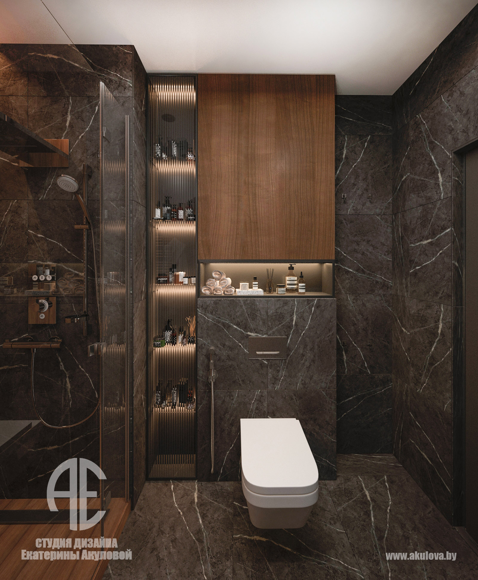Дизайн-проект реализован в жилом комплексе Royal Residence в Варшаве и создан специально для молодого мужчины, ведущего активный и насыщенный образ жизни. Наша задача заключалась в том, чтобы создать современное пространство, где каждая деталь работает на функциональность и эстетику. Объединённое пространство гостиной и столовой решено в спокойной, выдержанной палитре. Доминируют тёплые серые, графитовые и древесные оттенки. Интерьер минималистичен, но при этом наполнен характером — за счёт выразительных текстур, мягкого освещения и правильно расставленных акцентов. Главная зона отдыха — комфортный диван с дизайнерским кофейным столом. ТВ-зона с биокамином добавляет уюта и визуального тепла. Обеденная группа на фоне панорамных окон оформлена мягкими стульями карамельного оттенка. Минимализм продолжается и в кухне — ровные фасады без ручек, встроенная техника, сдержанная цветовая гамма. Отделка выполнена с использованием светлого камня и древесных поверхностей. Благодаря интегрированной подсветке рабочей зоны, пространство выглядит лёгким и «воздушным». В ванной комнате сочетаются натуральные материалы: тёмный мрамор и тёплое дерево. Душевая зона оформлена в спа-стиле: скрытые полки, аккуратное освещение и стеклянная перегородка создают атмосферу уединения и расслабления. Стильная раковина-чаша и вместительная тумба завершают образ функционального и эстетичного пространства.