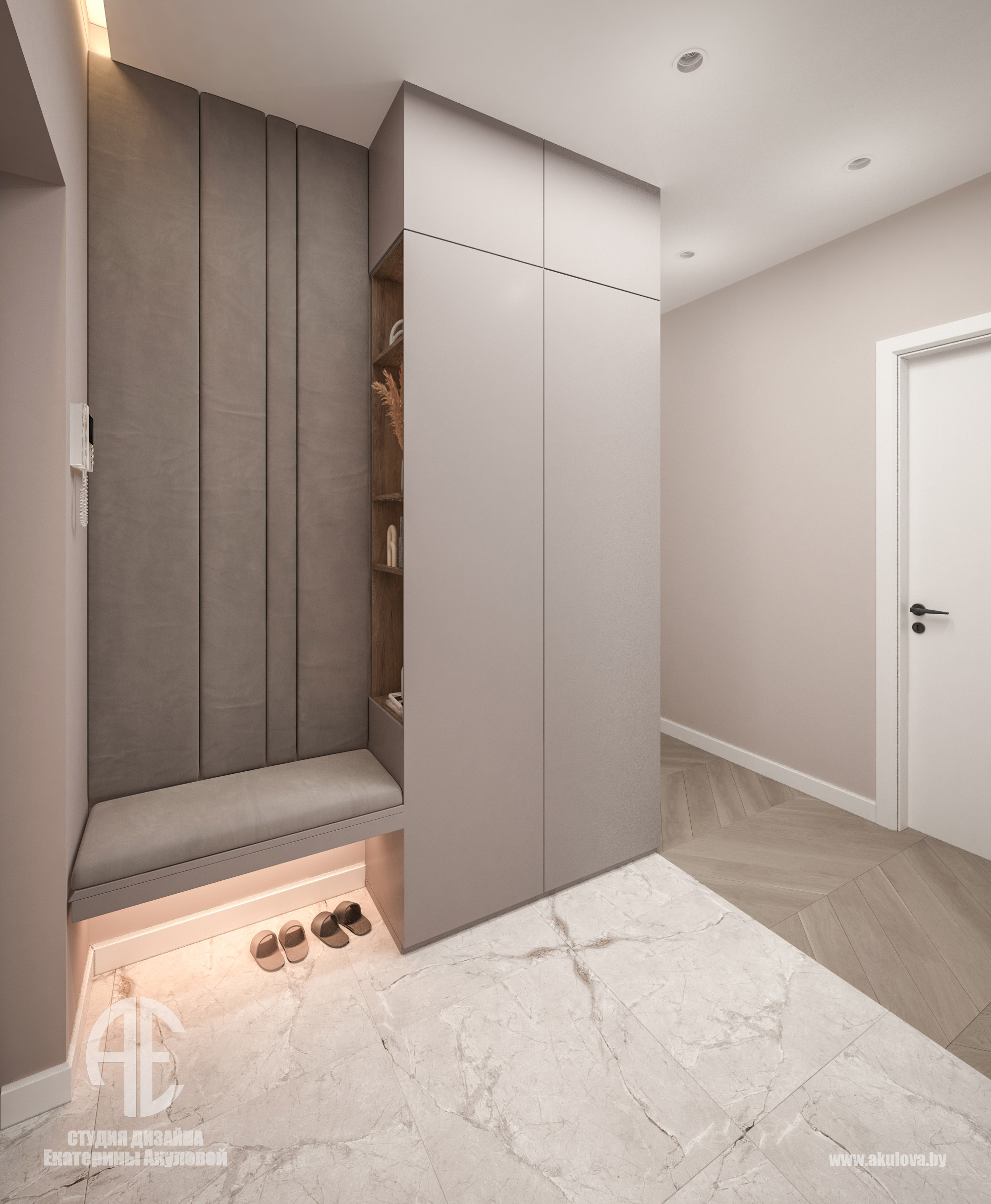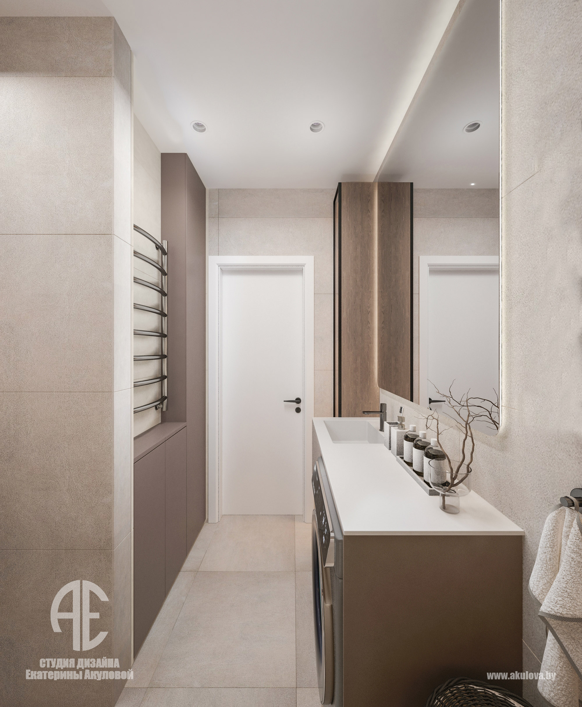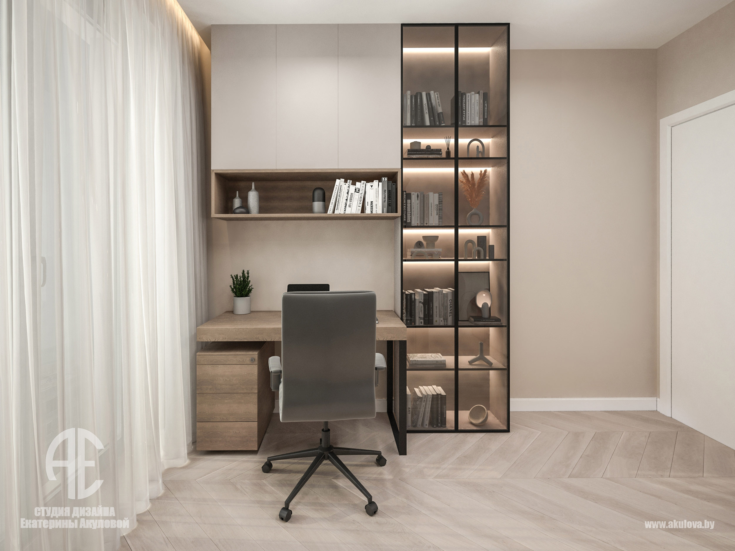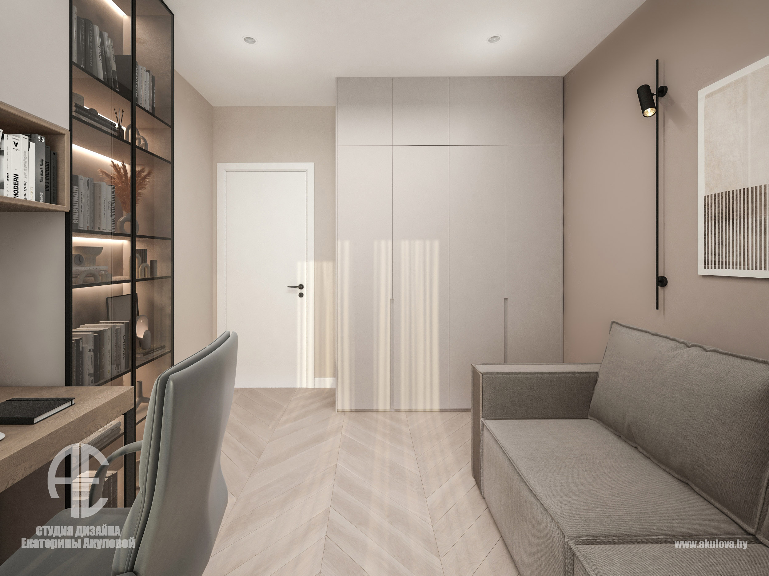 Дизайн интерьера двухкомнатной квартиры для молодой семьи разрабатывался в ЖК «Северный Берег», расположенного в уникальном месте на берегу Цнянского водохранилища. Первоначальная планировка квартиры предусмотрена застройщиком, как квартира со свободной планировкой, что дает расширенные возможности по организации внутреннего пространства. Преимущество данной квартиры в том, что квартира имеет два достаточно больших санузла, расположенных в разных частях квартиры, что дает возможность организовать планировку с выделенной мастер-спальней, получив при этом приватный блок для хозяев, включающий не только спальню, но и отдельную ванную комнату и гардеробную. В итоговом планировочном решении из общего пространства выделили зону кухни с выделенной зоной гостиной, мастер-спальню и отдельный кабинет. Прихожая отделена от жилых зон, также дополнительно выделена комната для хозяйственного назначения.