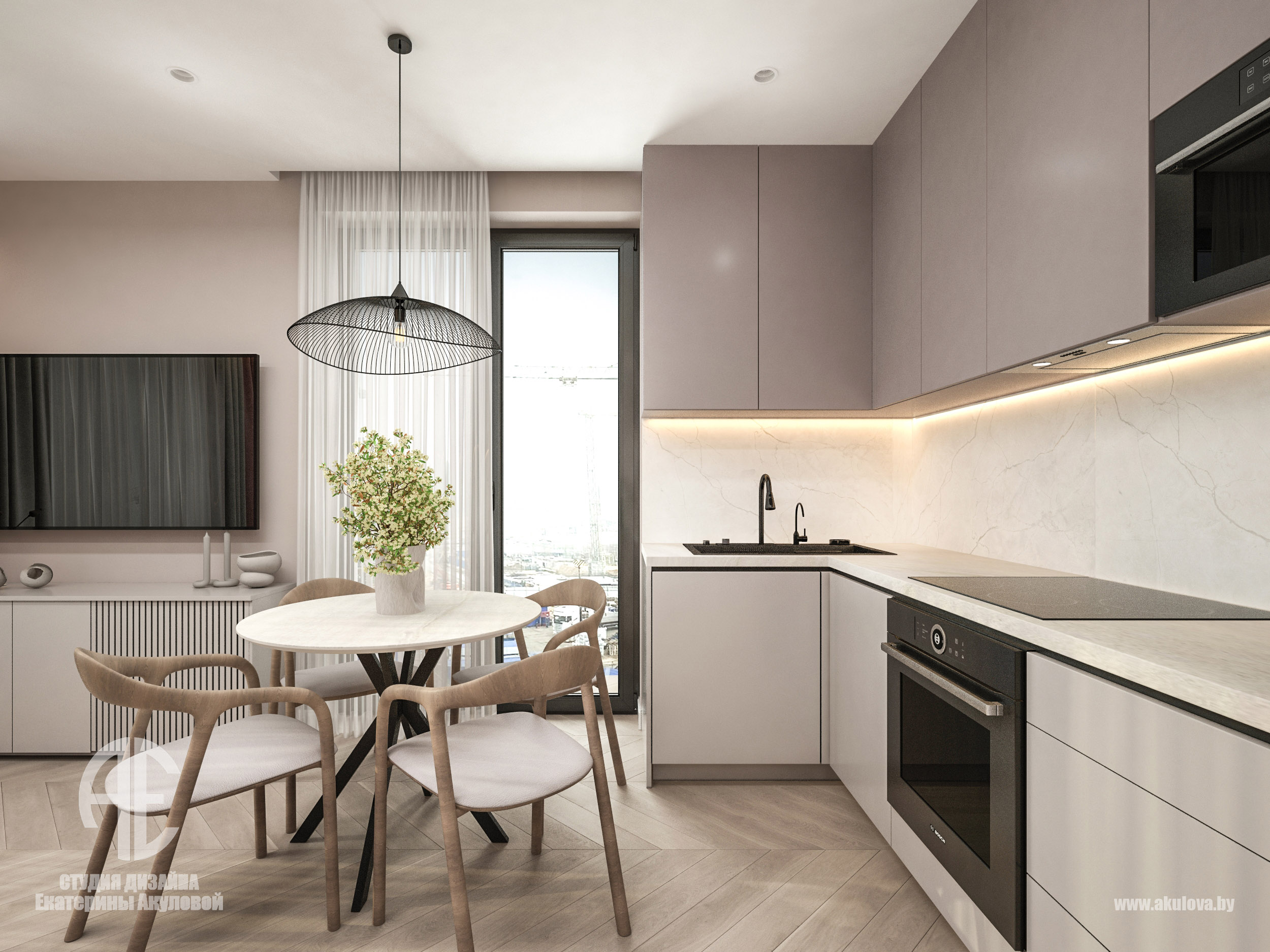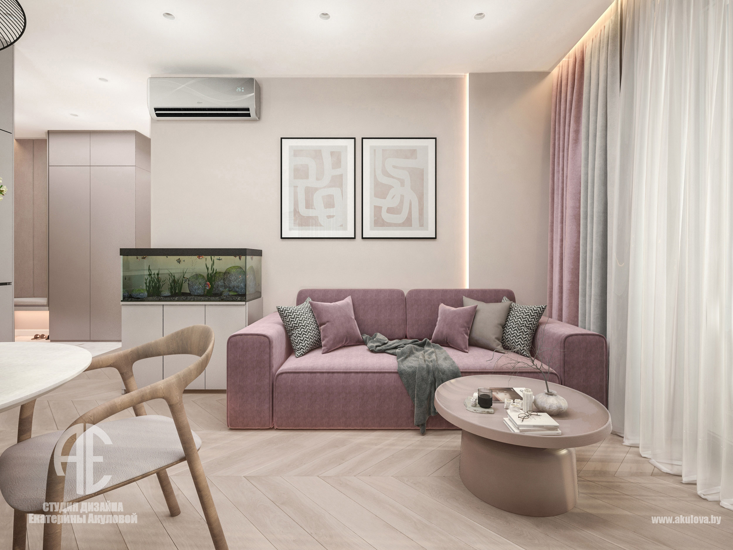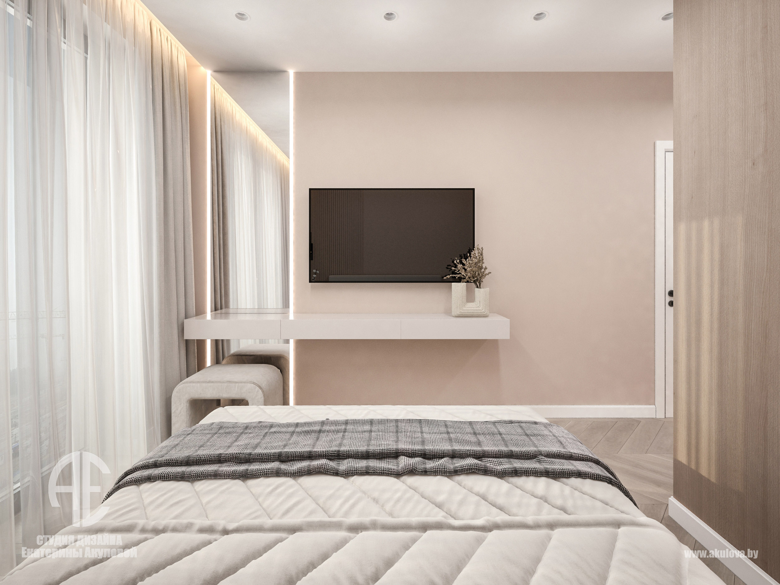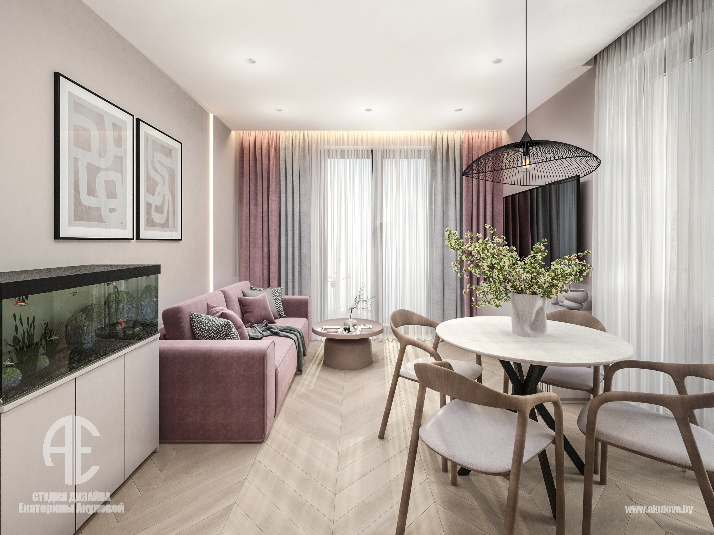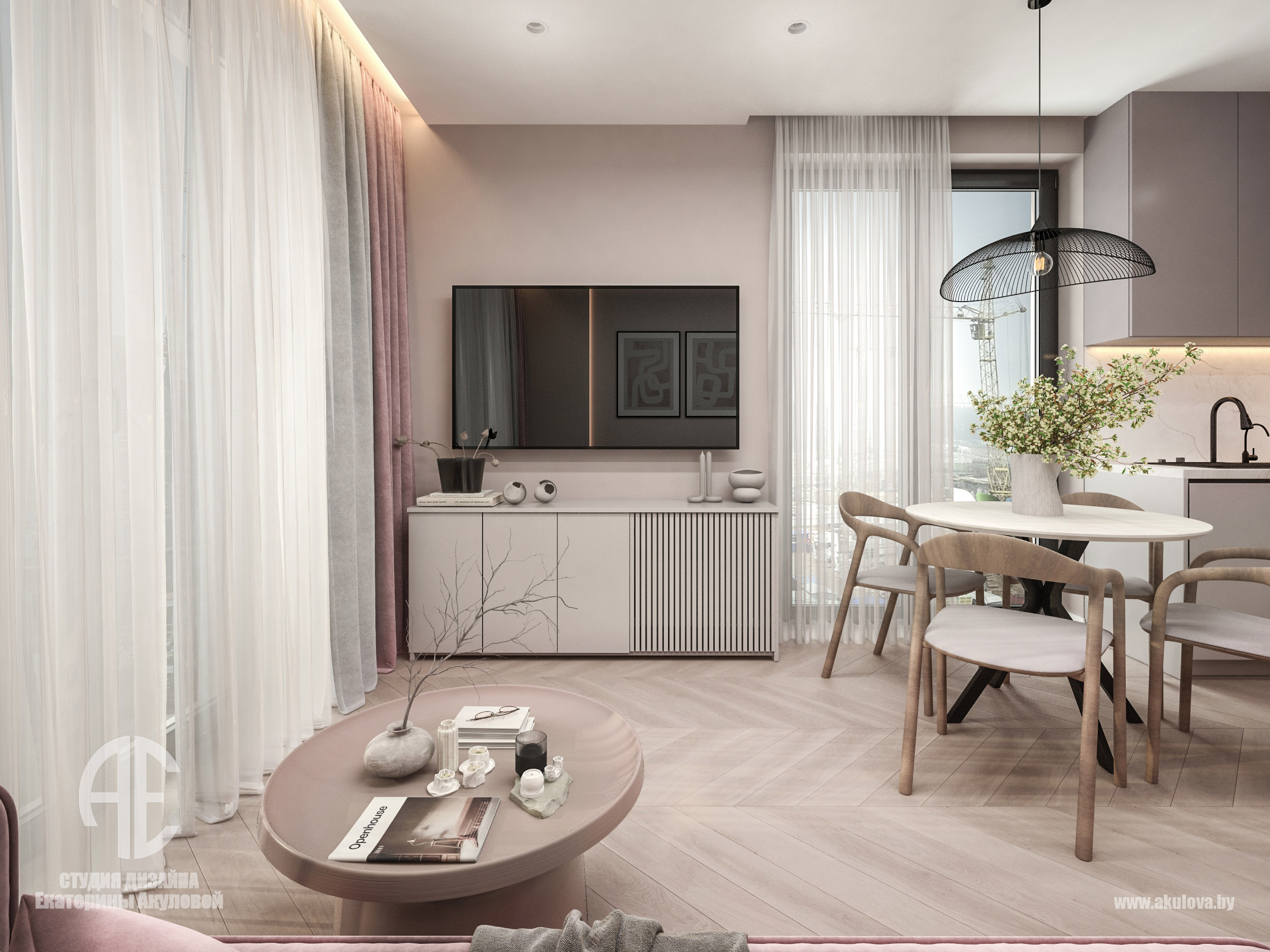 Стилистическое решение в данном интерьере разрабатывалось в современном стиле в цветовой гамме пантон с сочетанием пыльной розы, дающее воплощение спокойной элегантности. Пыльная роза прекрасно сочетается с более нейтральными оттенками, создавая гармоничные и элегантные интерьеры. Цвет пыльной розы в текстиле воспринимается как глоток свежего воздуха в интерьере. Данный оттенок достаточно универсальный и способен преобразить любой интерьер и позволит создать дом Вашей мечты, где каждый предмет будет наполнен красотой и особым смыслом. Главное помнить о балансе и не бояться экспериментировать.