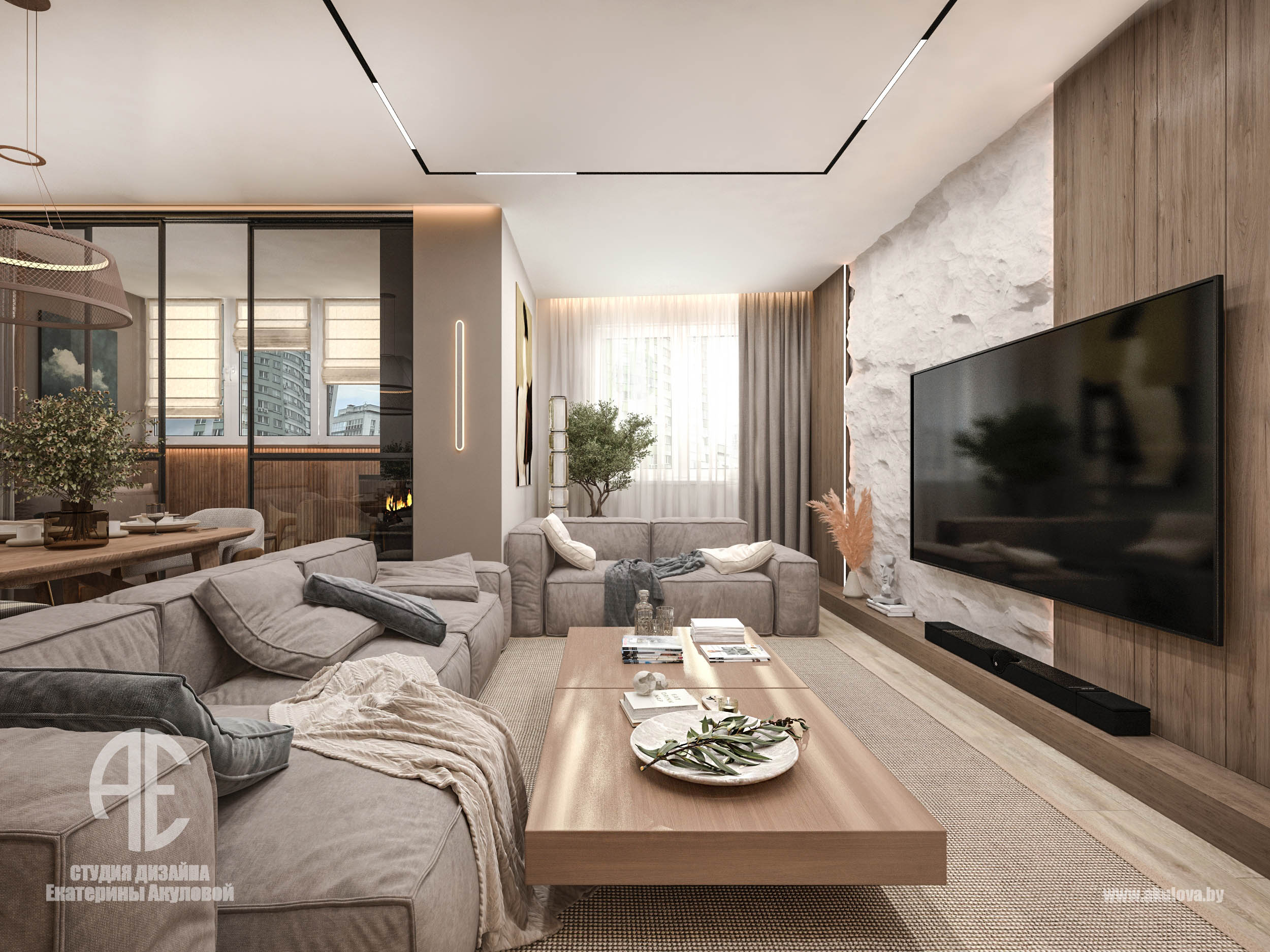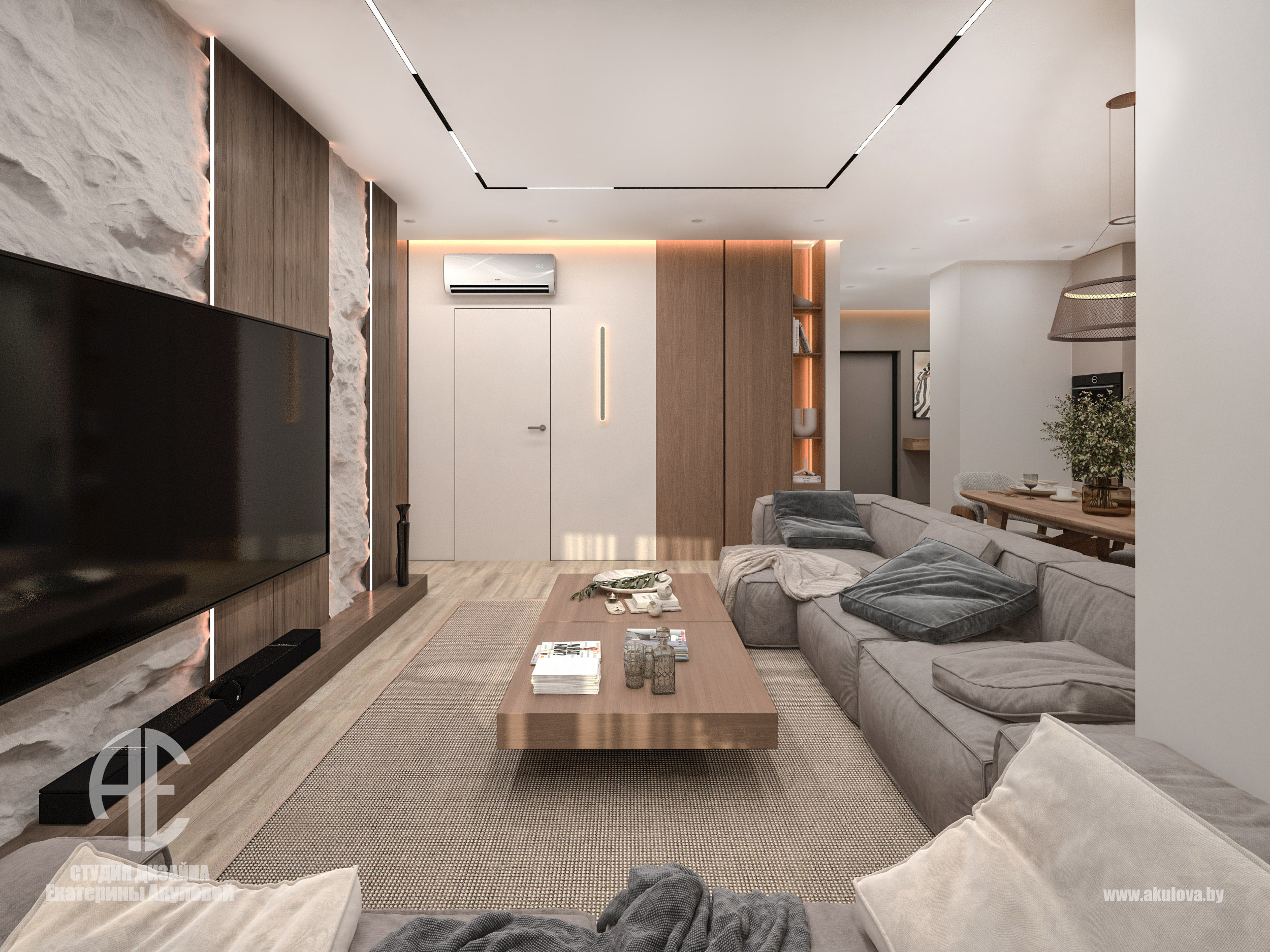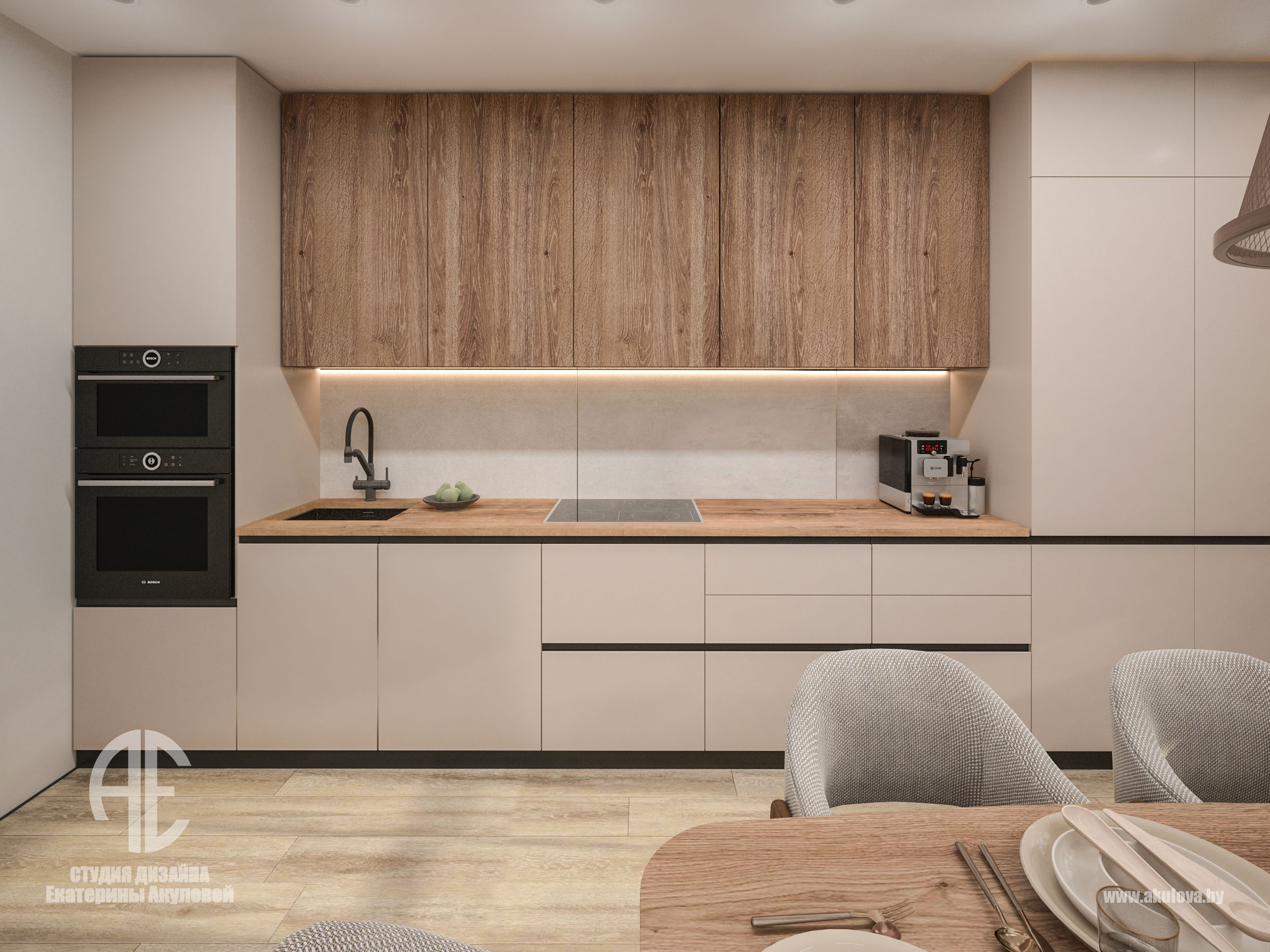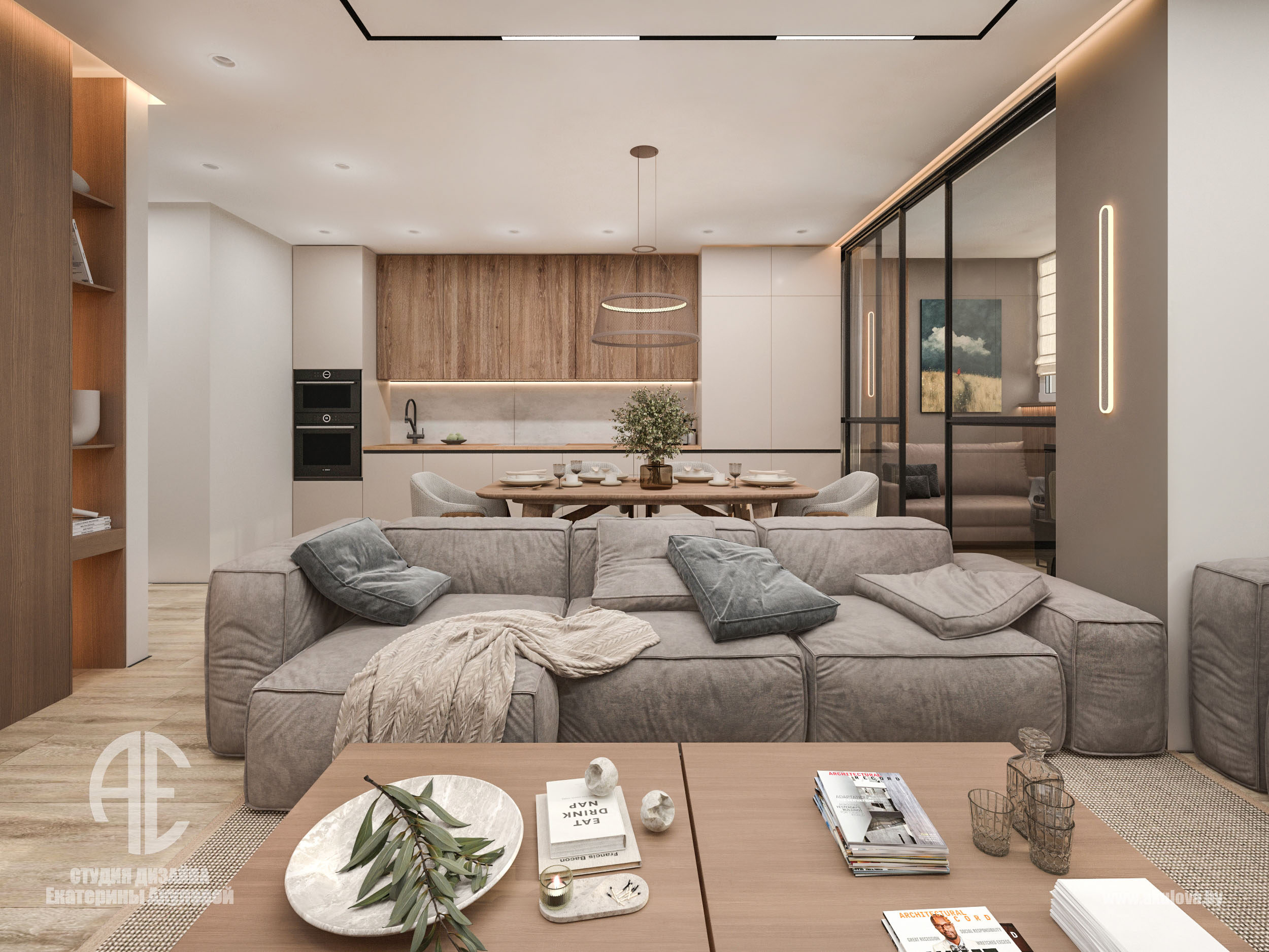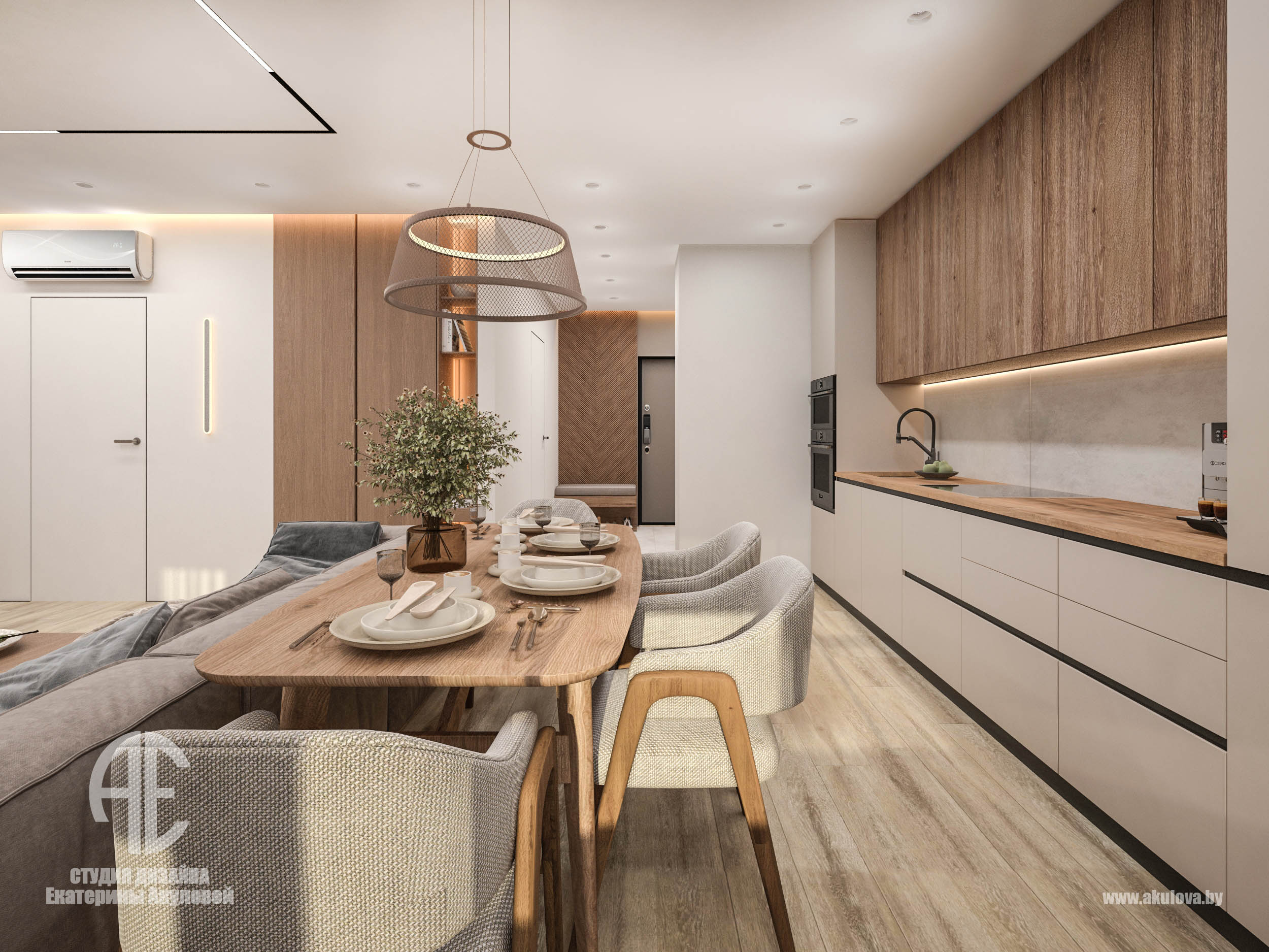 Центром квартиры стала гостиная, совмещённая с кухней — светлая и открытая зона для повседневной жизни и приёма гостей. В рамках дизайн-проекта особое внимание уделено эргономике кухни, системам хранения и визуальной целостности интерьера. Лаконичные фасады, встроенная техника, продуманное освещение и минималистичная мебель формируют современный интерьер квартиры с чистыми линиями и спокойной атмосферой. Обеденная группа объединяет кухонную и гостиную зоны, создавая удобное пространство для семейного общения.