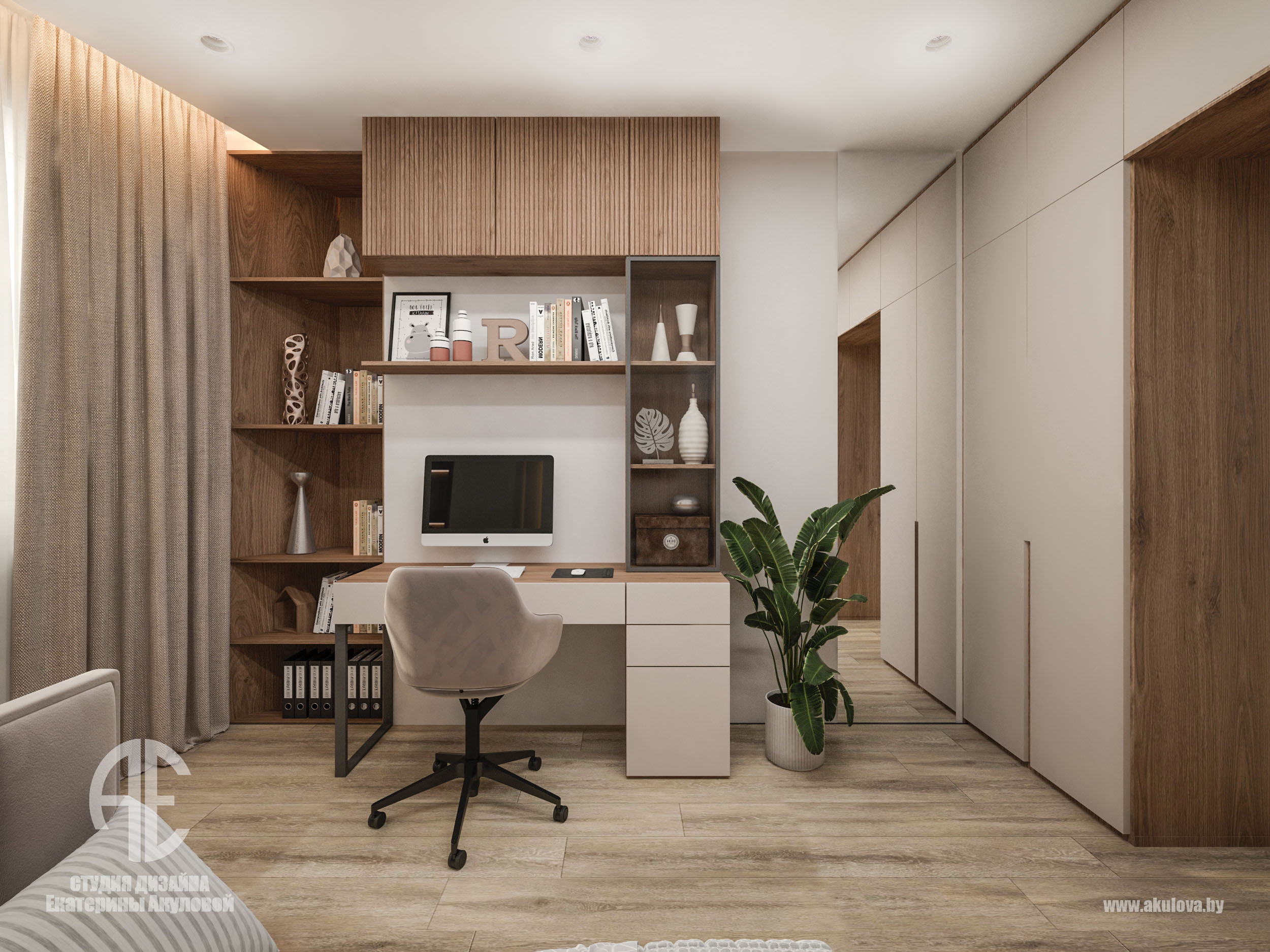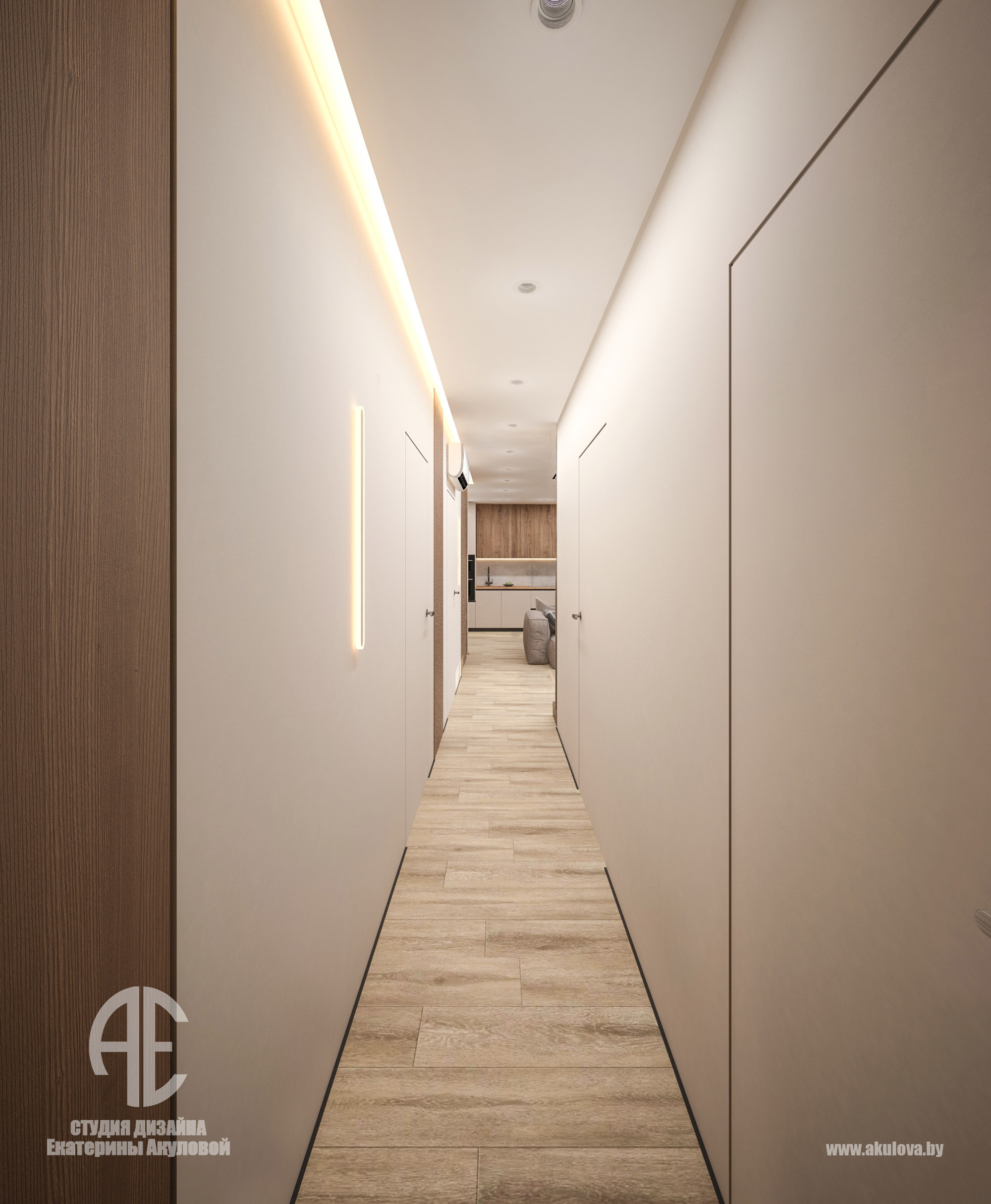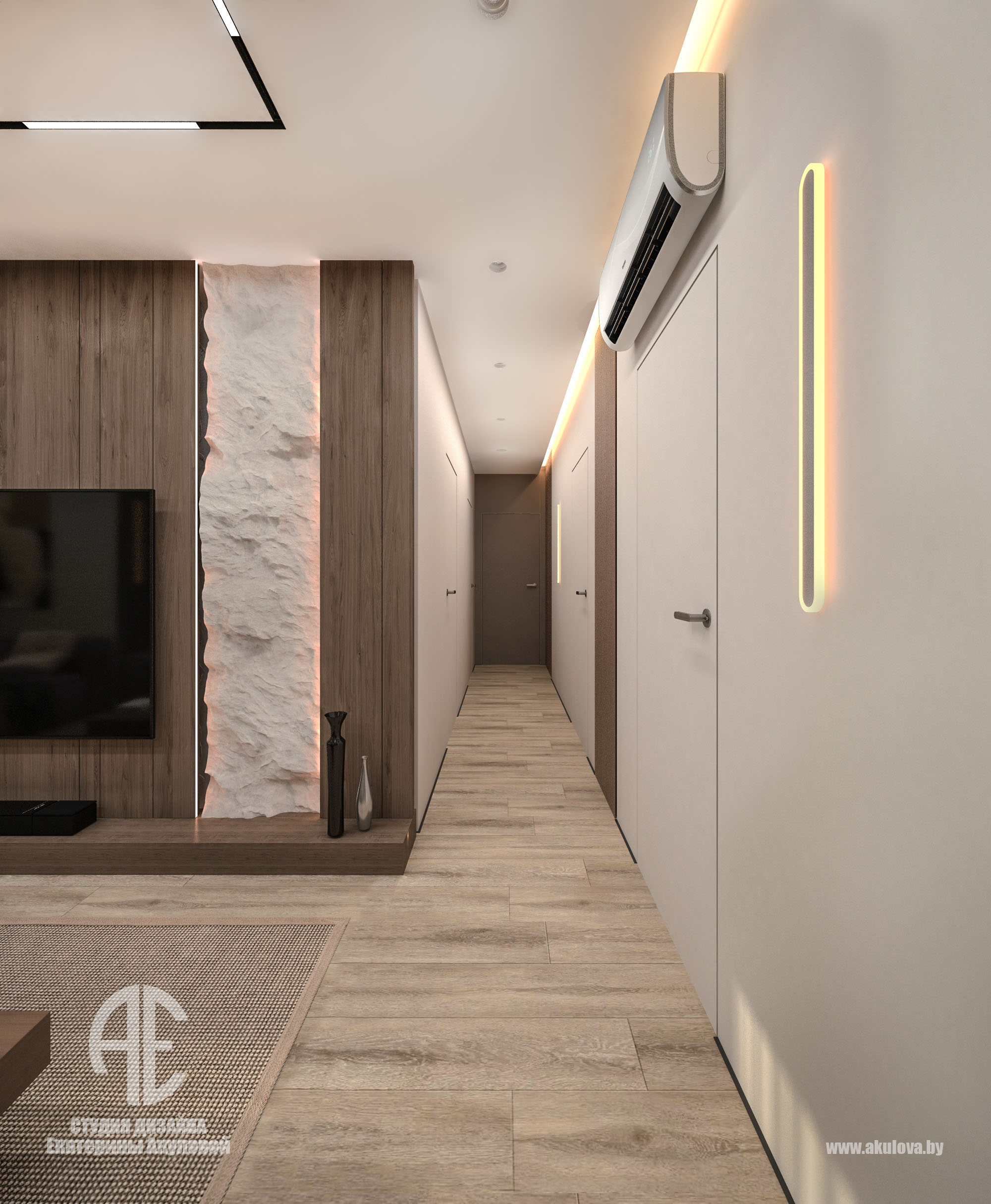 Цветовое решение построено на сочетании светлых нейтральных оттенков, натуральной древесной текстуры и графитовых акцентов. Такое сочетание делает интерьер актуальным и визуально лёгким, придавая ему характер и глубину. Натуральные материалы и тёплая подсветка усиливают ощущение уюта, а продуманная 3D визуализация позволила заранее проработать баланс цвета, света и фактур.