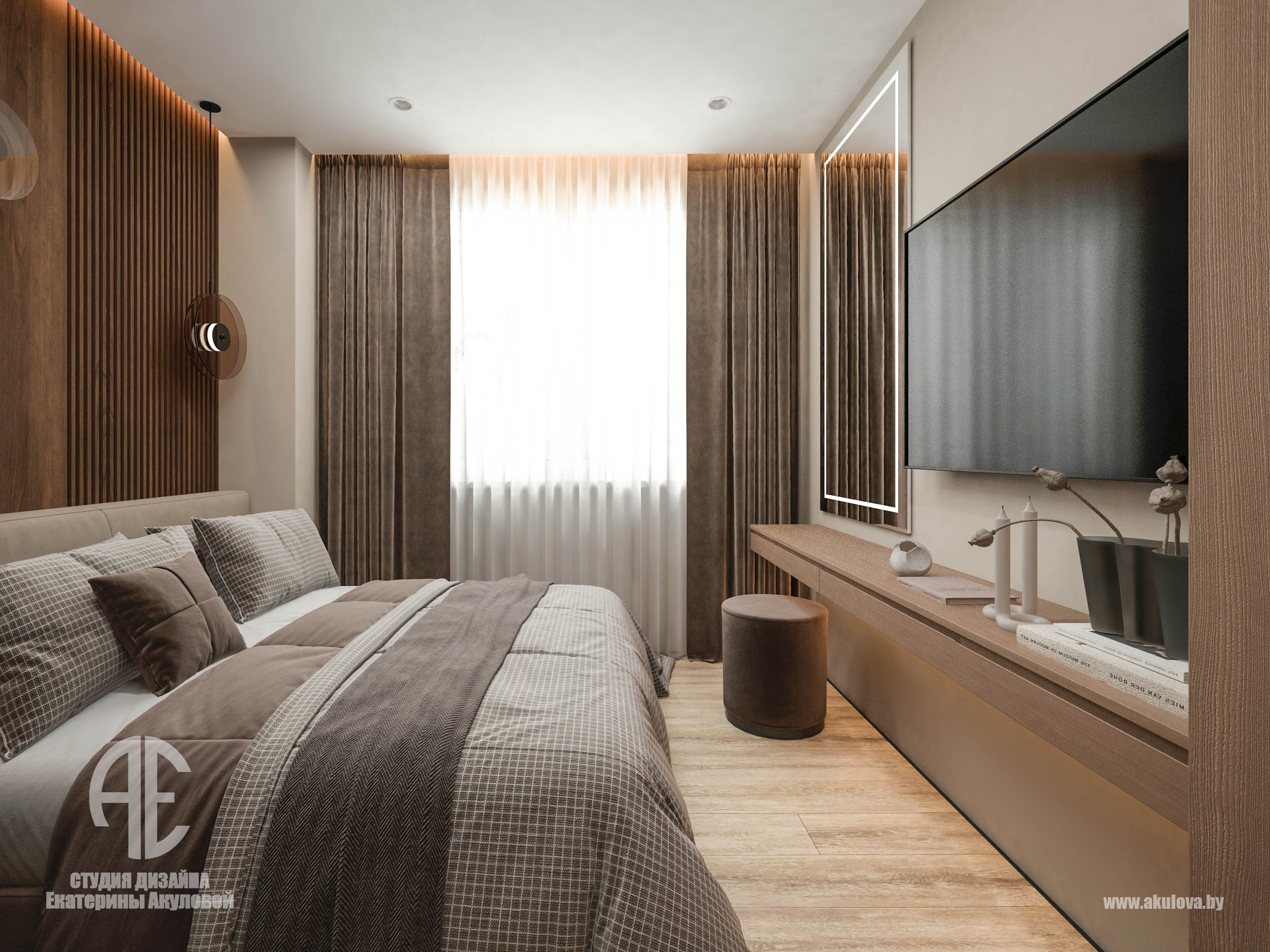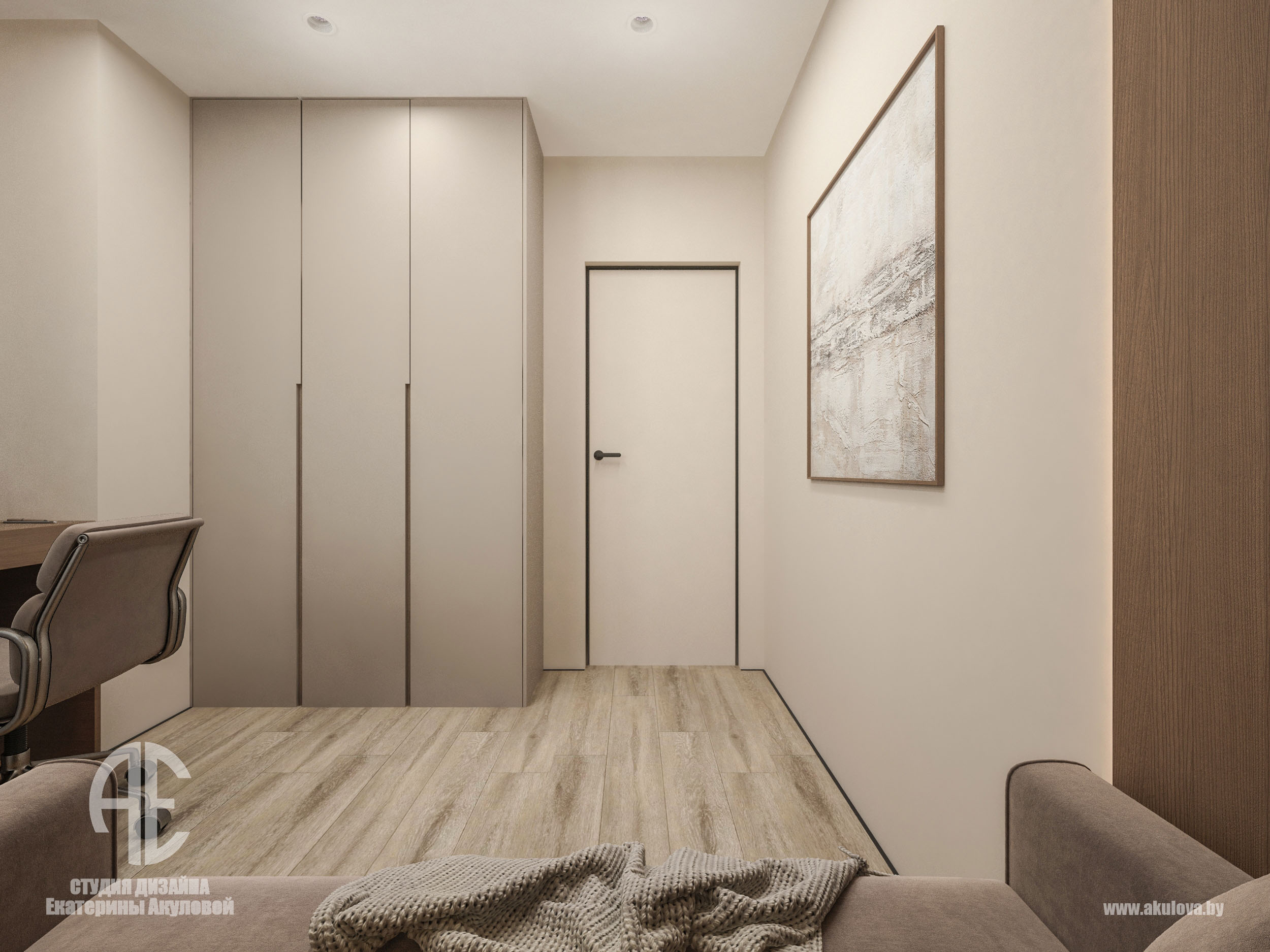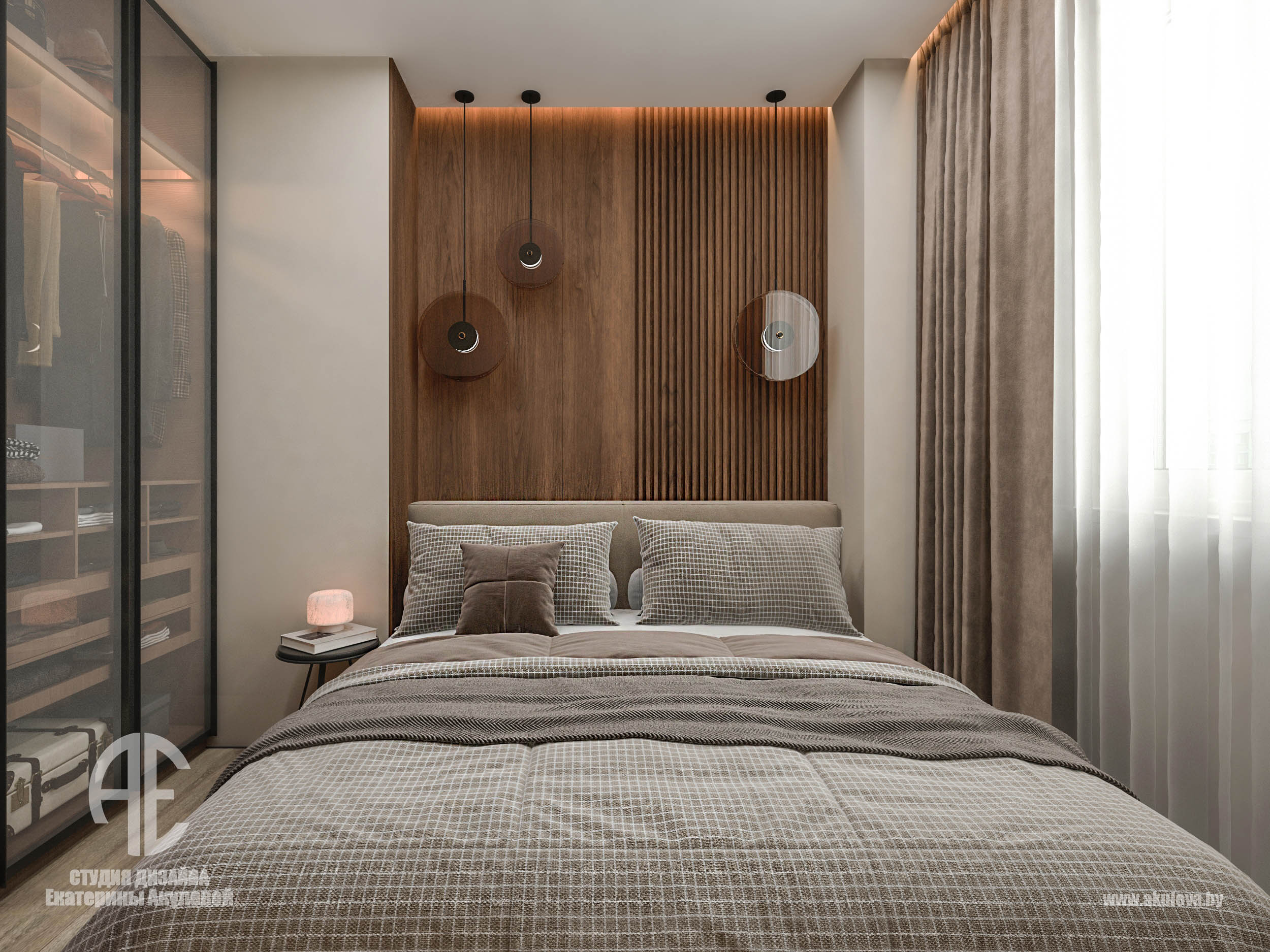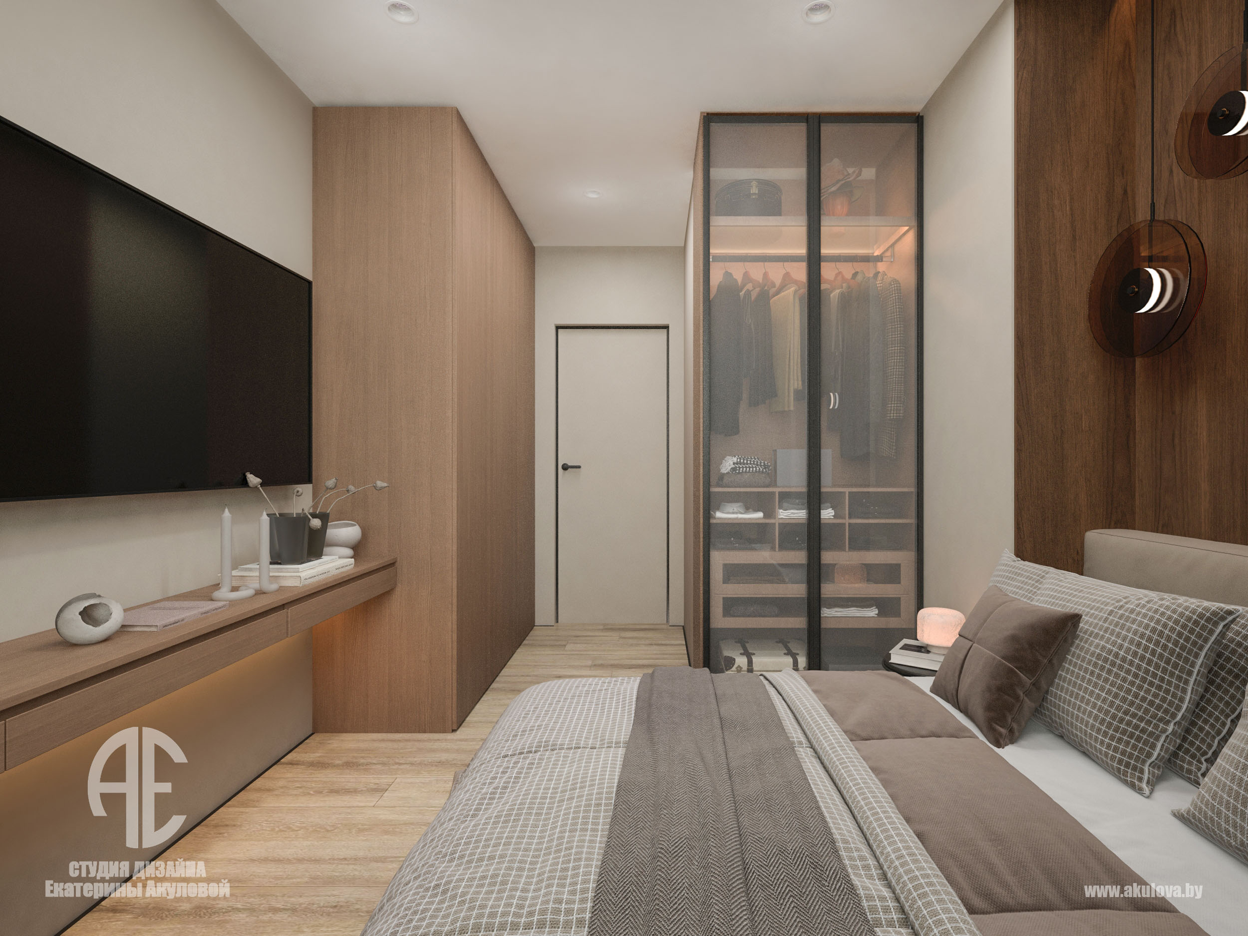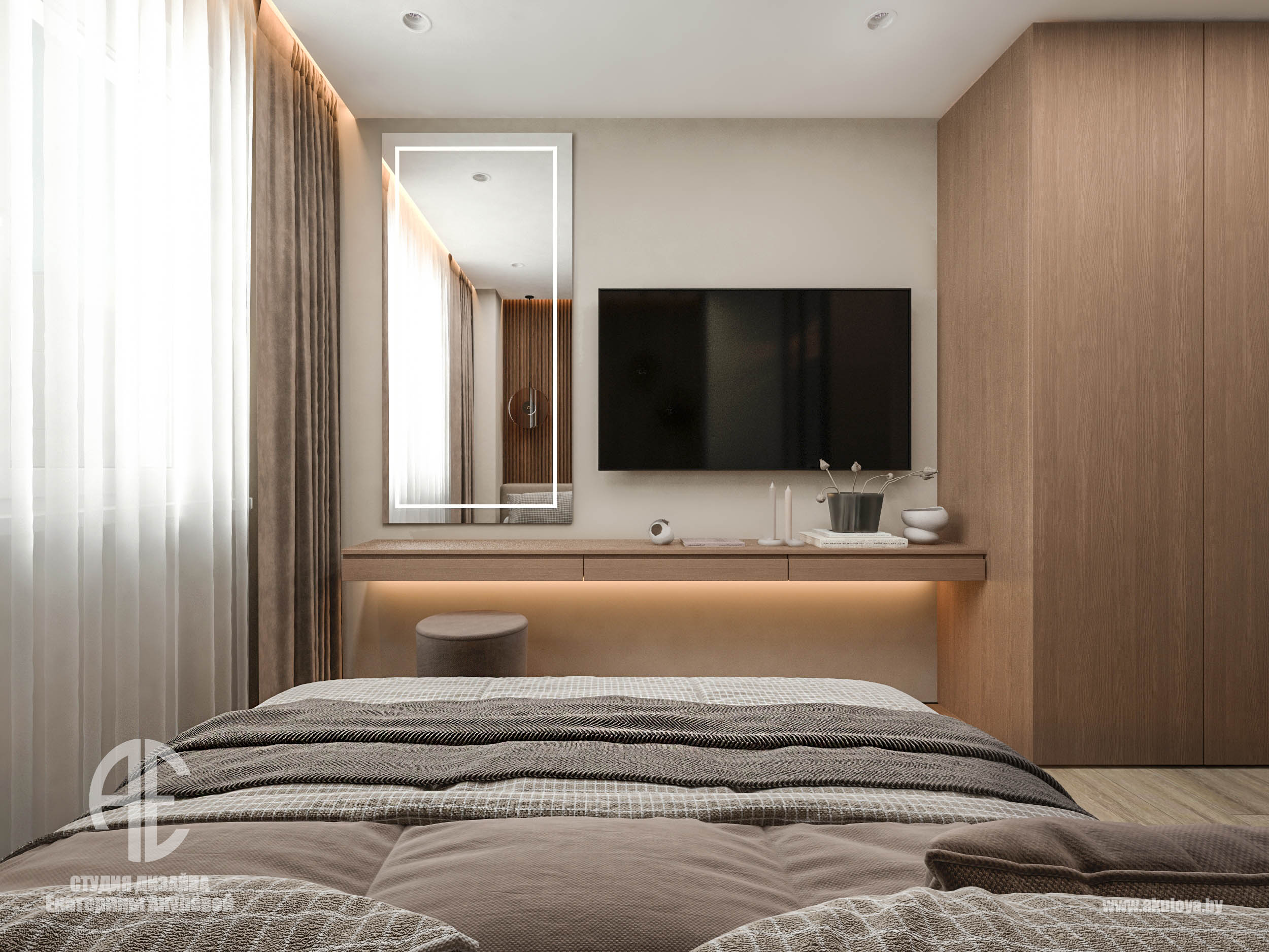 Спальня решена в спокойной гамме и ориентирована на создание приватной, комфортной атмосферы. Минимум декора, встроенные системы хранения и мягкий текстиль поддерживают общую концепцию современного дизайна интерьера. Отдельная гардеробная повышает функциональность квартиры и позволяет организовать хранение без перегрузки жилых помещений.
