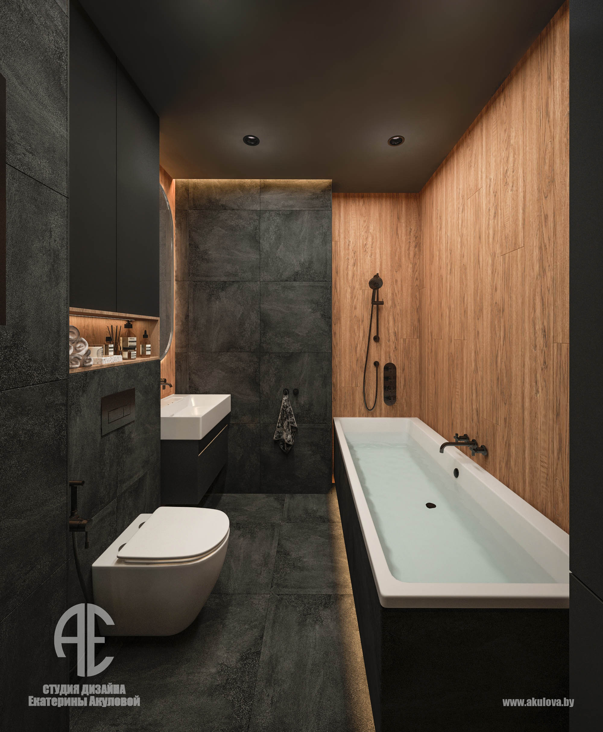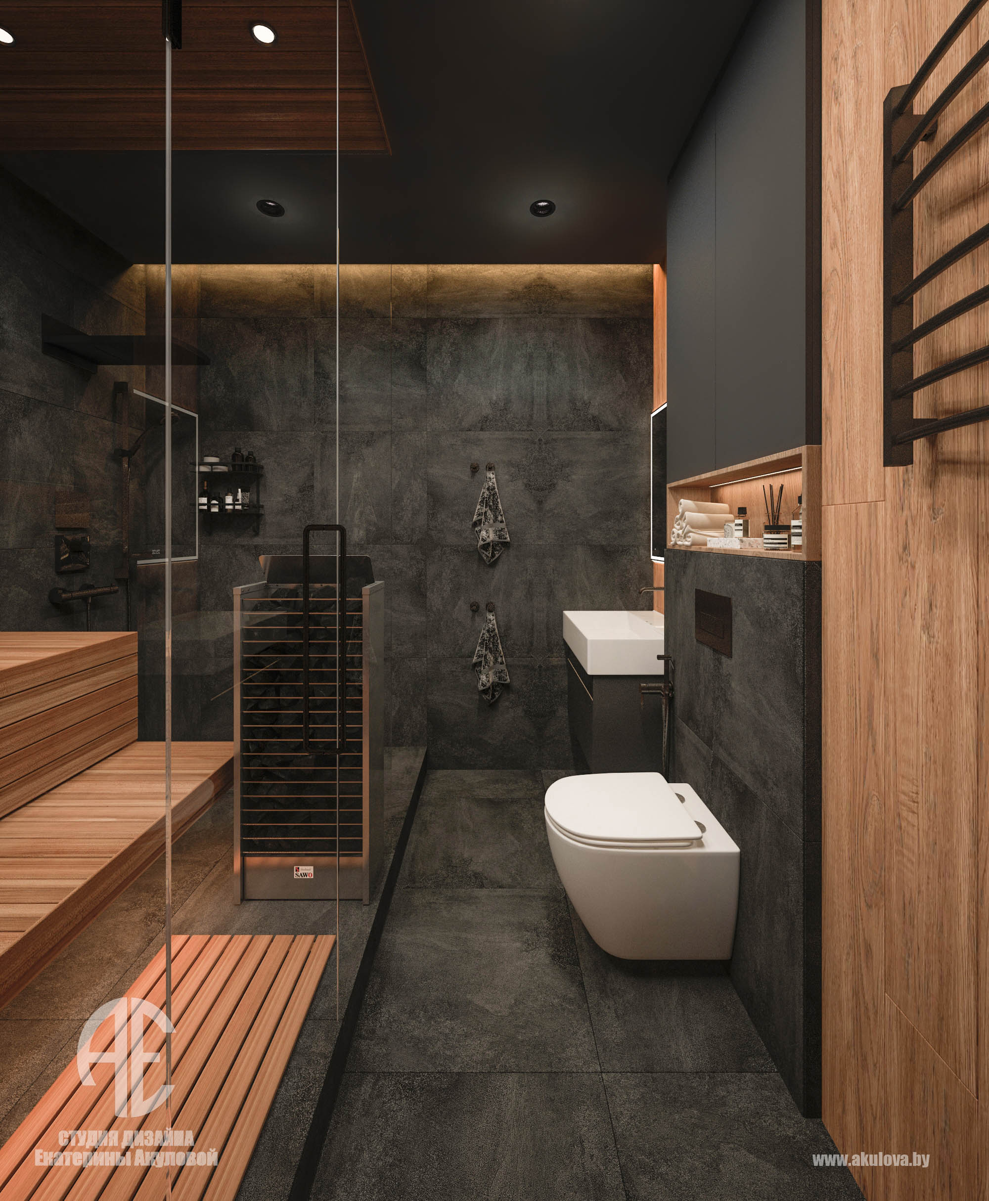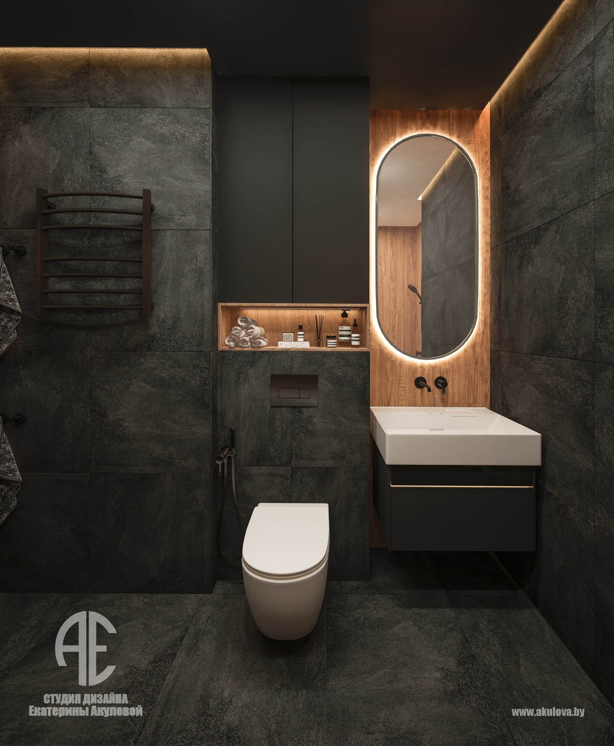 Совмещённый санузел выполнен в более контрастной стилистике с использованием текстур камня и дерева. Подвесная сантехника, встроенные модули и продуманное освещение подчёркивают современный характер пространства и обеспечивают удобство эксплуатации.