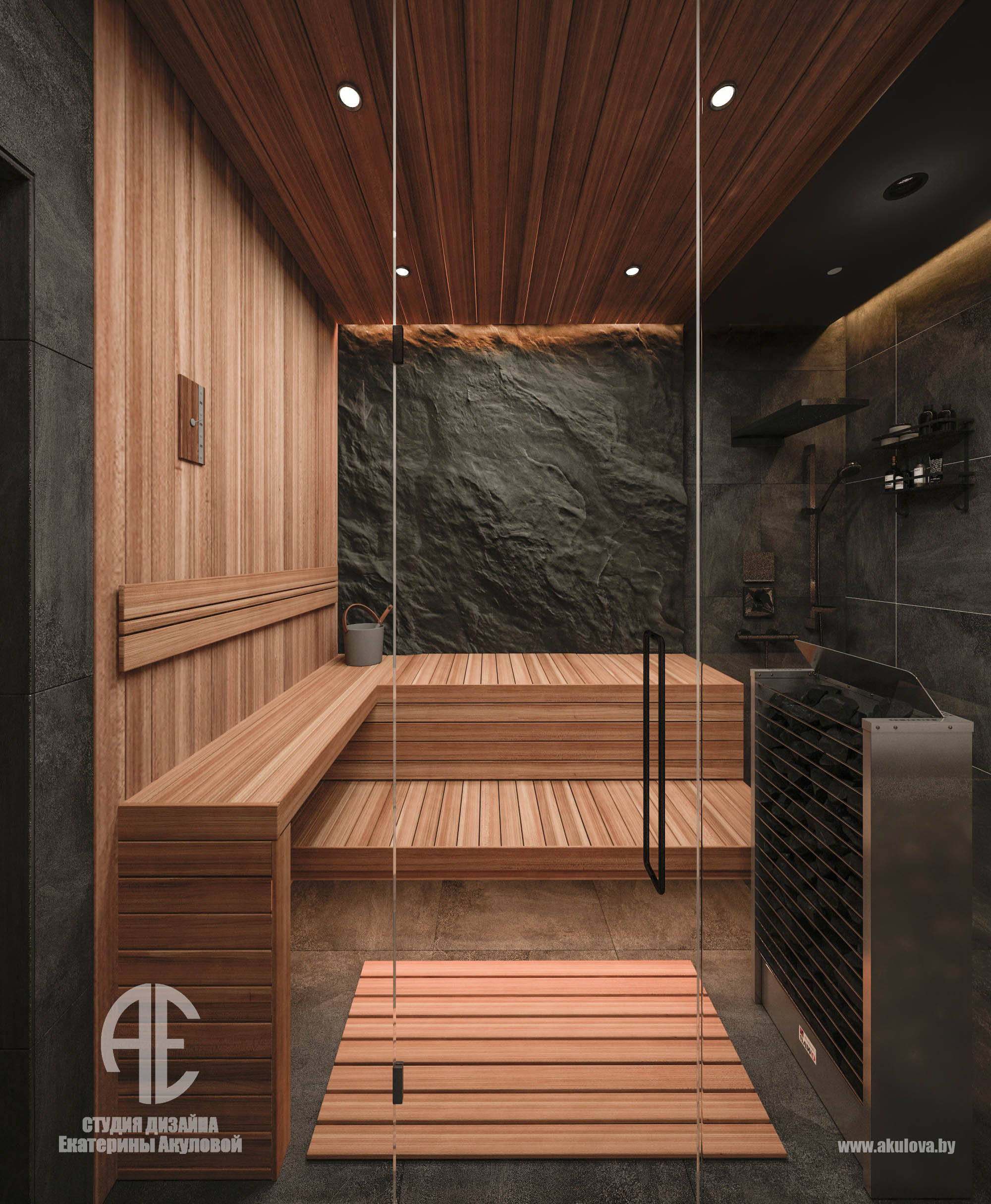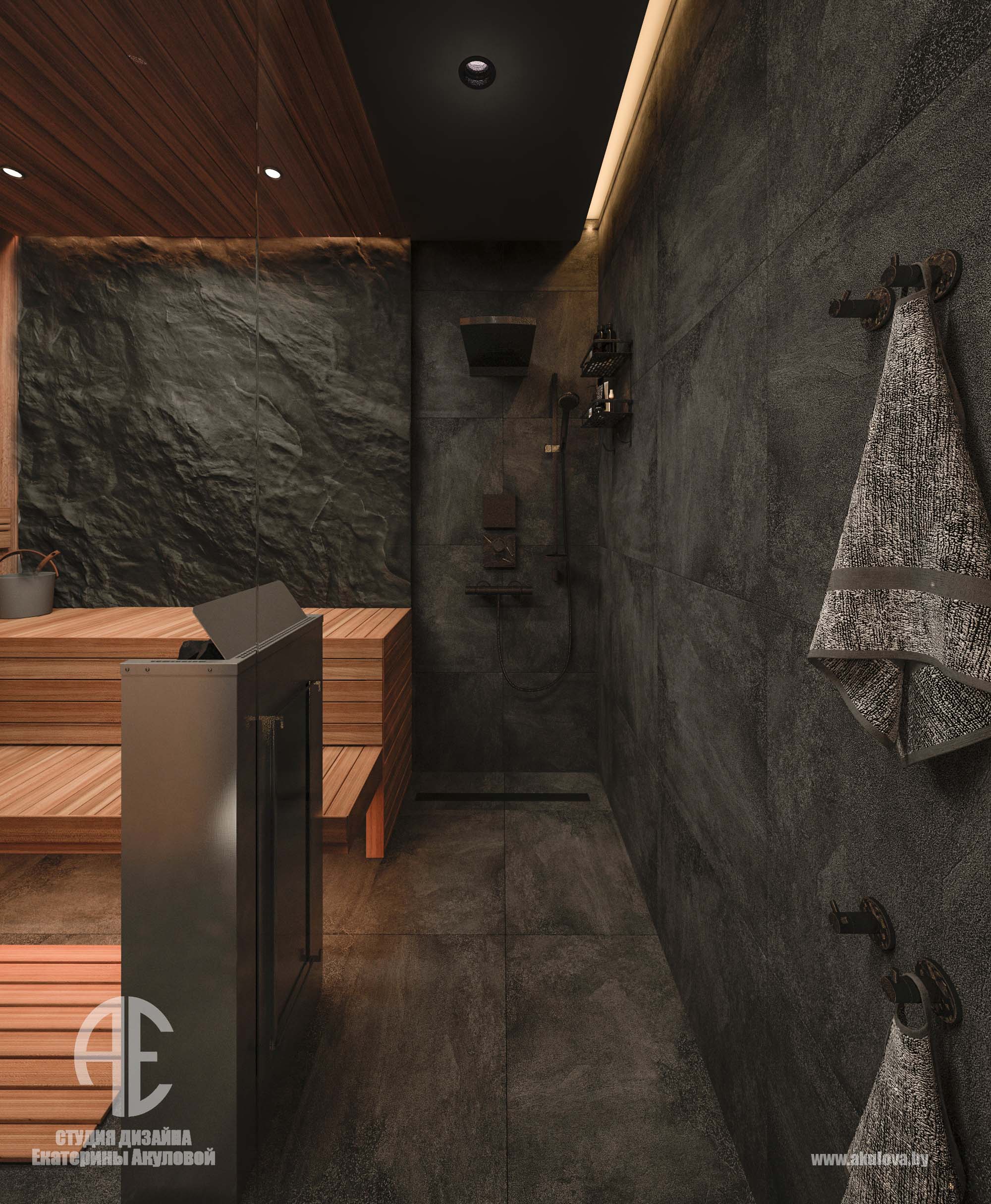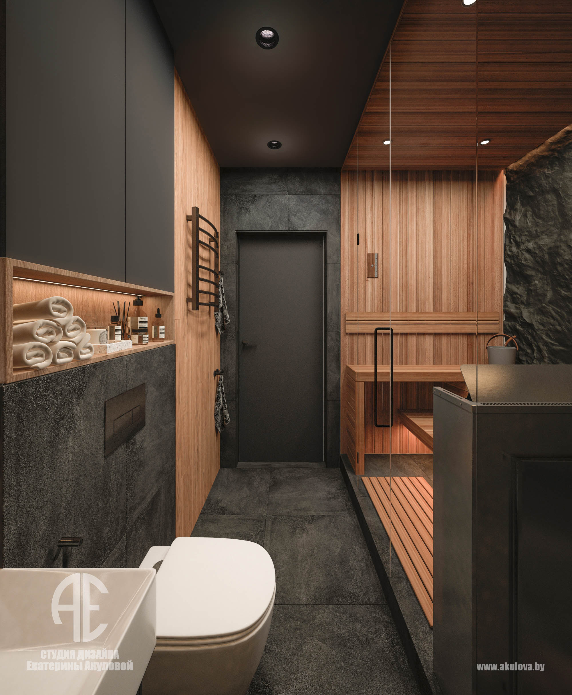 Совмещённый санузел выполнен в более контрастной стилистике с использованием текстур камня и дерева. Подвесная сантехника, встроенные модули и продуманное освещение подчёркивают современный характер пространства и обеспечивают удобство эксплуатации.