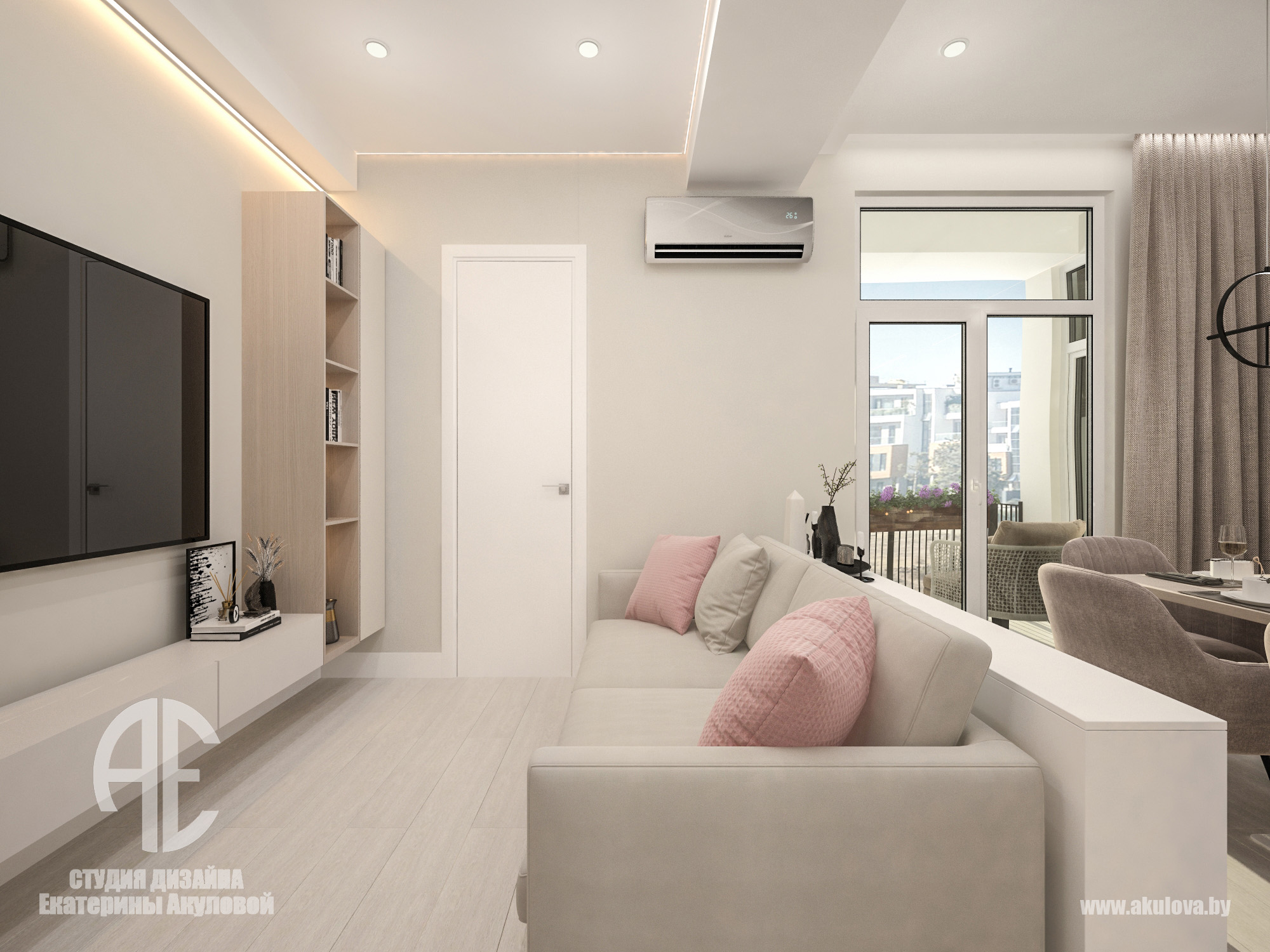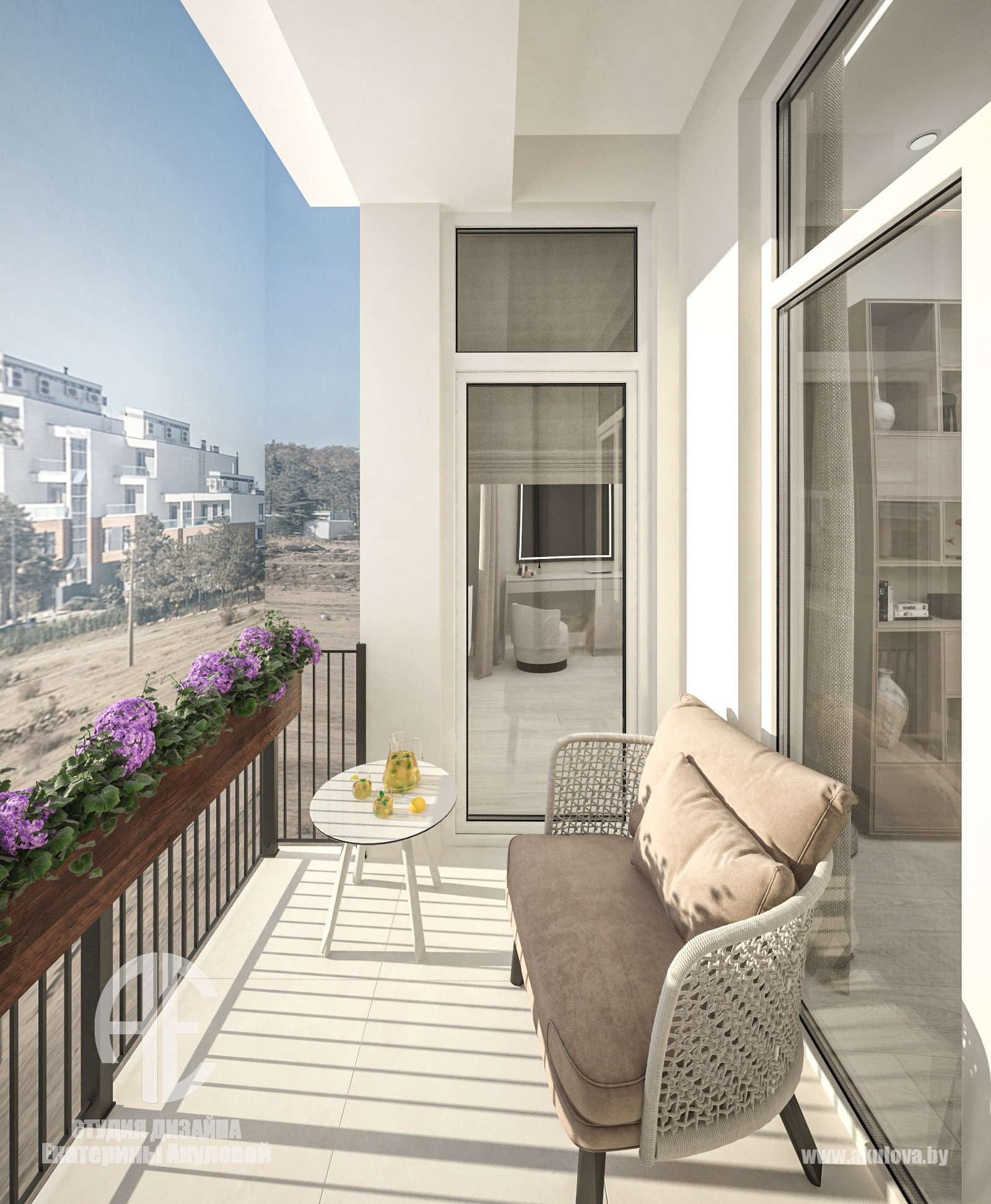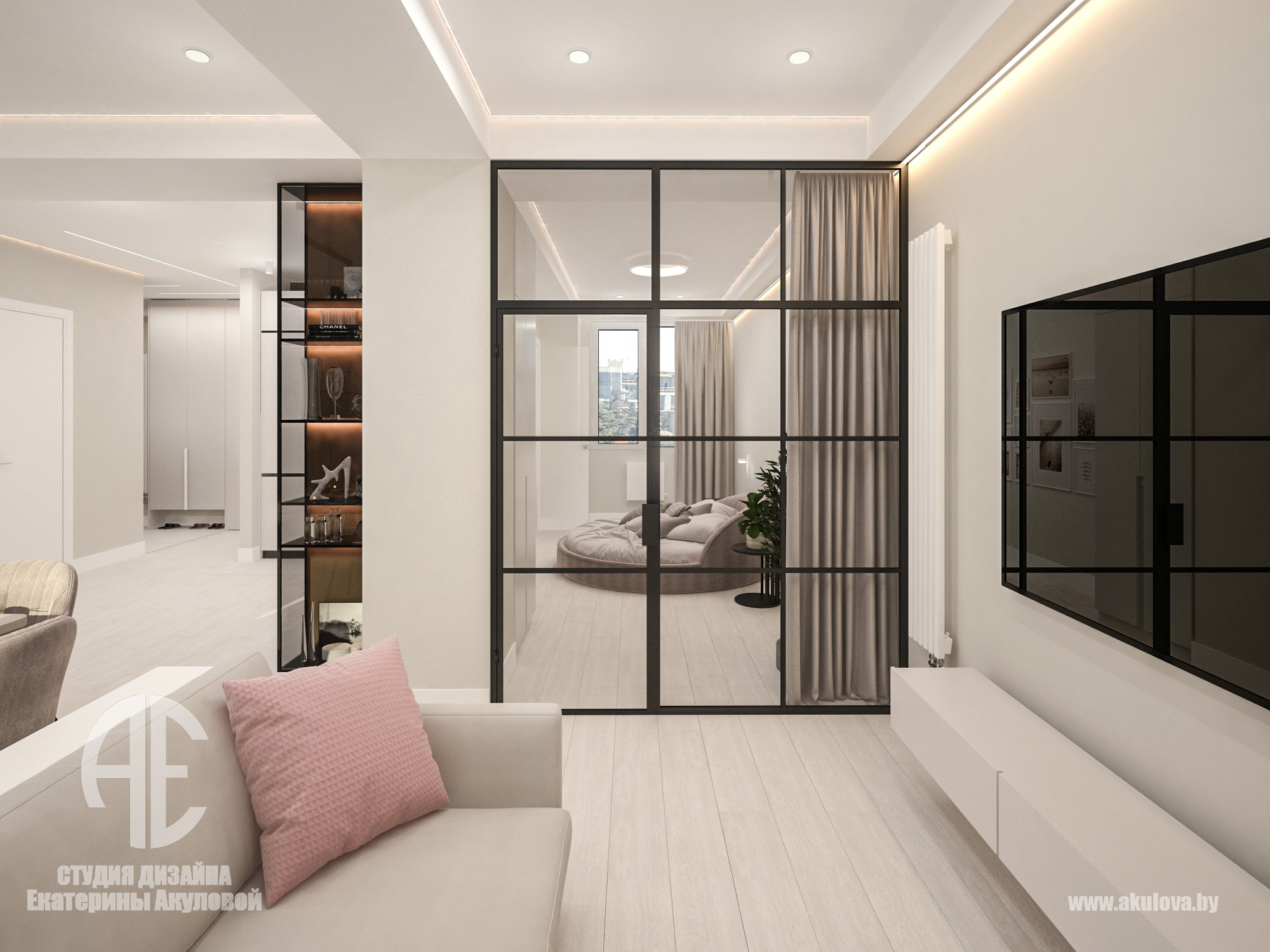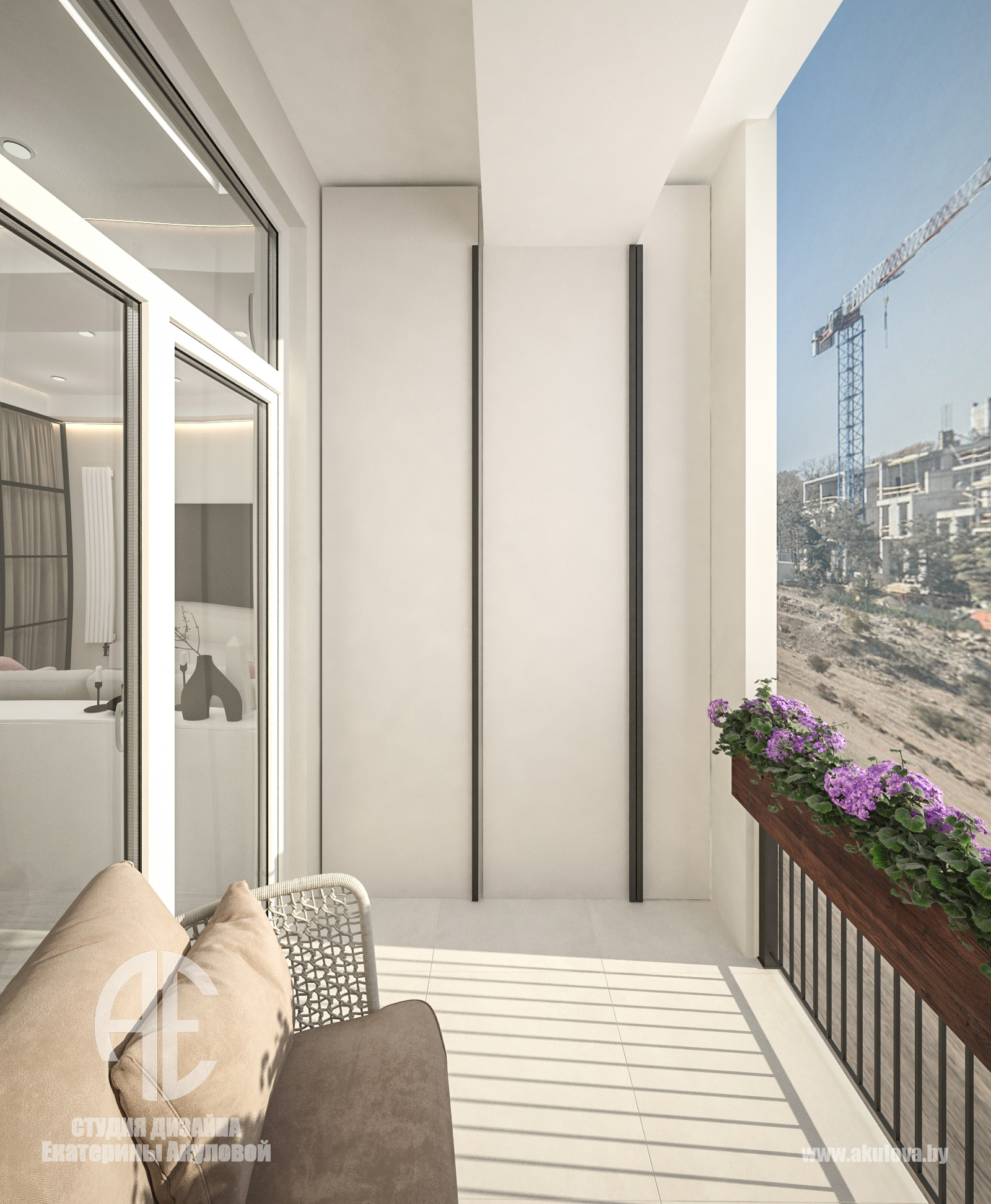 Дизайн интерьера квартиры выполнен в современном стиле в светлой гамме. Одной из задач для дизайнера являлось увеличение пространства, грамотное планирование необходимого функционала, а также декорирование несущих балок, расположенных на потолке по всему периметру квартиры. Увеличить пространство в общей зоне квартиры нам удалось за счет демонтажа стены и дальнейшей установки стеклянной перегородки между комнатами. По планированию функционала в квартире получилось выделить большую зону гостиной, совмещенной с кухней, спальню с отдельным выходом на балкон, гостевую комнату. Также удалось разместить дополнительные зоны хранения: гардеробная комната, две кладовые комнаты и совмещенный санузел. Балкон в квартире небольшой, но это не главное, поскольку даже небольшой балкон способен стать уютным и приблизить нас к природе. Здесь можно любоваться местными красотами солнечного города Тбилиси. В целом, получилась очень уютная и современная квартира, которая будет радовать своих новых хозяев.