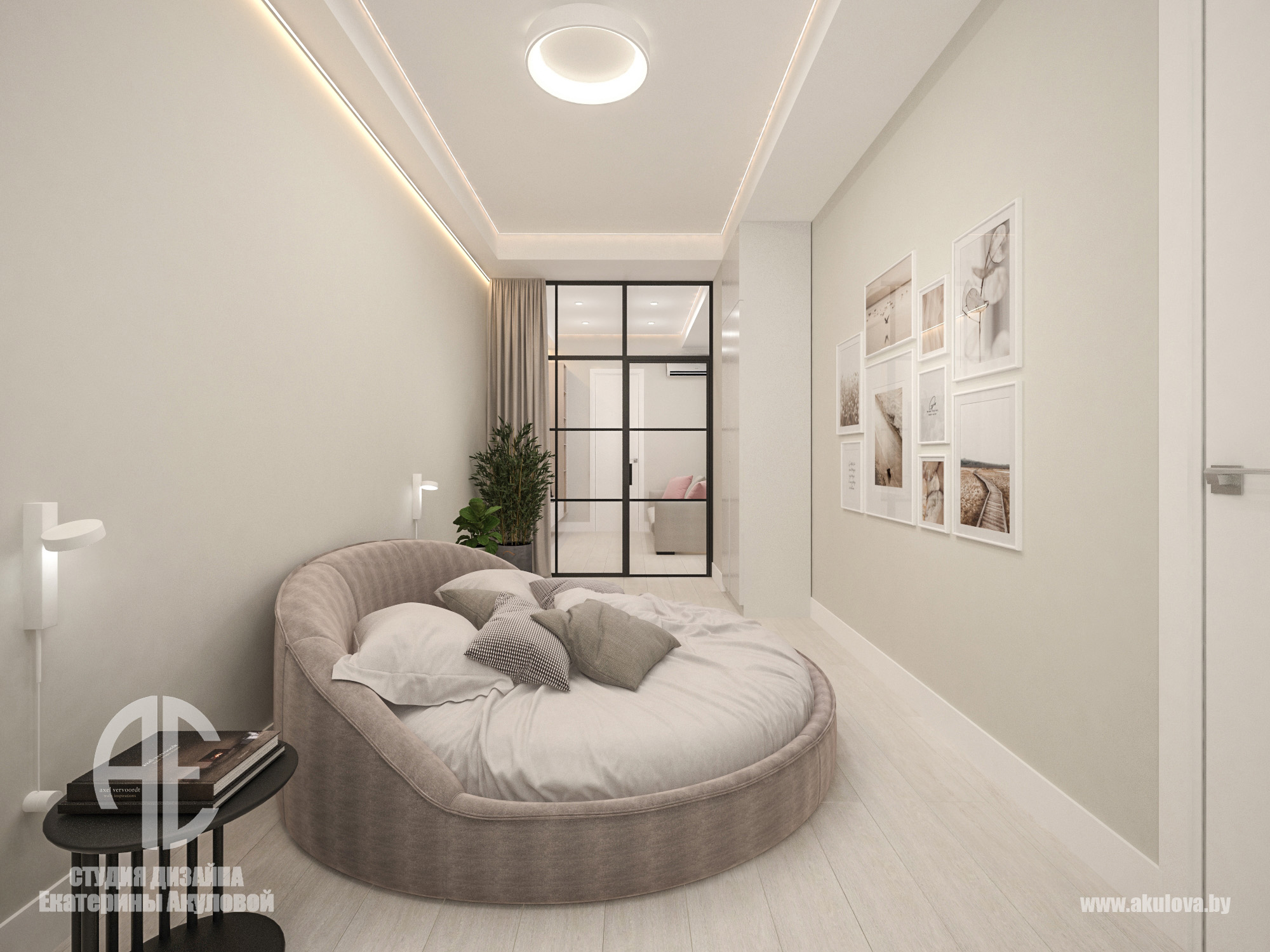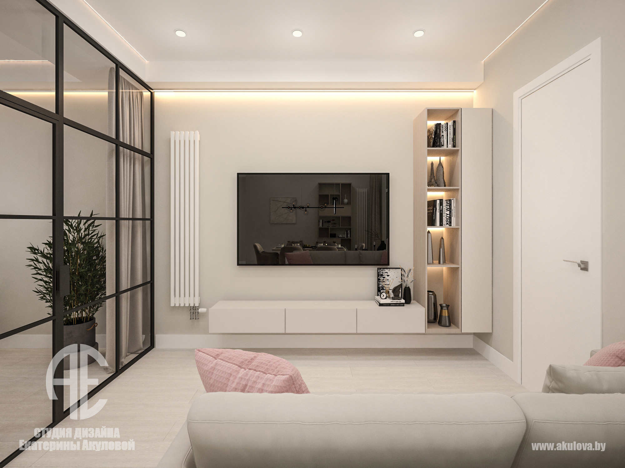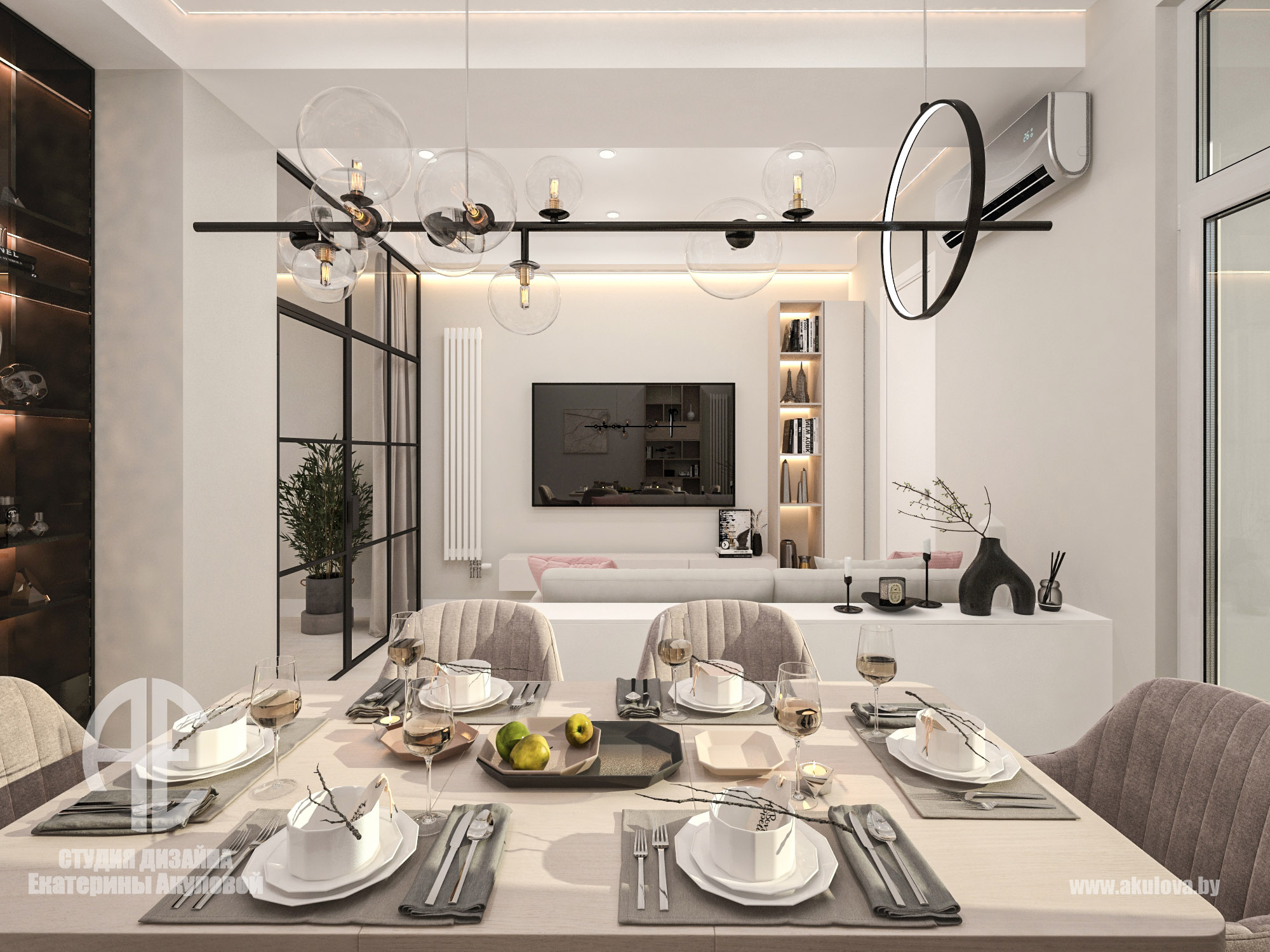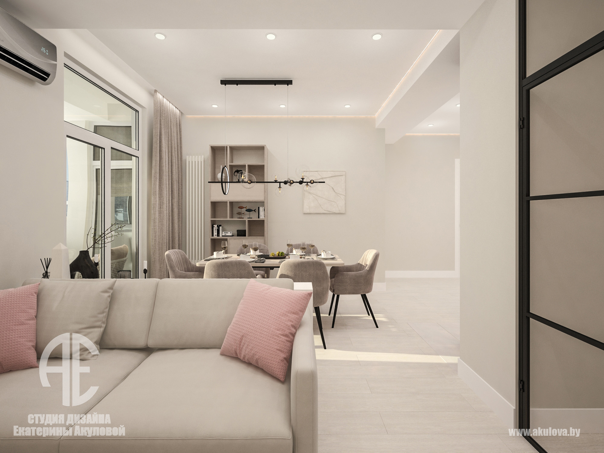 Дизайн интерьера квартиры выполнен в современном стиле в светлой гамме. Одной из задач для дизайнера являлось увеличение пространства, грамотное планирование необходимого функционала, а также декорирование несущих балок, расположенных на потолке по всему периметру квартиры. Увеличить пространство в общей зоне квартиры нам удалось за счет демонтажа стены и дальнейшей установки стеклянной перегородки между комнатами. По планированию функционала в квартире получилось выделить большую зону гостиной, совмещенной с кухней, спальню с отдельным выходом на балкон, гостевую комнату. Также удалось разместить дополнительные зоны хранения: гардеробная комната, две кладовые комнаты и совмещенный санузел. Балкон в квартире небольшой, но это не главное, поскольку даже небольшой балкон способен стать уютным и приблизить нас к природе. Здесь можно любоваться местными красотами солнечного города Тбилиси. В целом, получилась очень уютная и современная квартира, которая будет радовать своих новых хозяев.