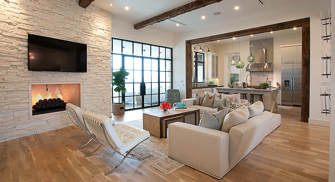 На вашем здании. Вы уже слышали о западном стиле «лофт», когда приобретается старое здание любого назначения и переделывается в жилой дом с сохранением изначального вида? Такой стиль позволяет существенно сэкономить, но не во всех случаях. Что делать, если у вас уже куплен деревянный дом? Радоваться. Оформление такого дома – самый недорогой вариант, если вы не решите спрятать деревянные стены. В дизайн интерьера дома из кирпича можно добавить игру с текстурой: где-то оставить кирпичную кладку, где-то сделать стены гладкими.